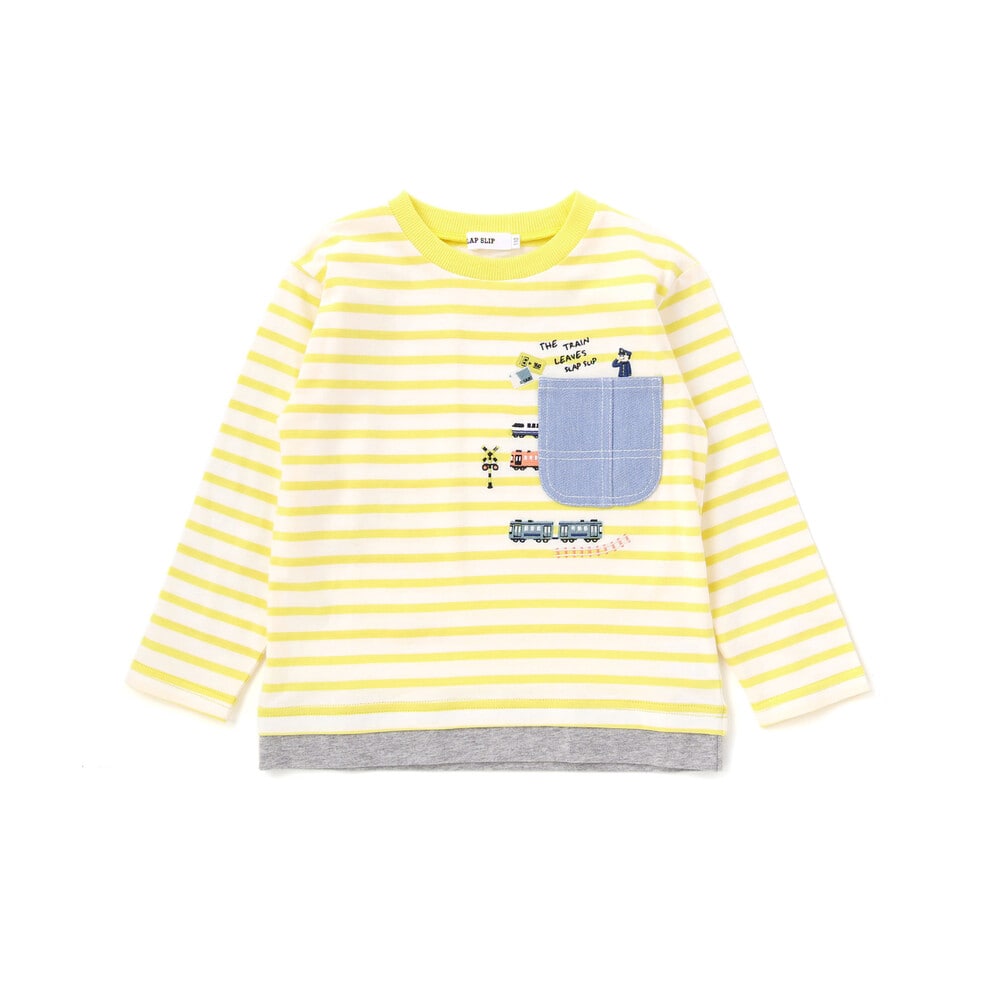 イエロー系はストライプ柄の身生地に無地のレイヤードを合わせ、電車や切符、働く車掌さんの様子を刺しゅうで描いた、ストーリー性のある一枚に仕上げました。