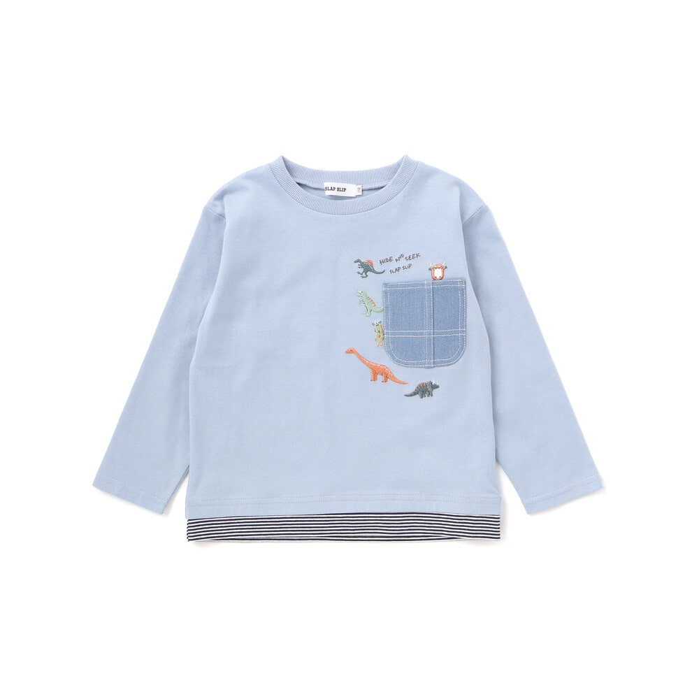 ブルーは無地の身生地にボーダーのレイヤードを組み合わせ、胸元のデニムポケットには、かくれんぼに夢中の恐竜を刺しゅうで表現した遊び心のあるデザイン。
