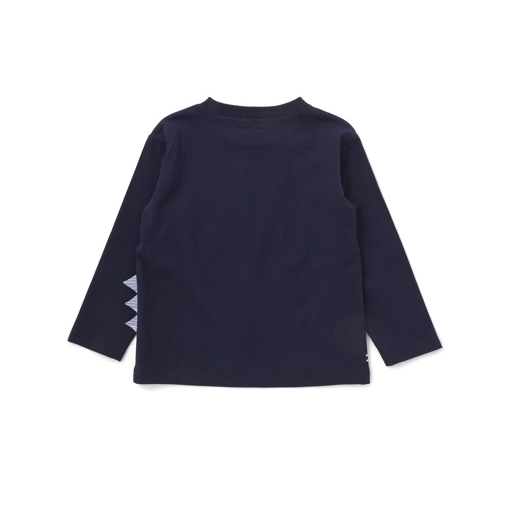 電車に乗ってお出かけしている恐竜たちのプリントが可愛らしい、男の子用長袖Tシャツ。