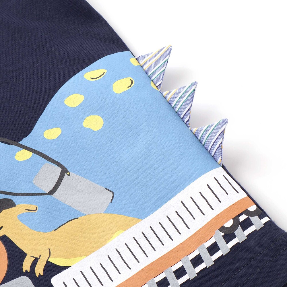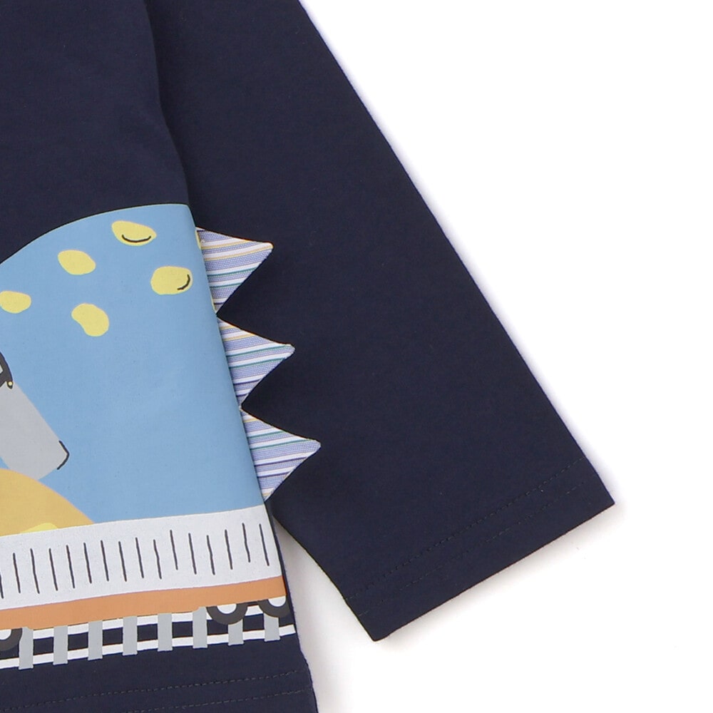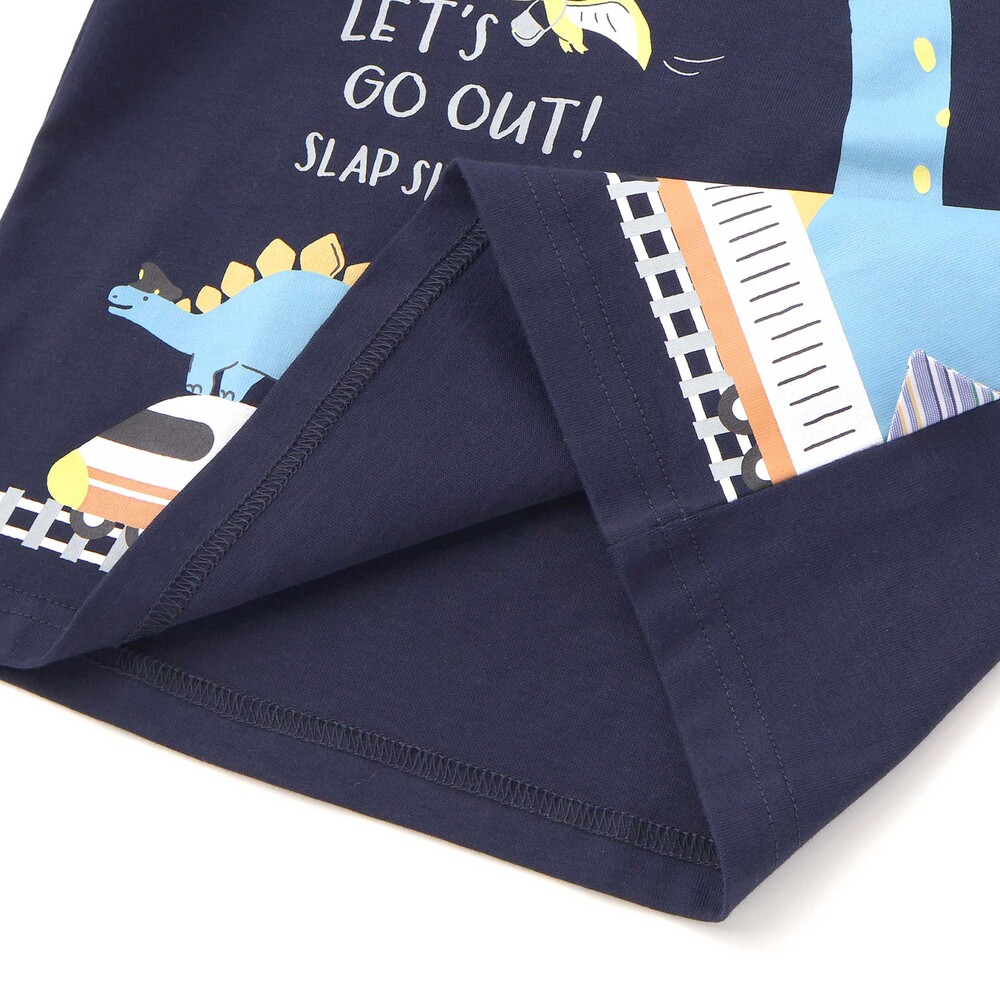 楽しそうに電車に乗る恐竜たちのデザインが、着るだけでわくわくする一枚に仕上がっています。