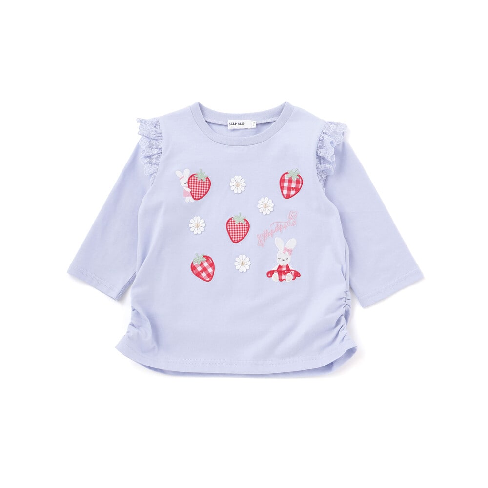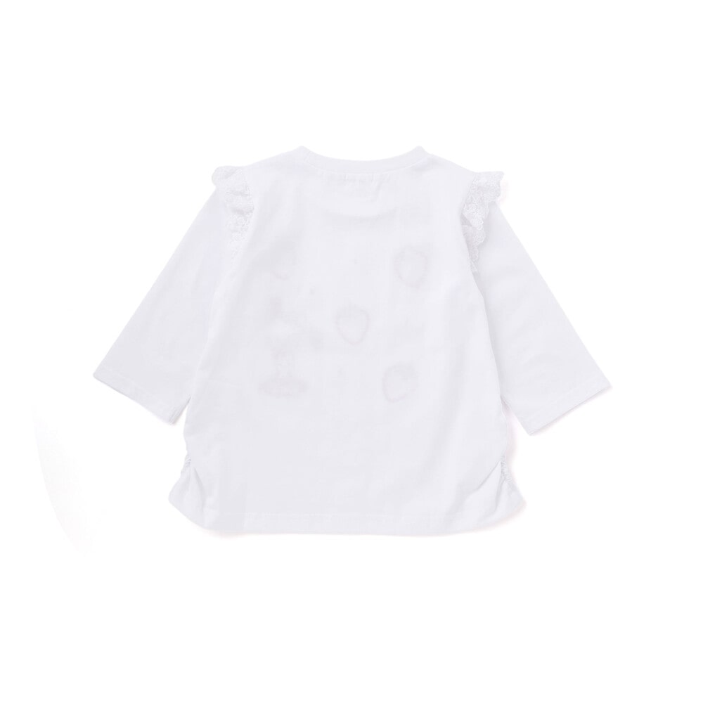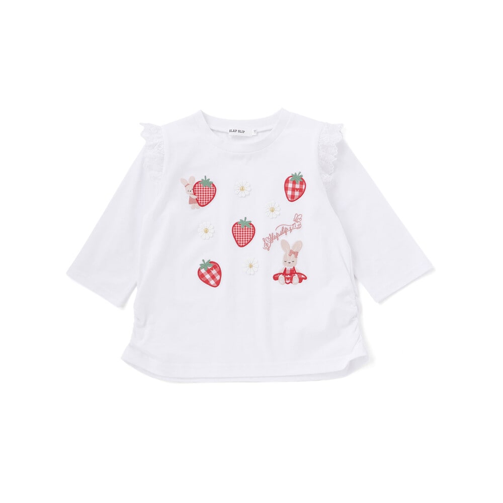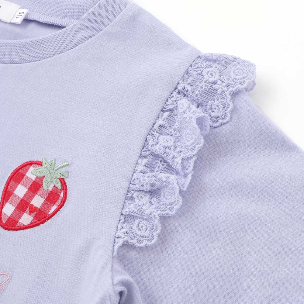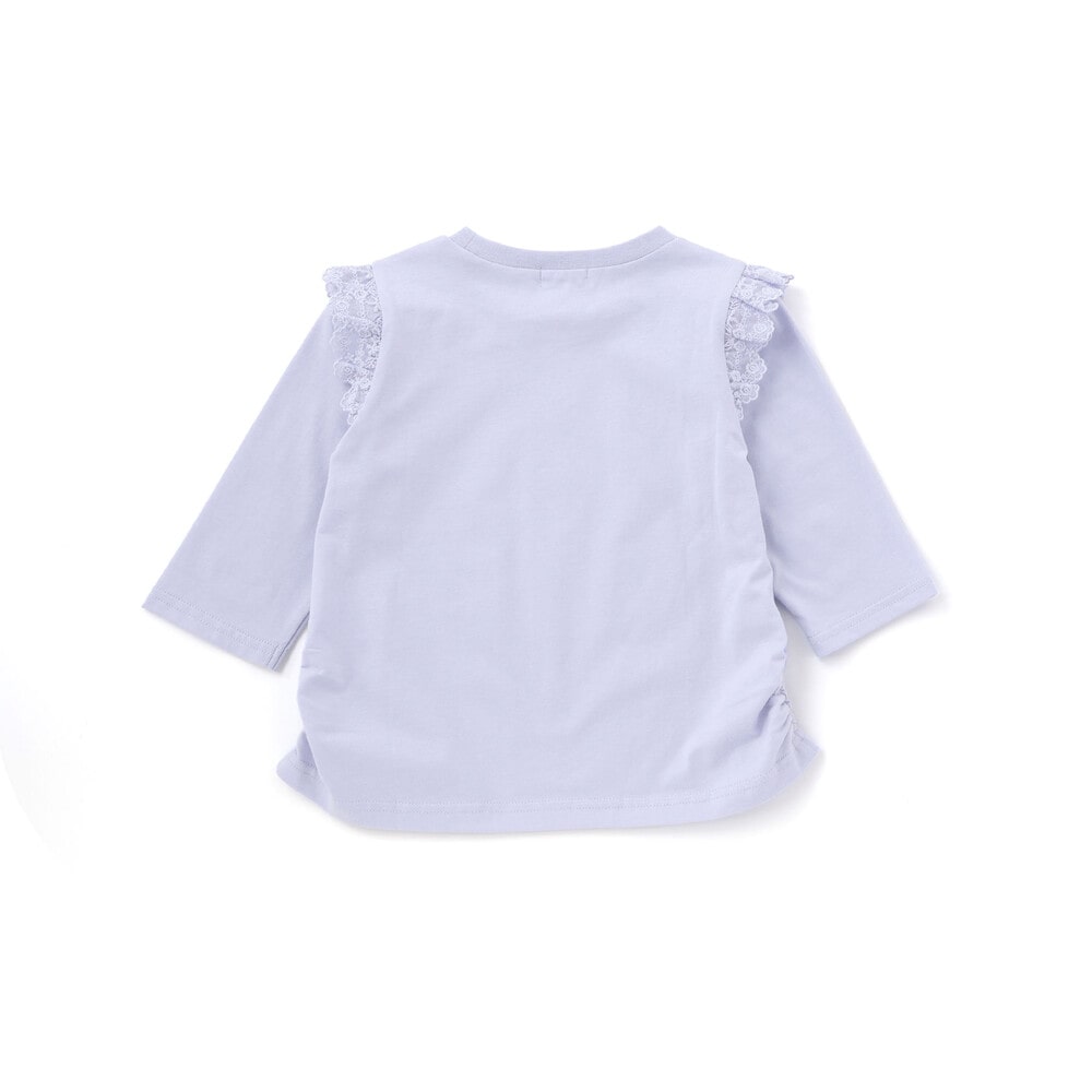 肩にあしらわれたフリルが可愛らしい印象を添える、女の子用7分丈Tシャツ。