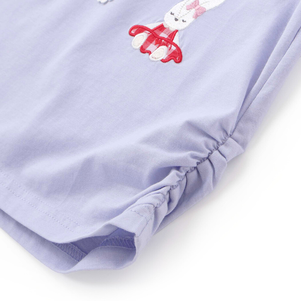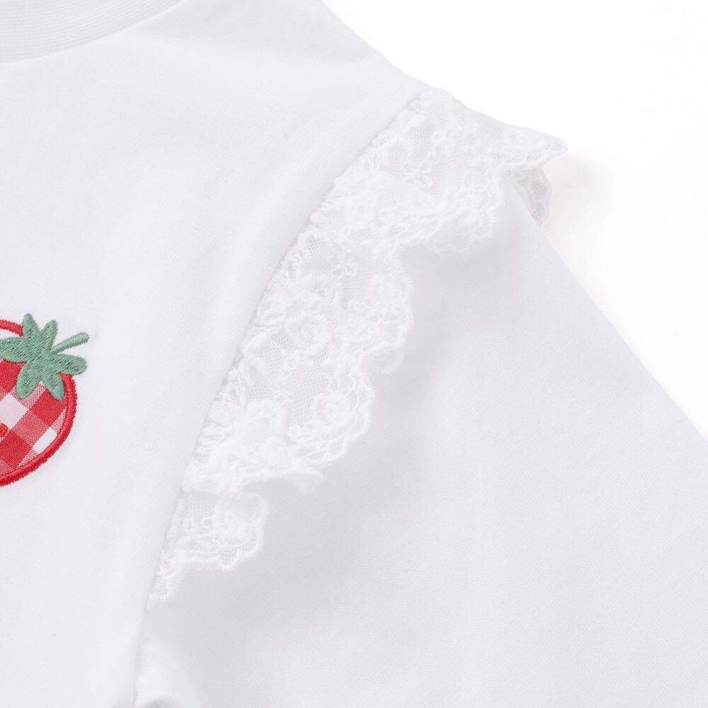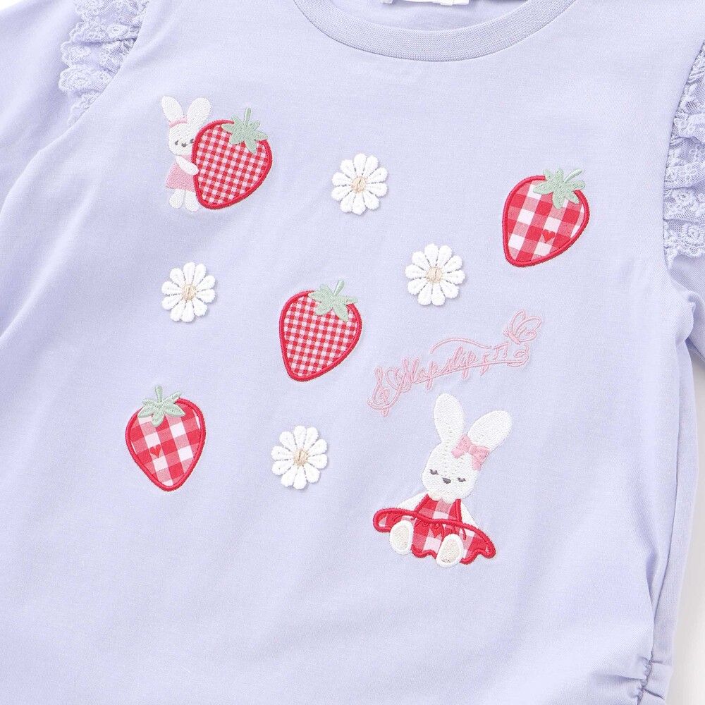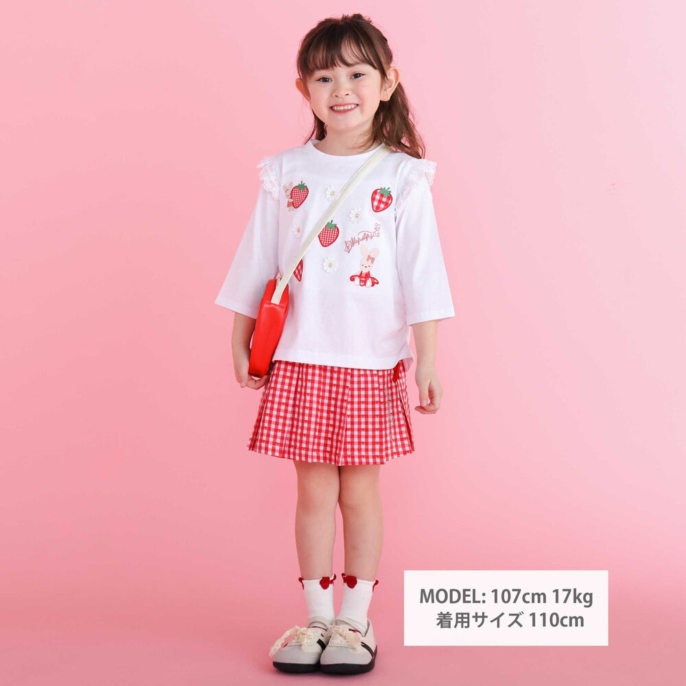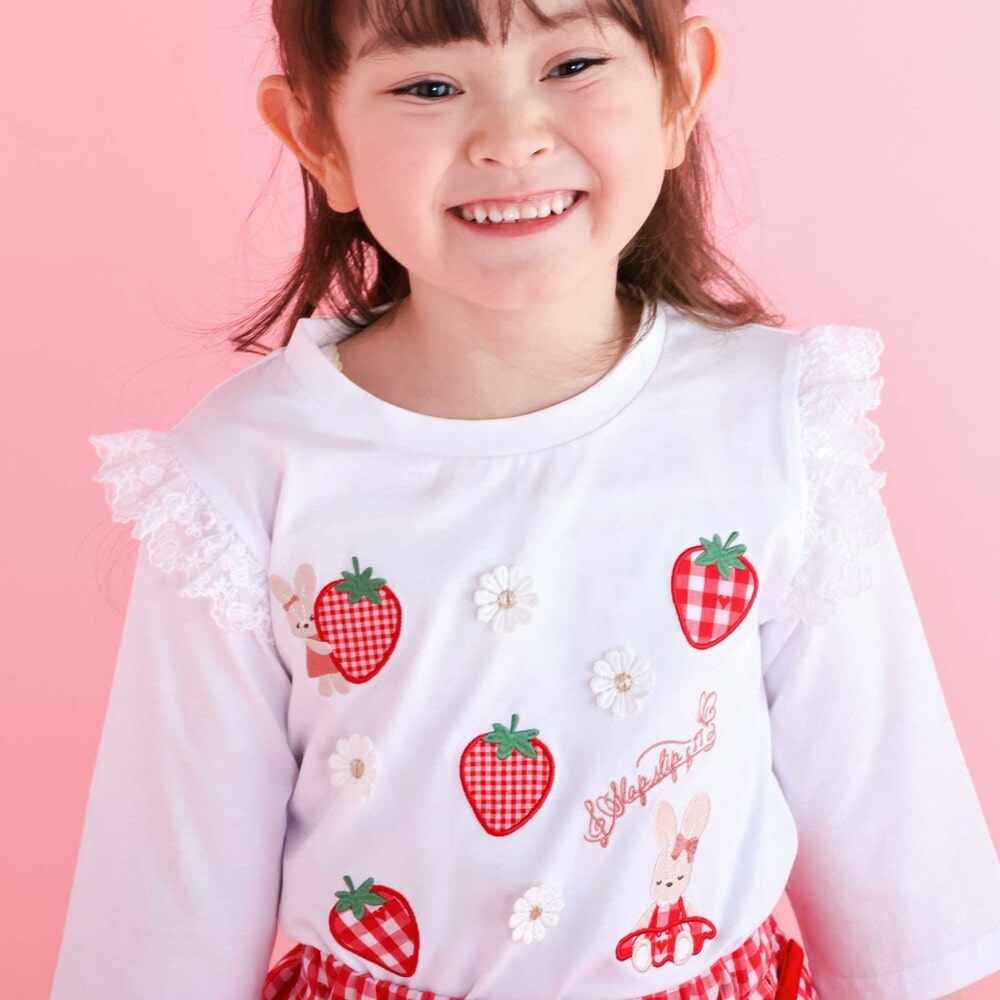 肩にあしらわれたフリルが可愛らしい印象を添える、女の子用7分丈Tシャツ。