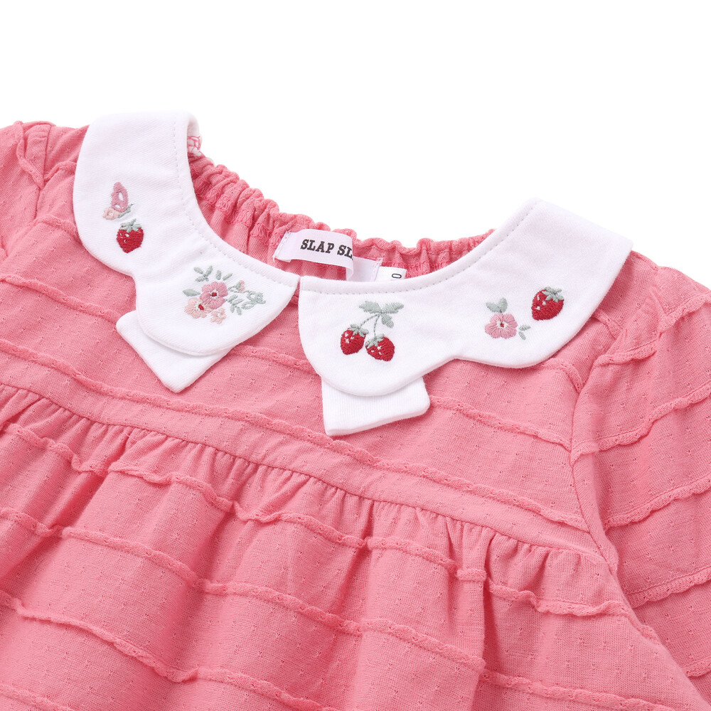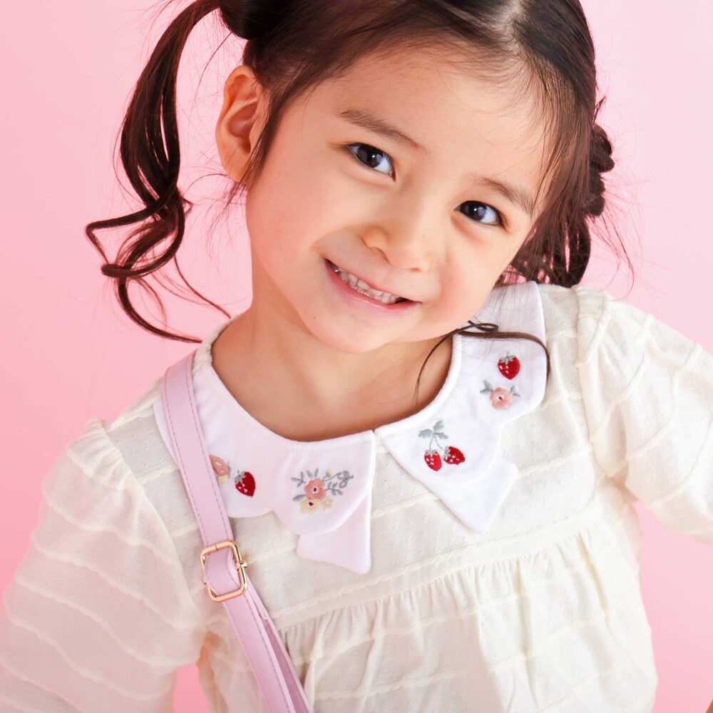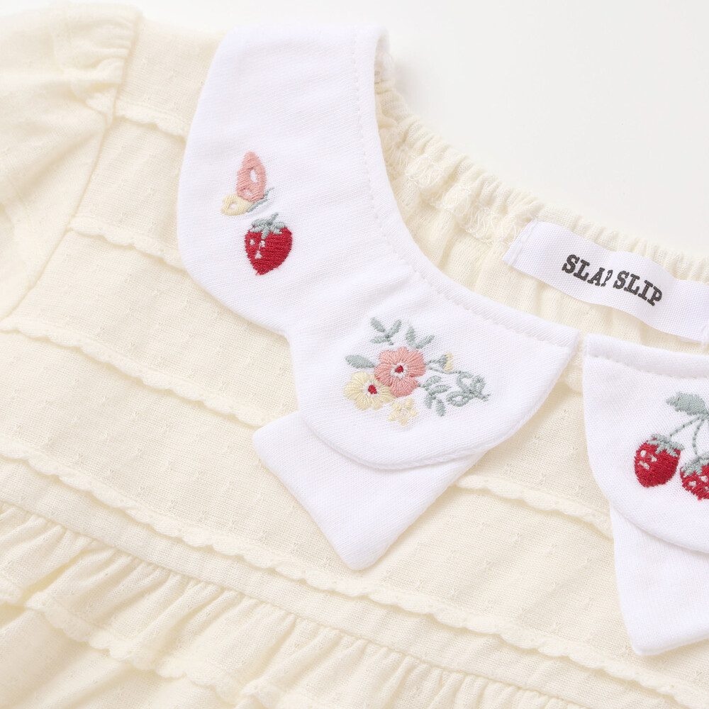 丸みのあるスカラップ襟には、お花やイチゴ、蝶々の刺しゅうが丁寧に施され、可愛らしさがぐっと引き立ちます。