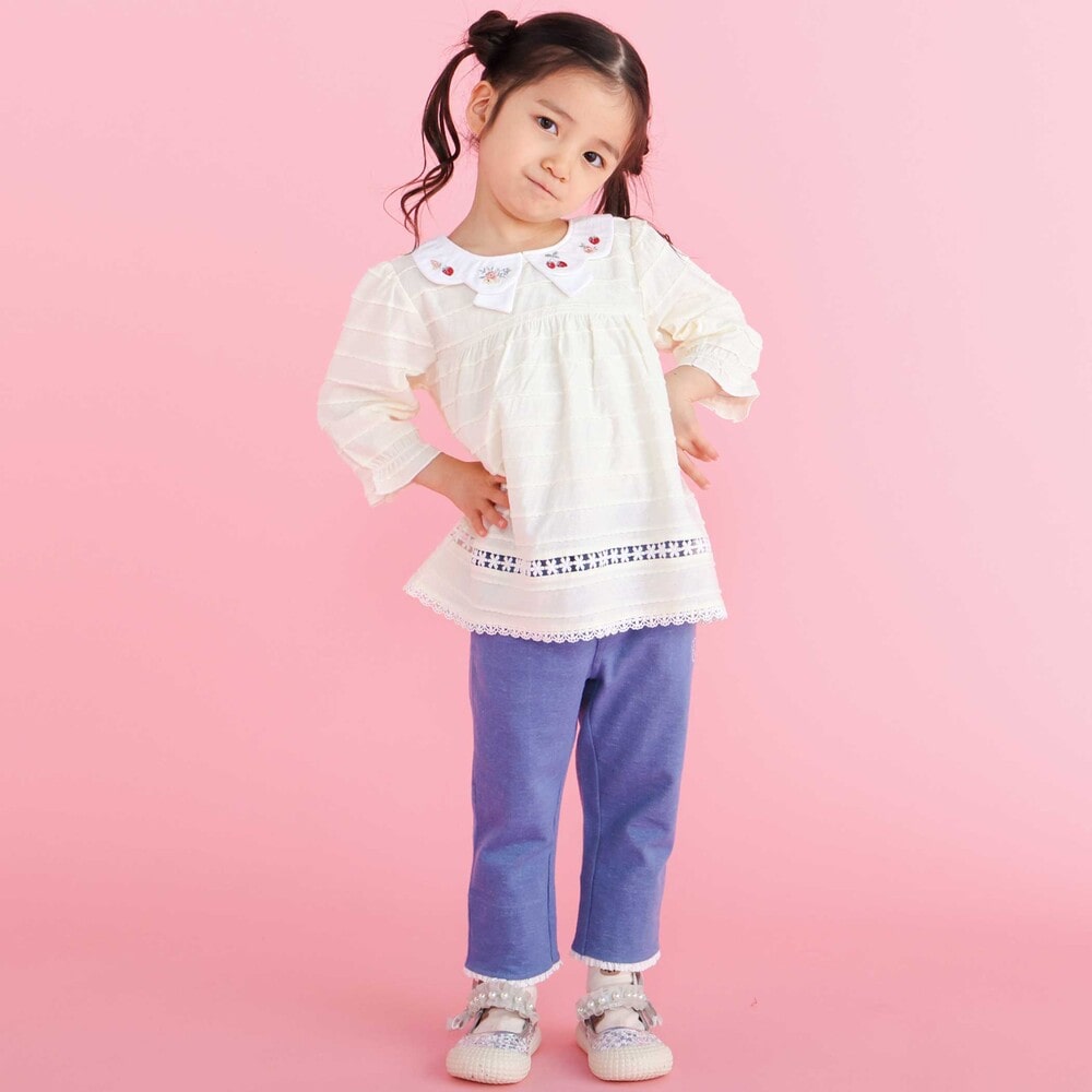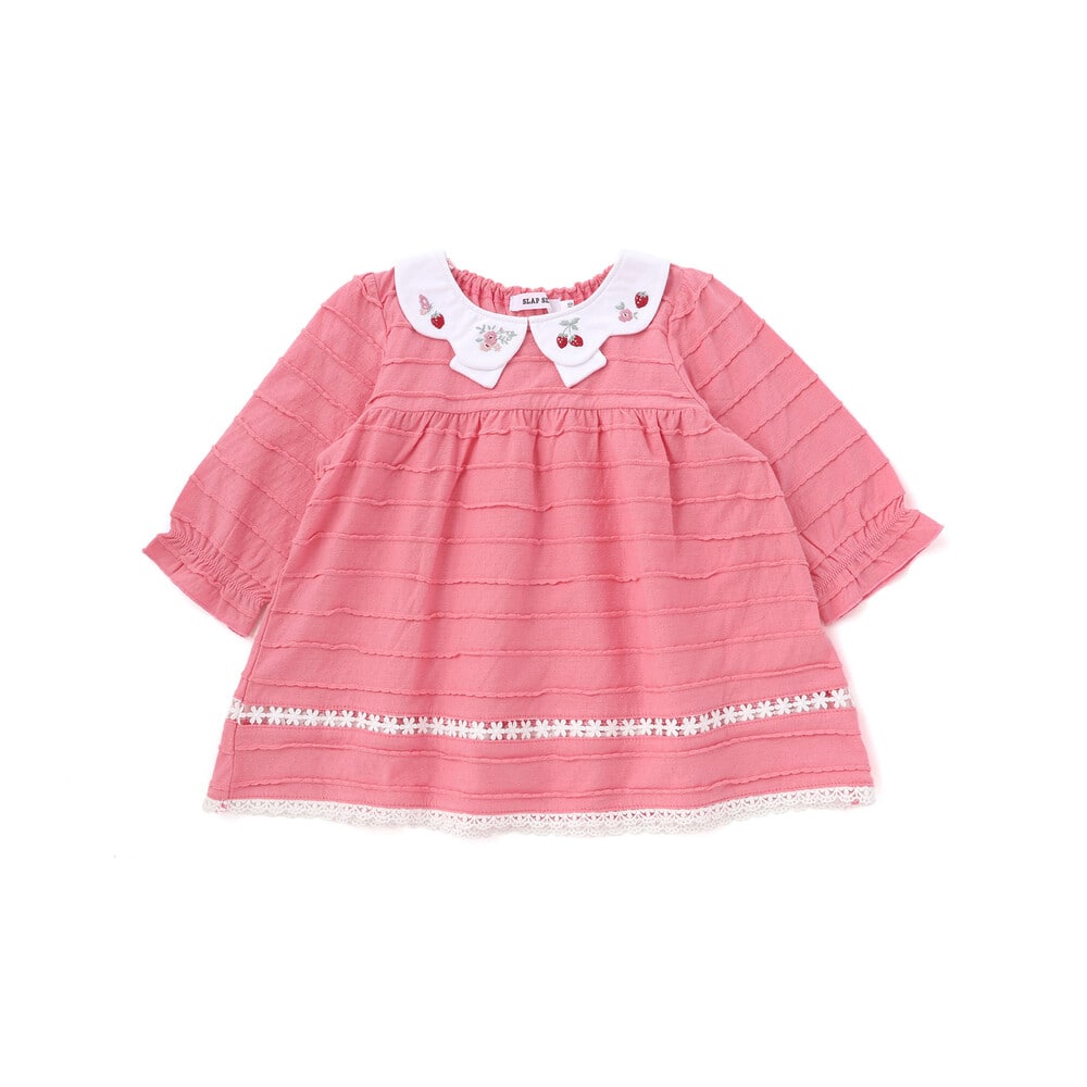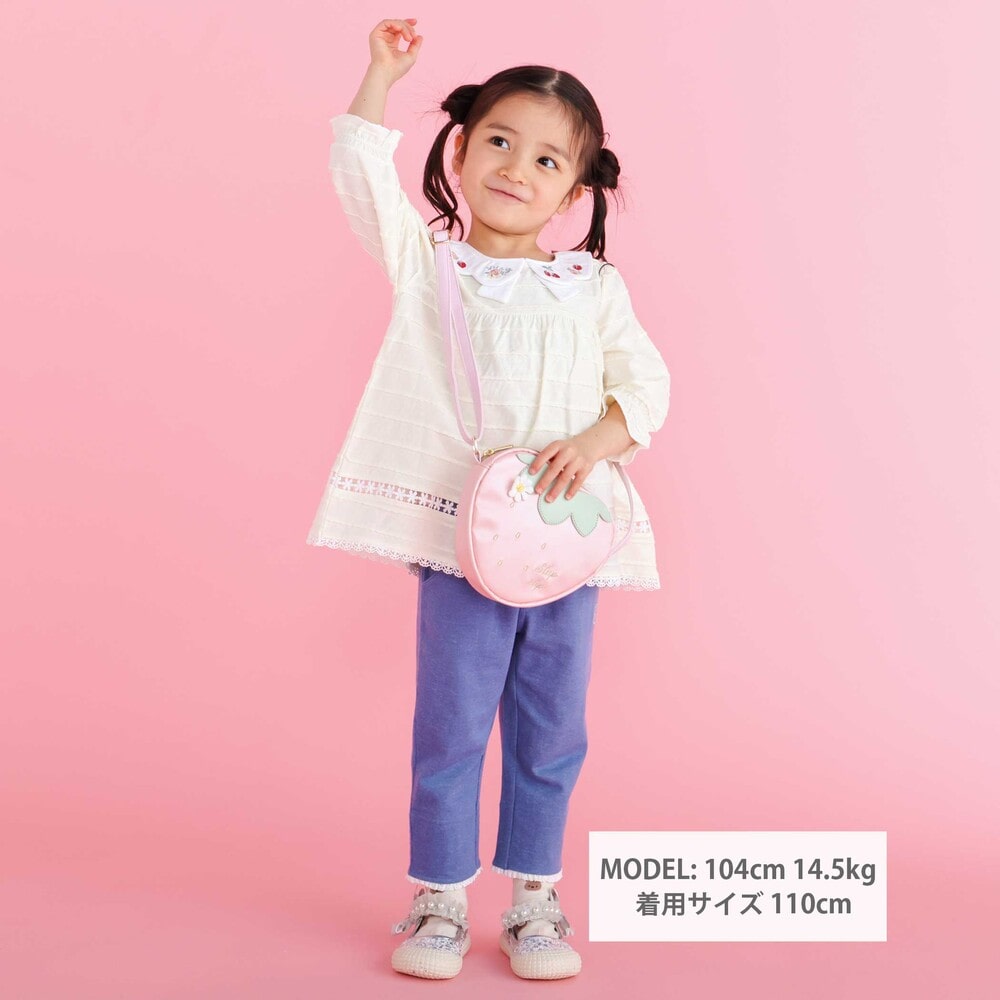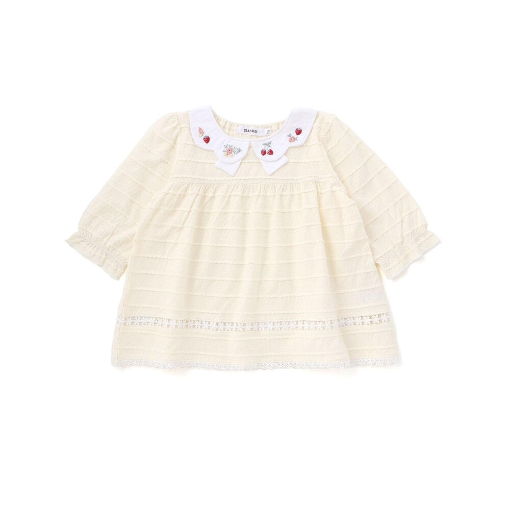 丸みのあるスカラップ襟には、お花やイチゴ、蝶々の刺しゅうが丁寧に施され、可愛らしさがぐっと引き立ちます。