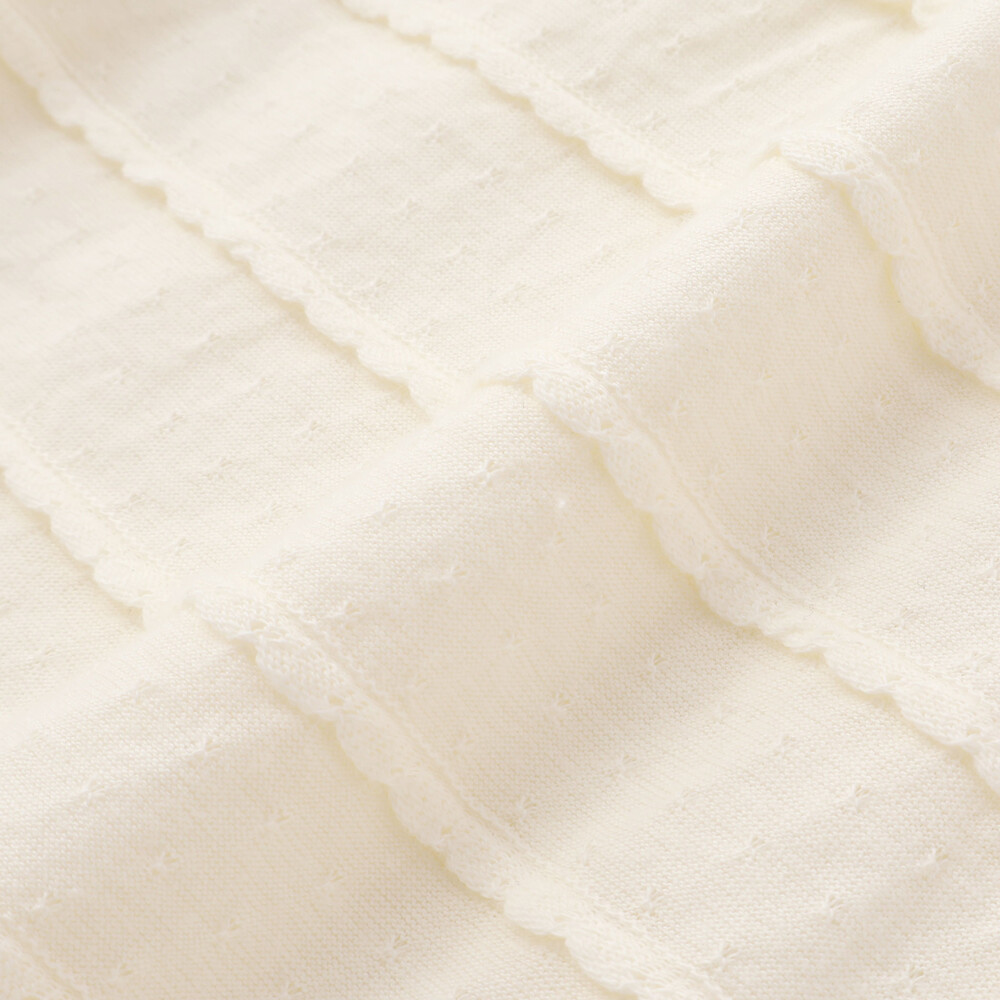 身生地にはやわらかな肌触りが魅力のレーシー天竺を使用し、襟部分は天竺素材で仕上げているため、快適な着心地と程よい伸縮性を兼ね備えています。
