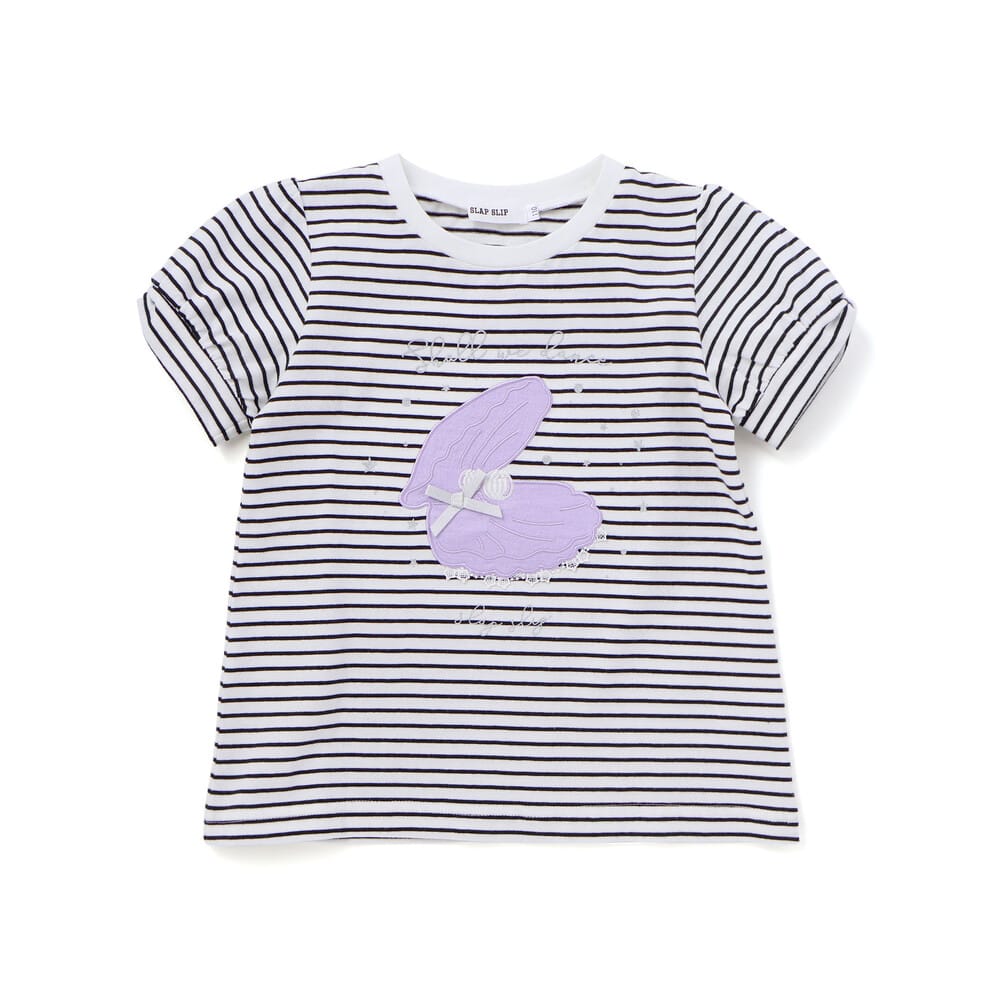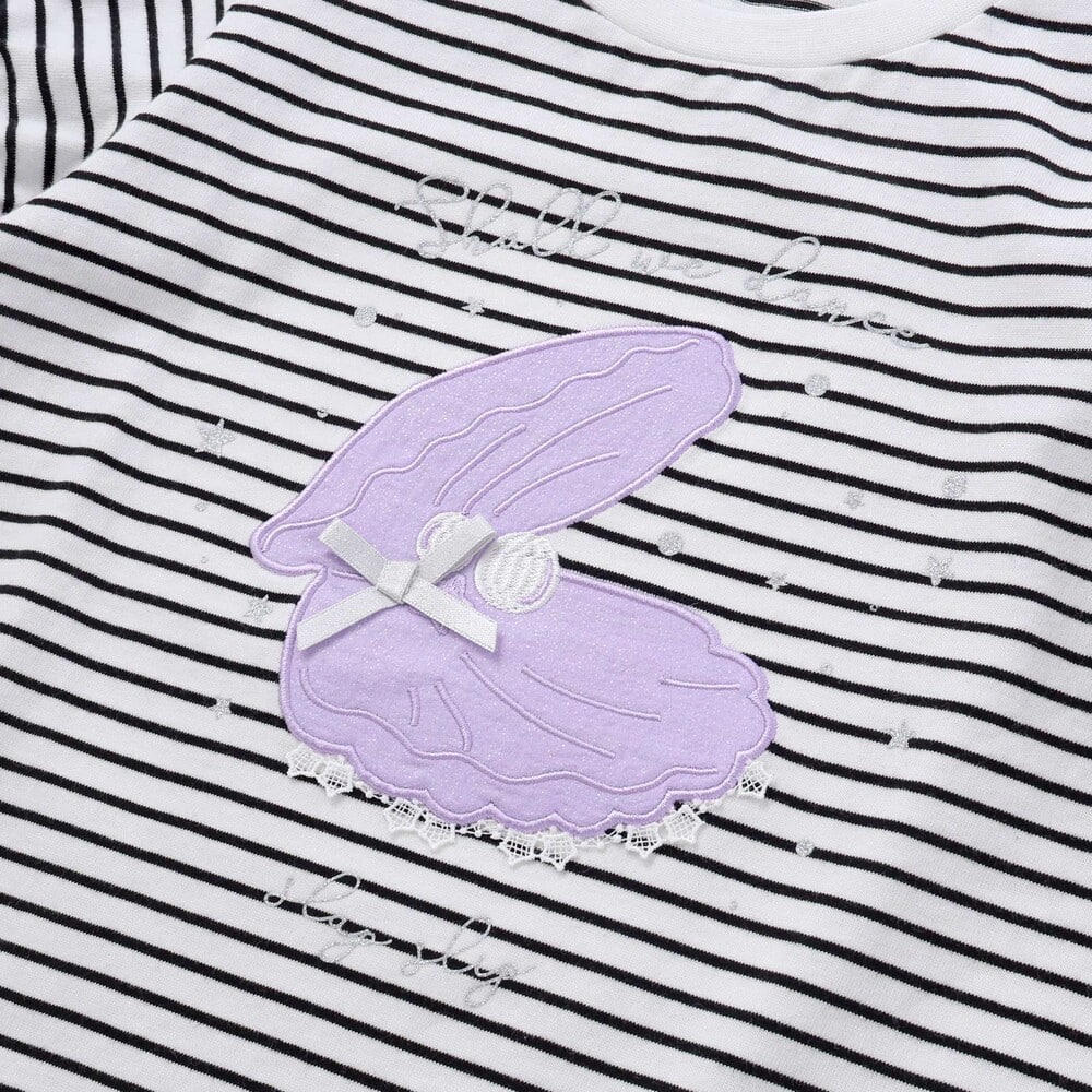 ブラック系は、ボーダー柄をベースに、キラキラ生地を使った貝殻のモチーフが映えるデザイン。