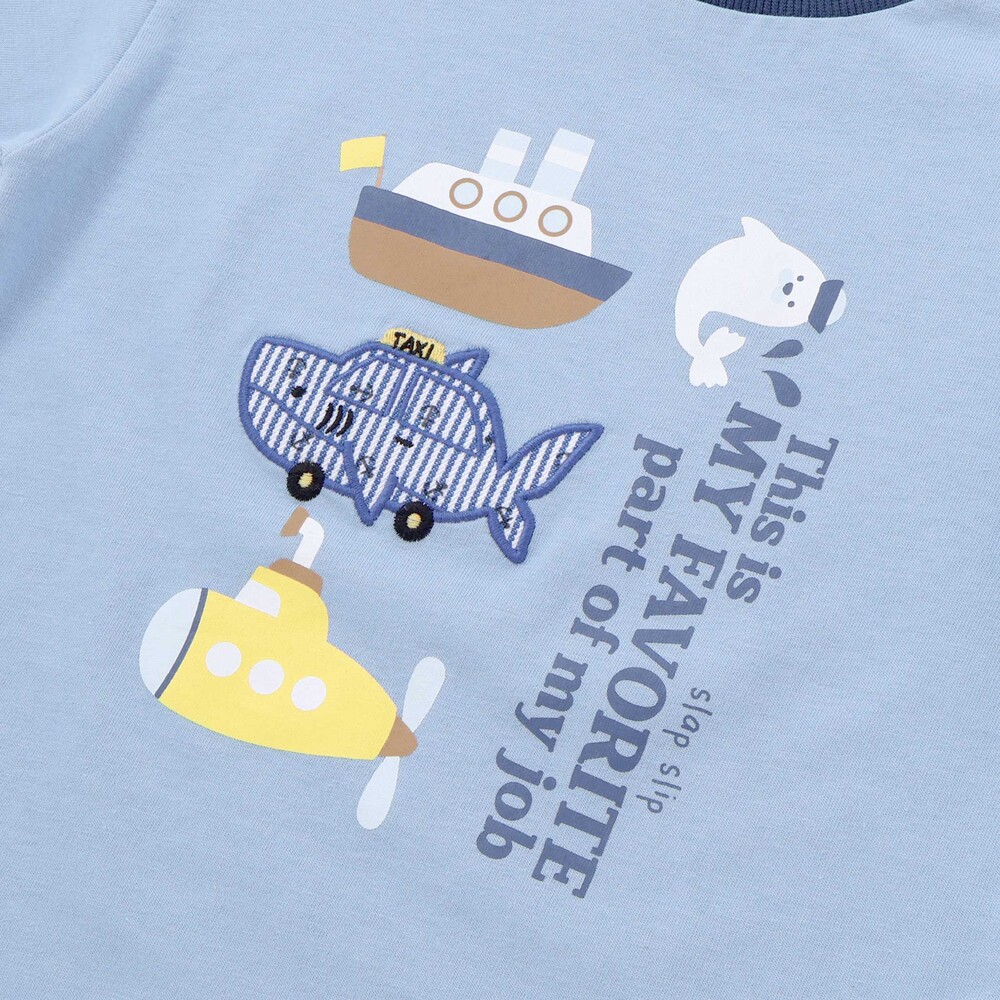 ブルーは、オットセイの乗組員が登場し、サメ型タクシーのパッチ刺しゅうや潜水艦、船のプリントが海の冒険気分を盛り上げます。