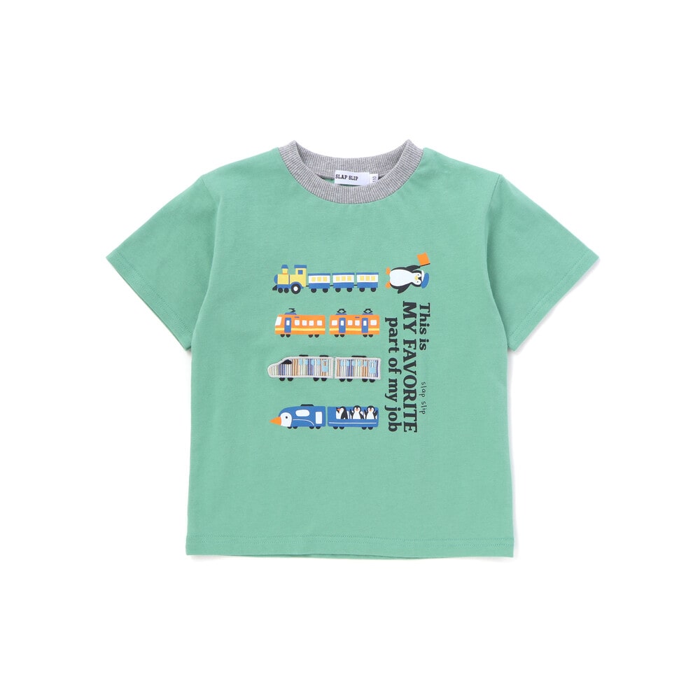 グリーンは、ペンギンの車掌さんと、ずらりと並んださまざまな電車たちが電車好きの心をくすぐる1枚。