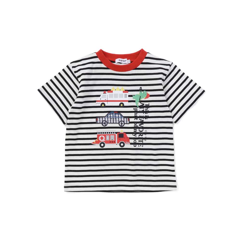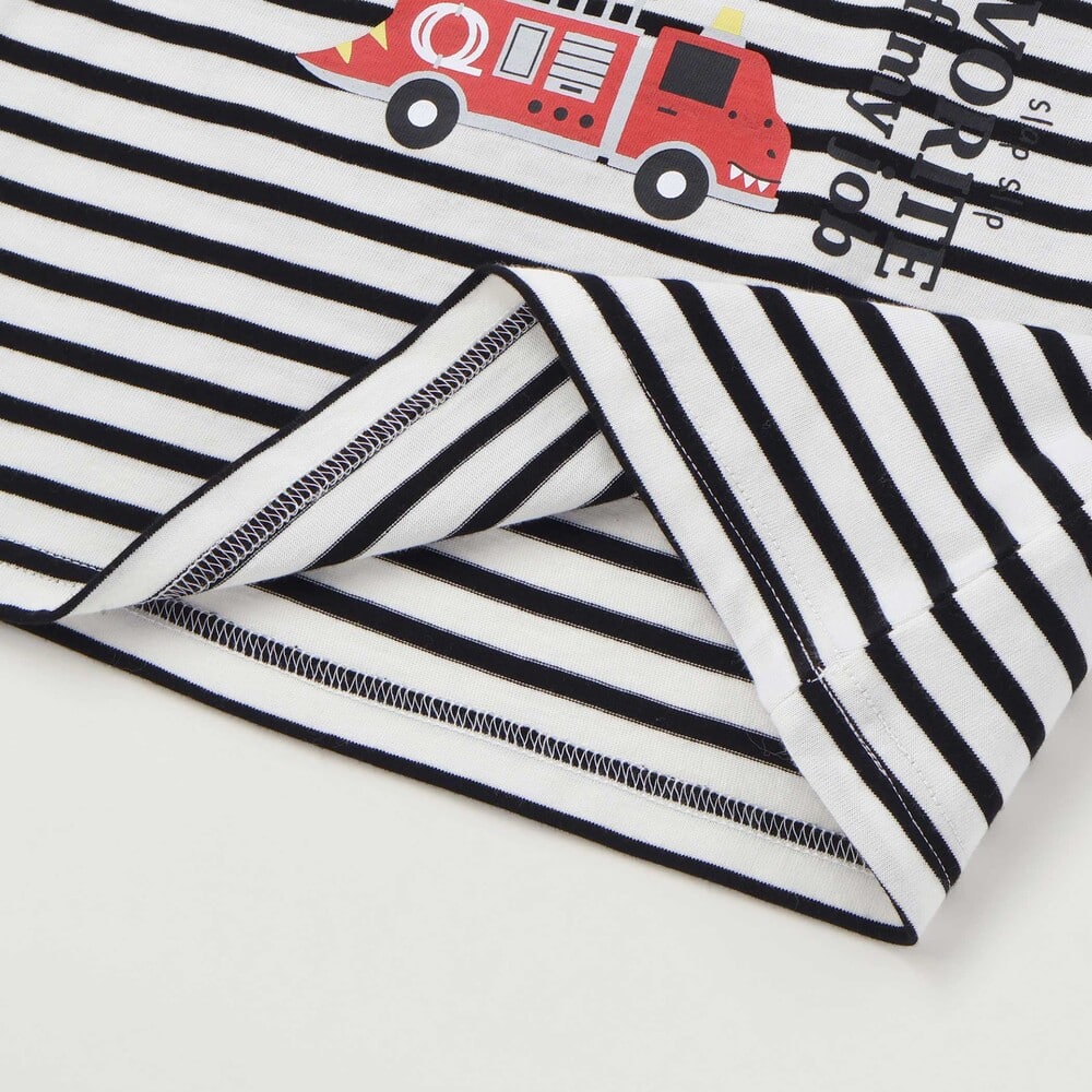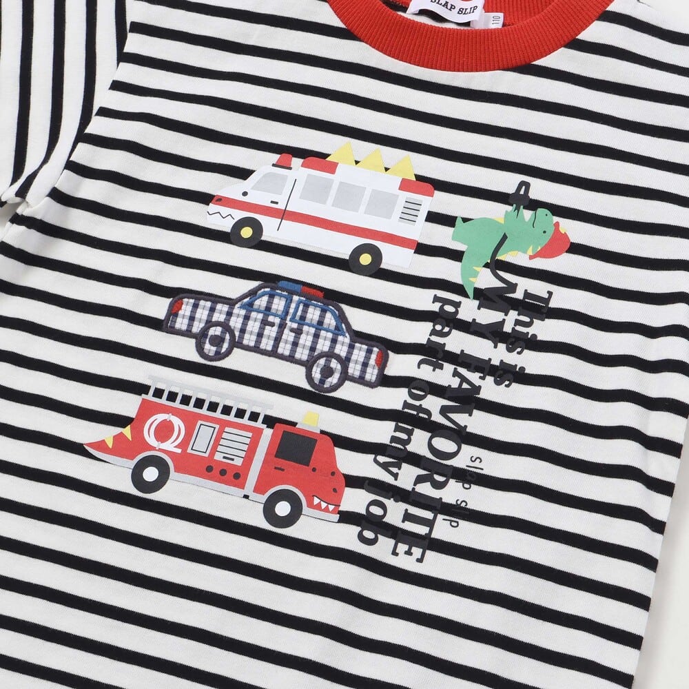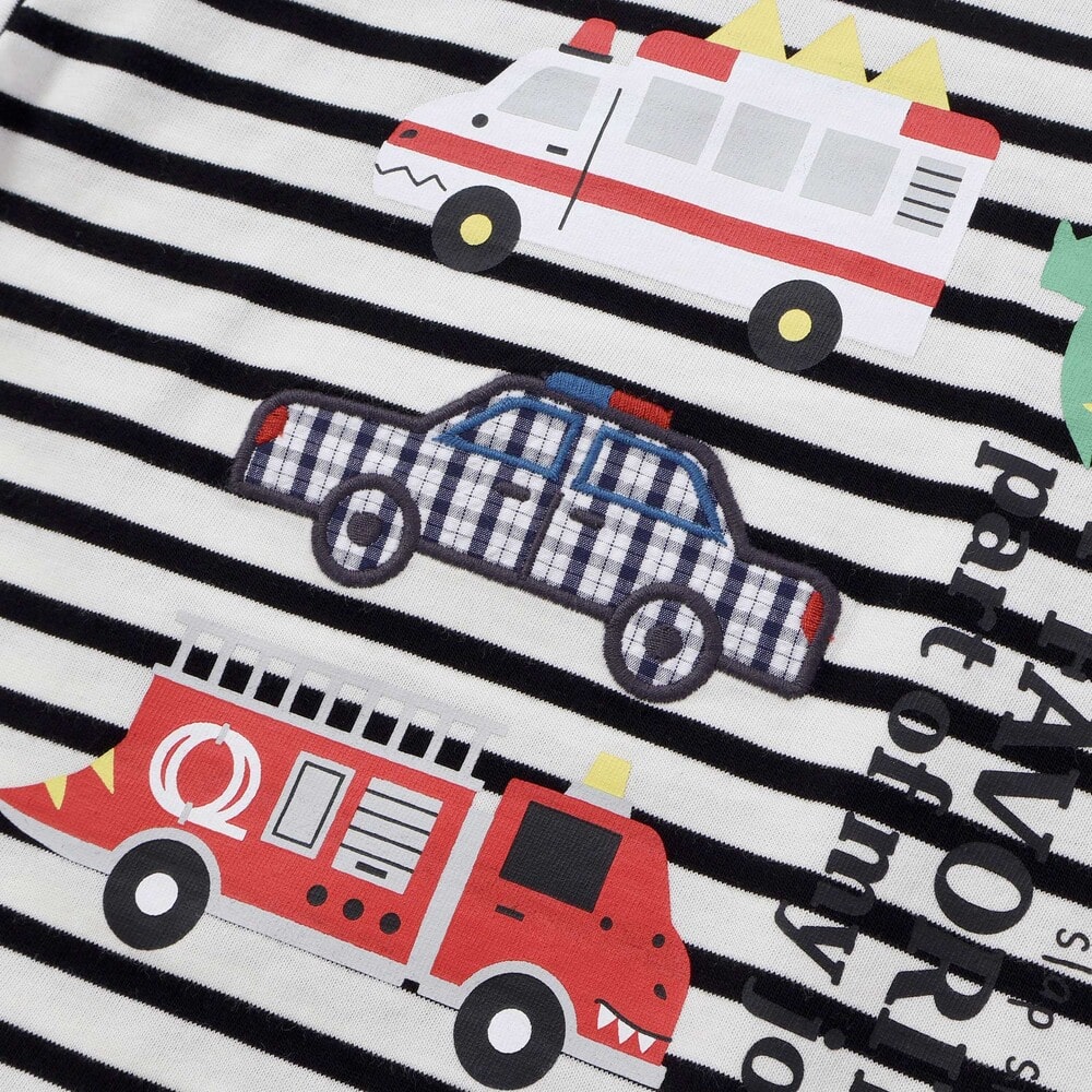 パトカーのパッチ刺しゅうに加え、恐竜フェイスの救急車や消防車のプリントでかっこよさ満点。