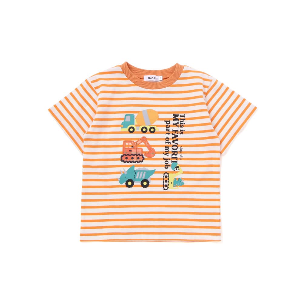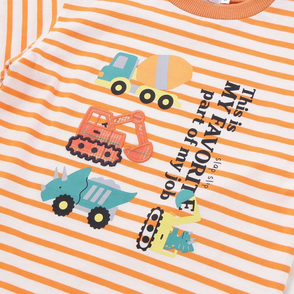 ダンプカー・ショベルカーのパッチ刺しゅうと、トリケラトプスのトラックプリントが楽しいアクセント。