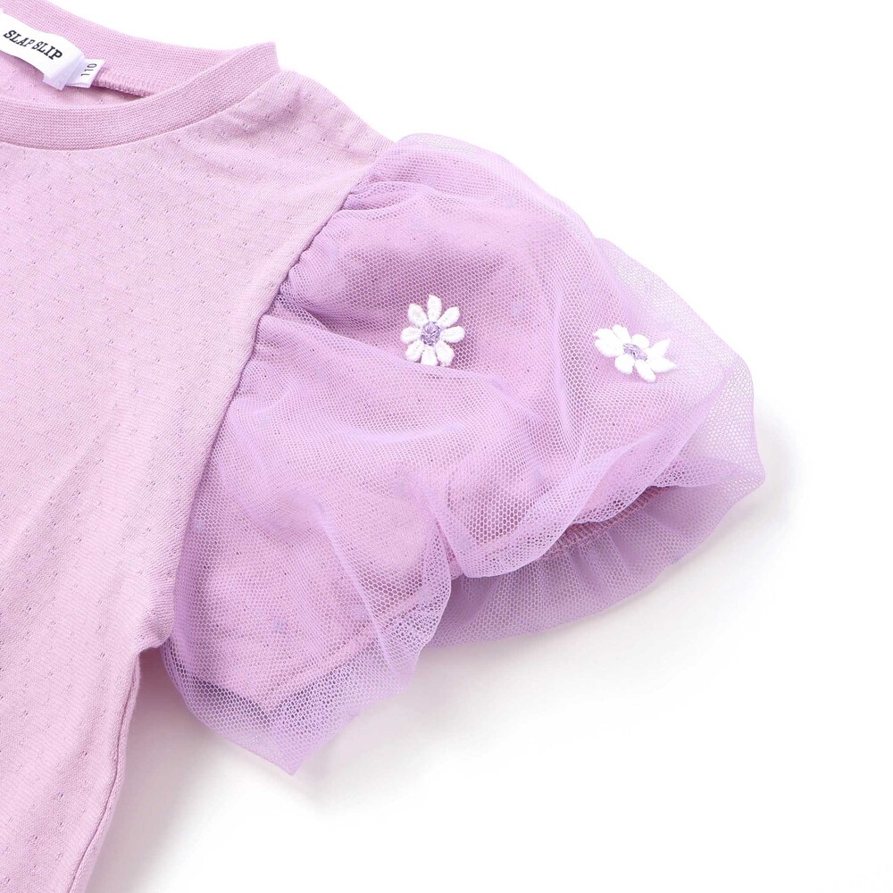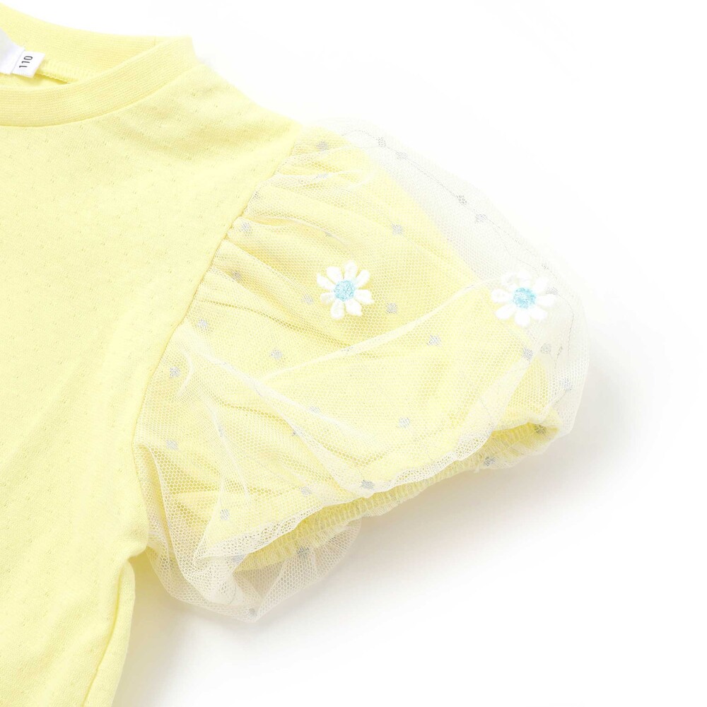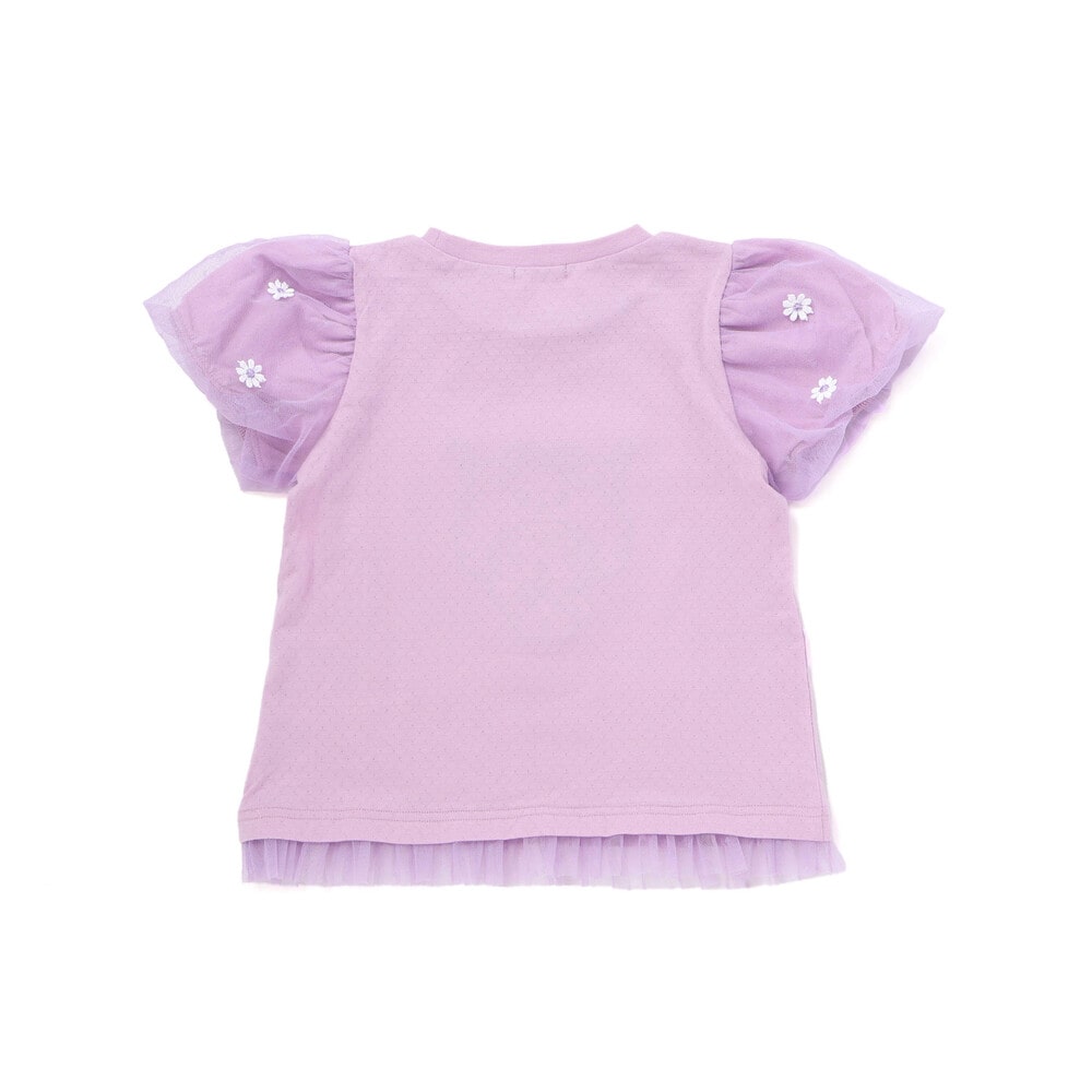 ふんわり丸みのあるパフスリーブに、ひらひら揺れるチュールのフリル。