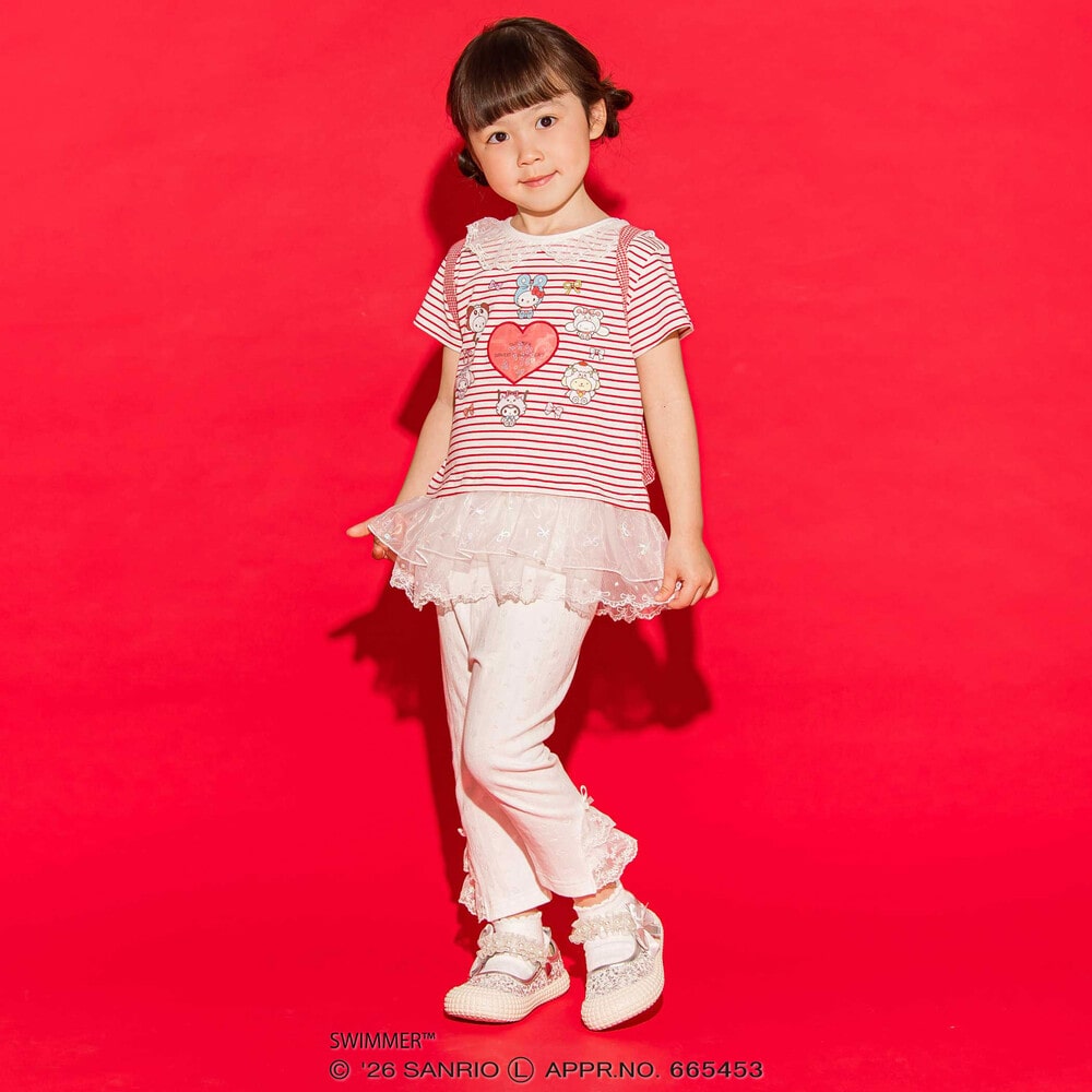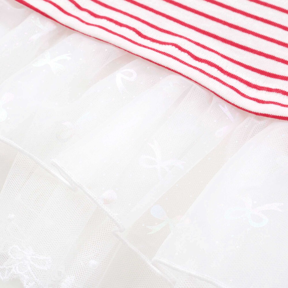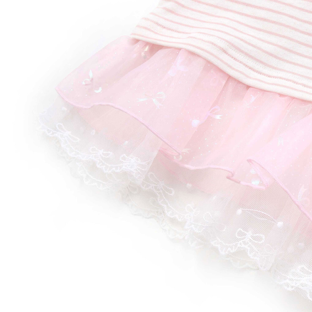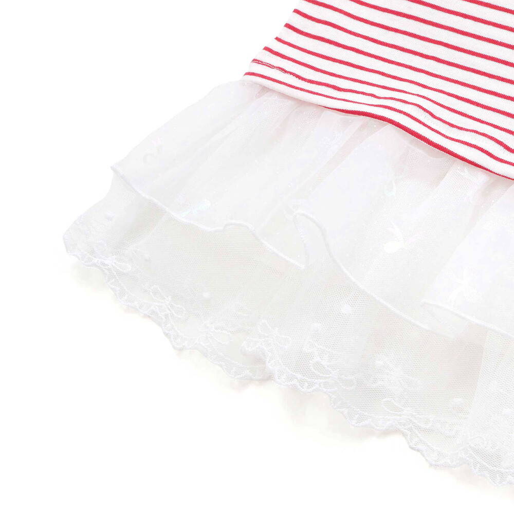 優しいボーダー柄にリボンのプリントがちりばめられたフリルがふわりと揺れ、その下からはチュールレースがひらめく、とびきりガーリーなデザインです。