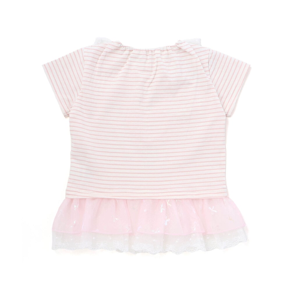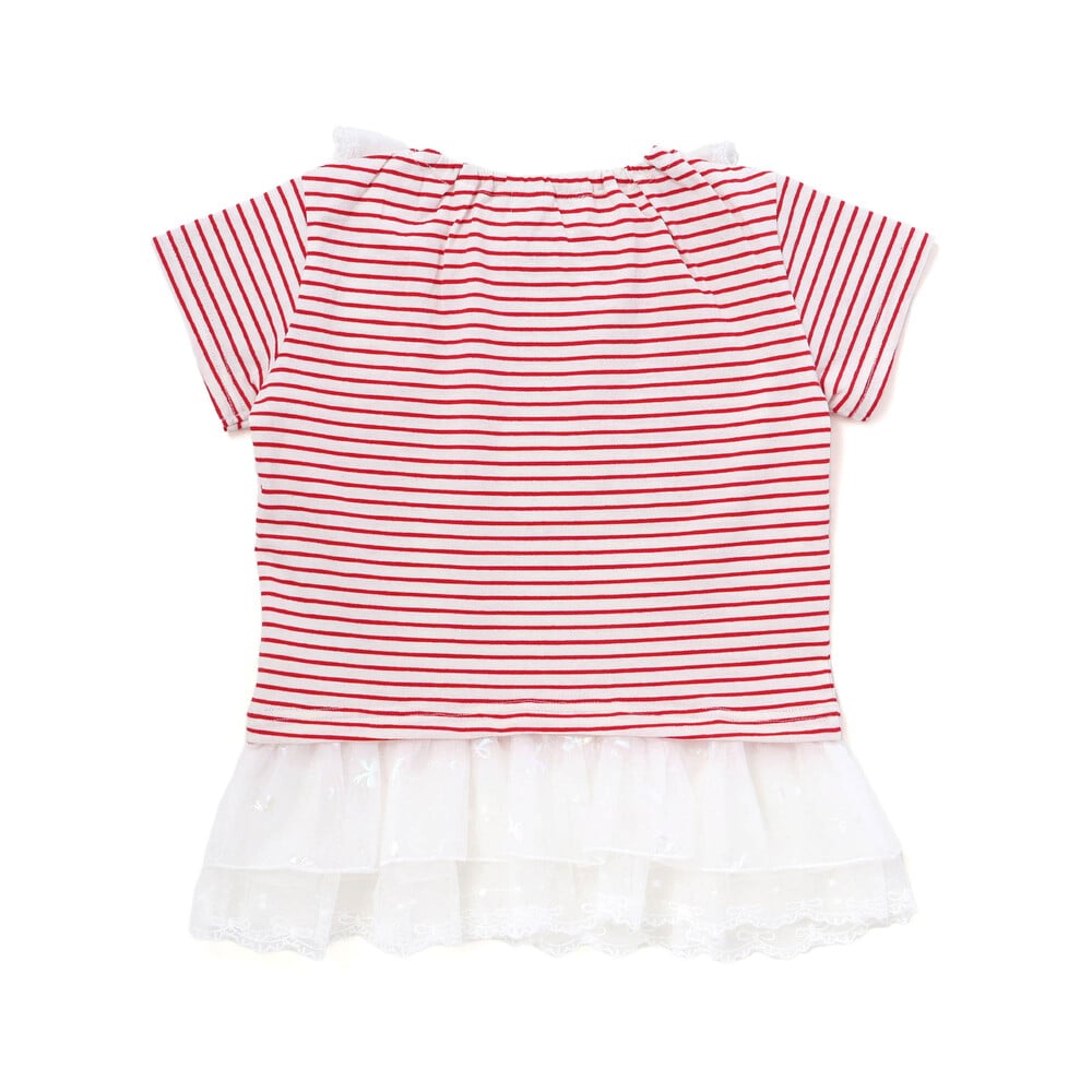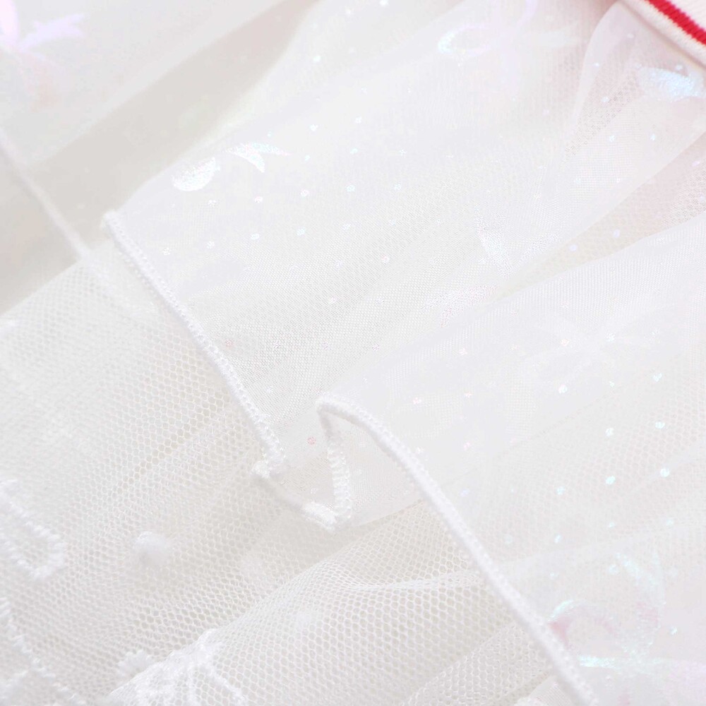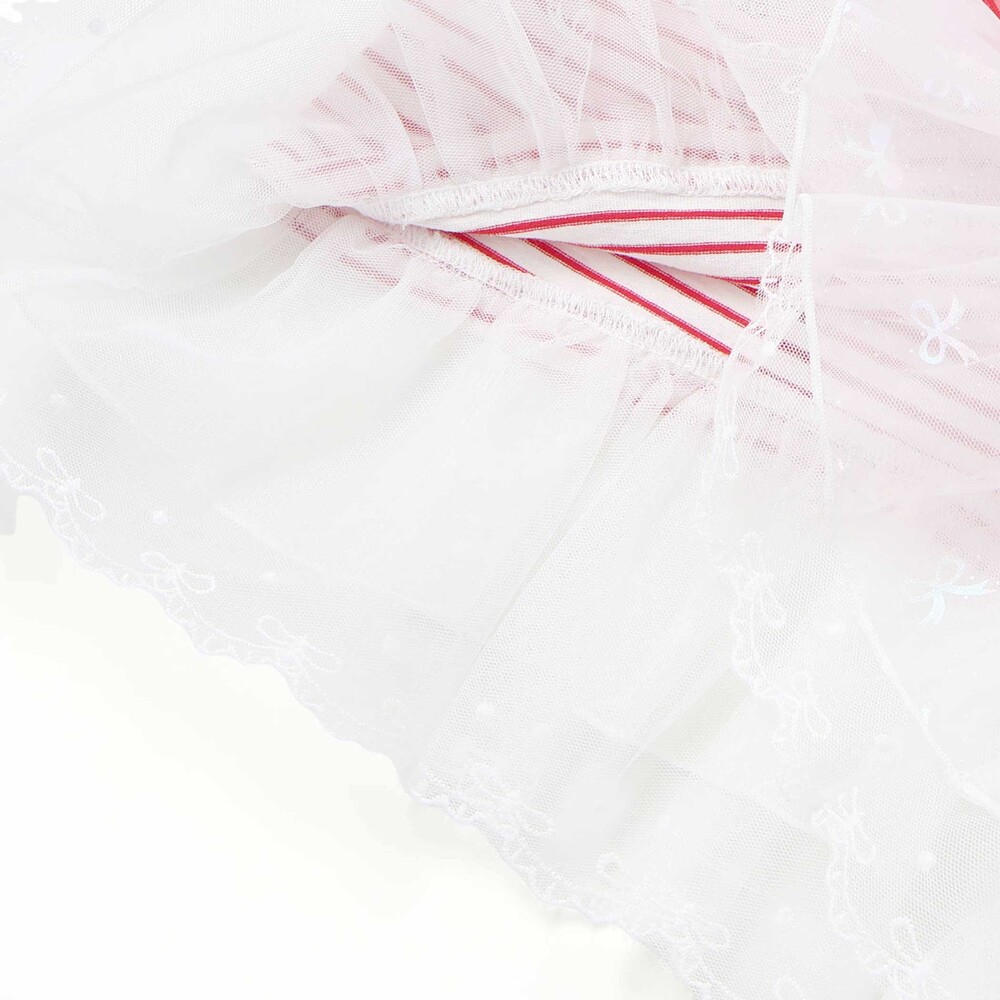 優しいボーダー柄にリボンのプリントがちりばめられたフリルがふわりと揺れ、その下からはチュールレースがひらめく、とびきりガーリーなデザインです。