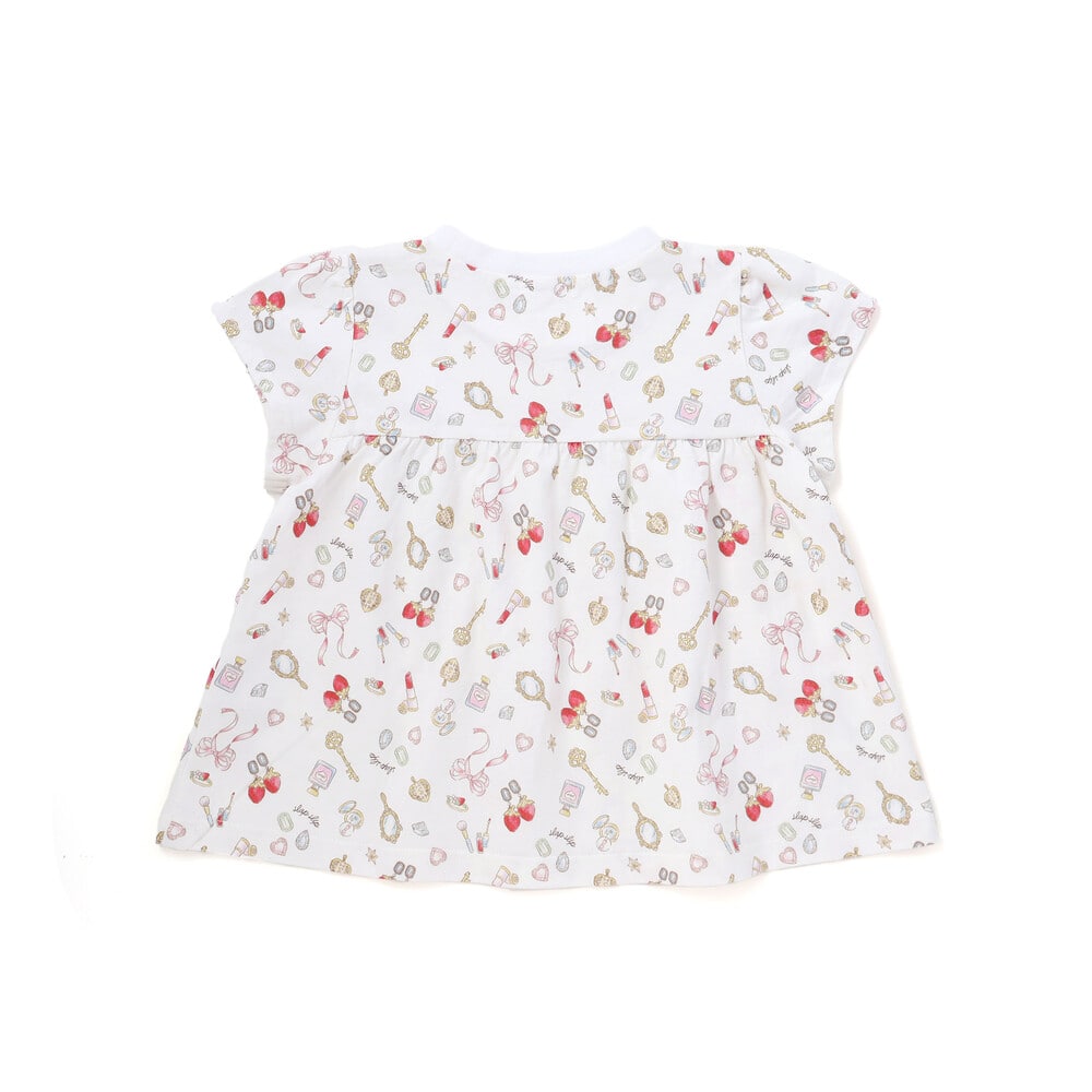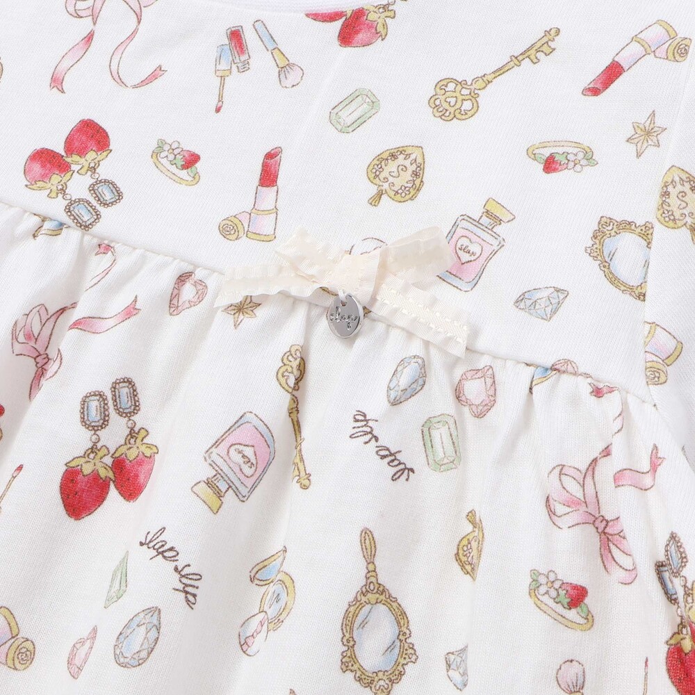 オフホワイト系は、イチゴのイヤリングや鏡、宝石などをちりばめた華やかな総柄で、おしゃれ心をくすぐるデザインに。