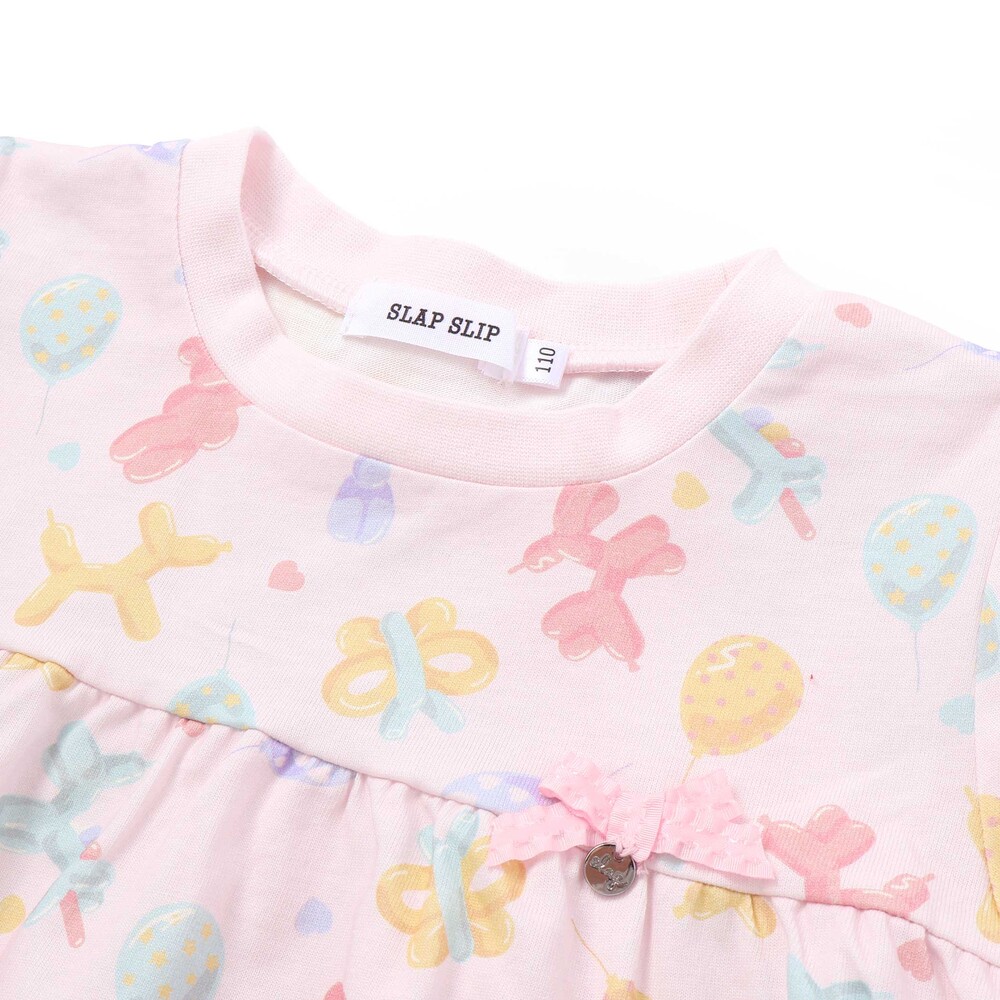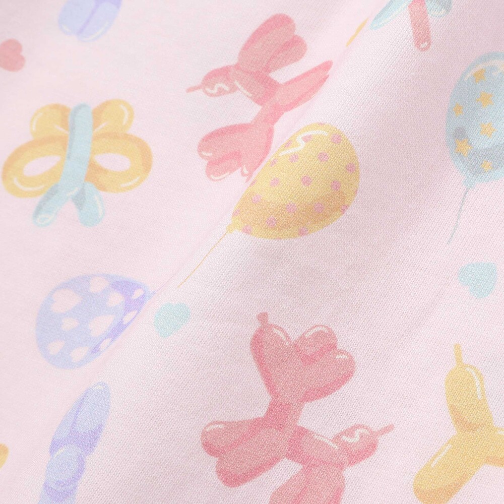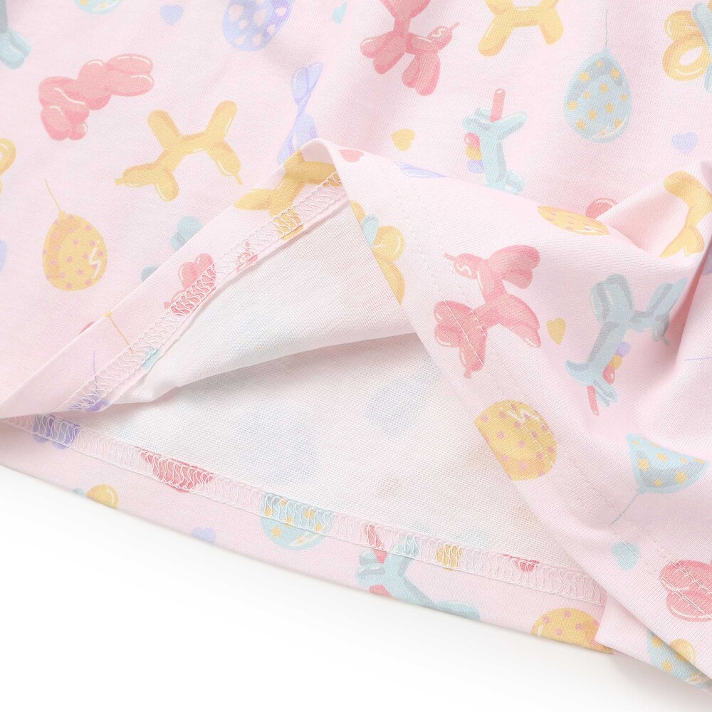 ピンク系は、イヌやウサギなどの動物たちがバルーンになった、ふんわり可愛らしい総柄デザイン。