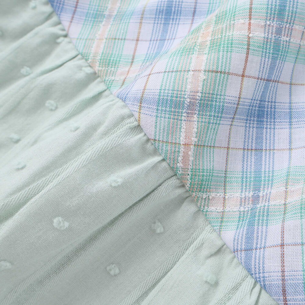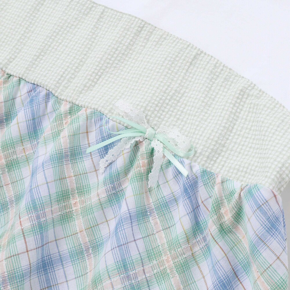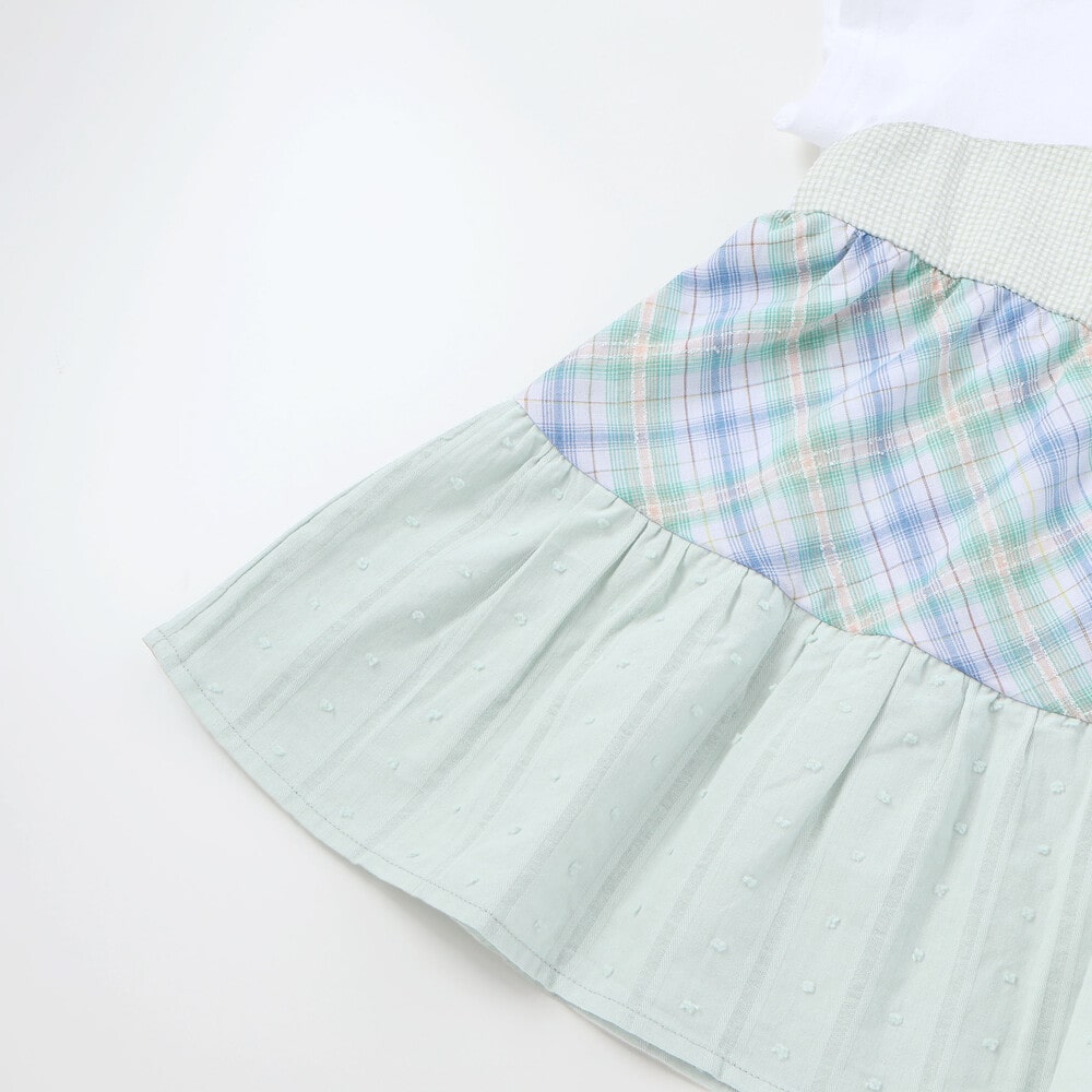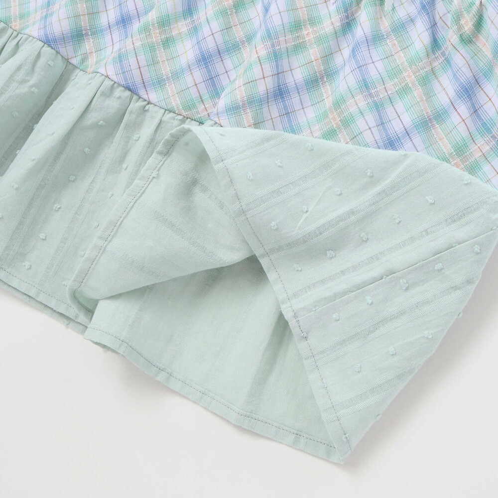 細かなチェック柄の身頃から、マドラスチェック、ドビー生地へとふんわり広がるティアード切り替えが、動くたびに軽やかな印象を与えてくれます。