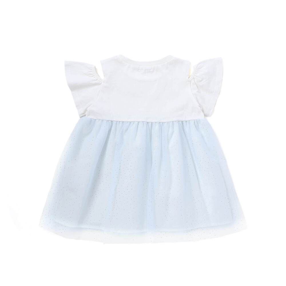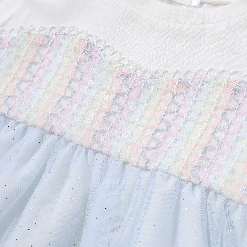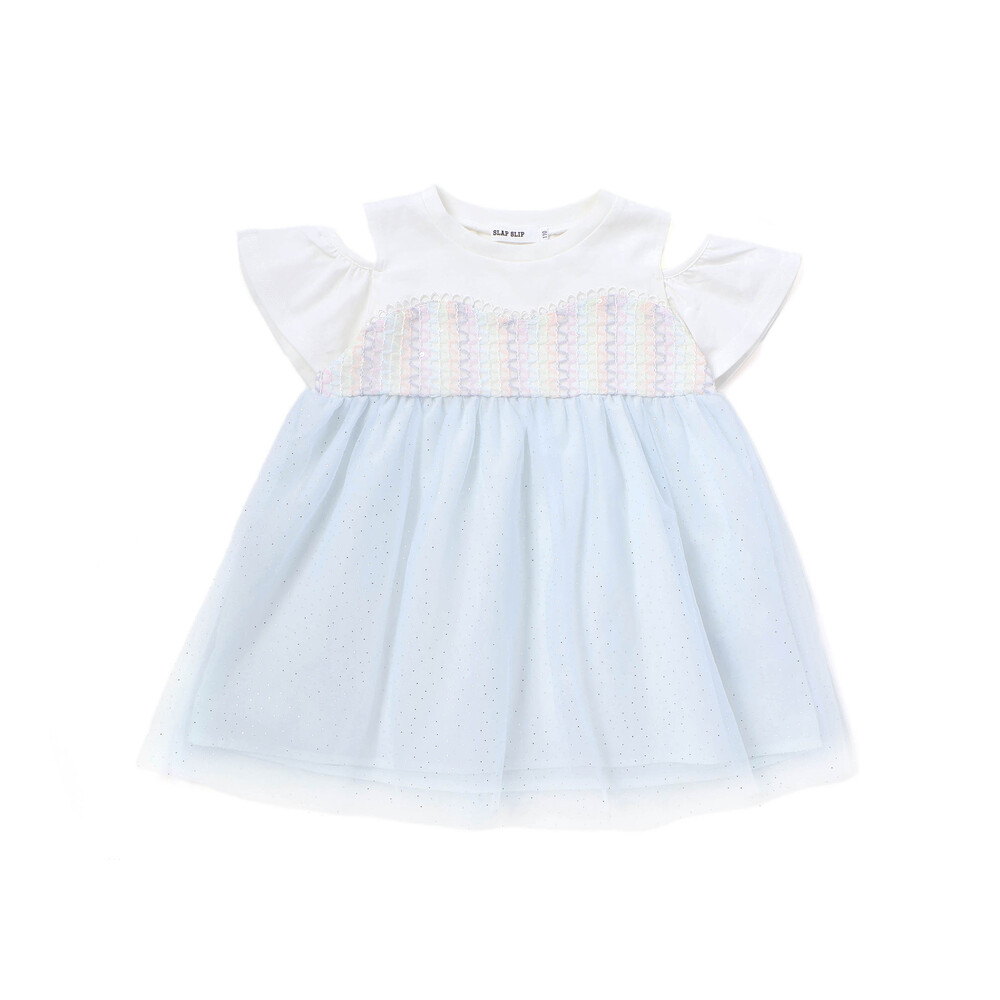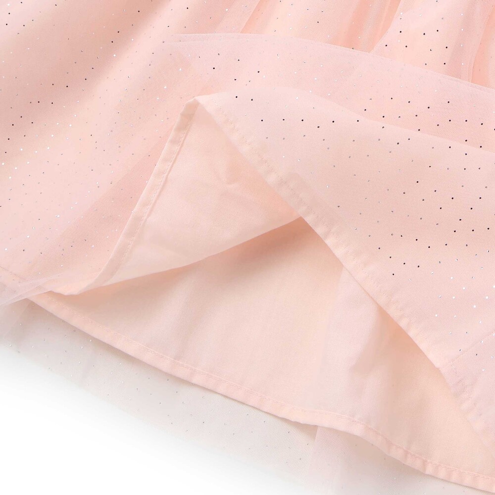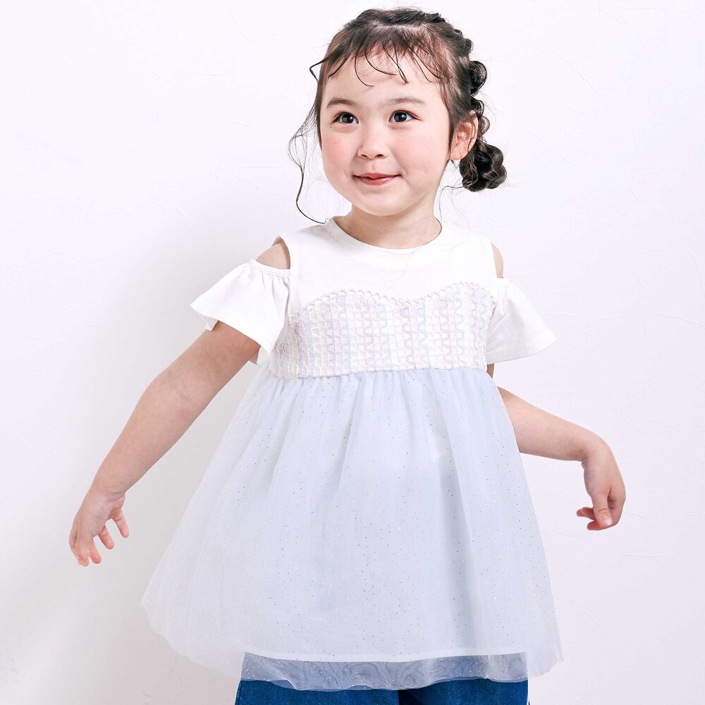 細かなラメを散りばめたチュールがふんわり重なり、ガーリーな雰囲気たっぷりの女の子用チュニック。