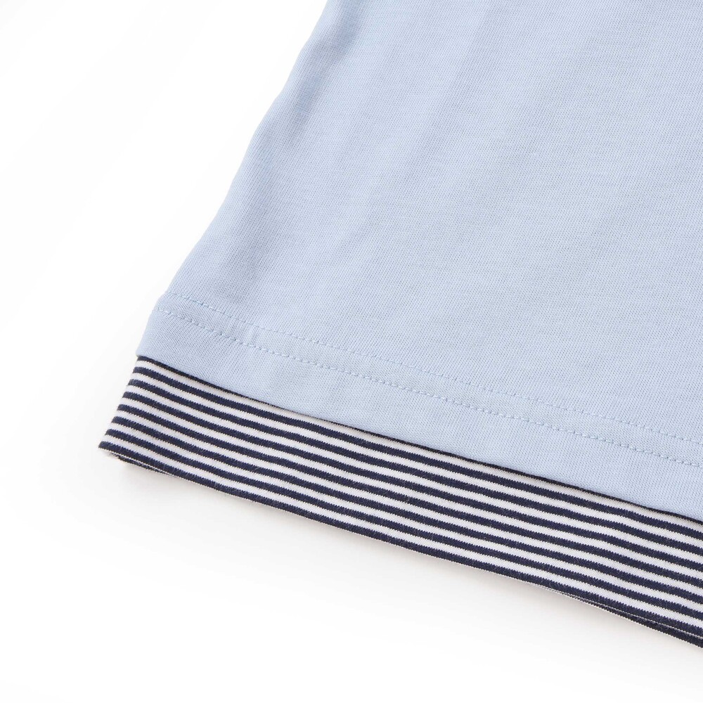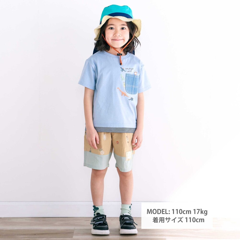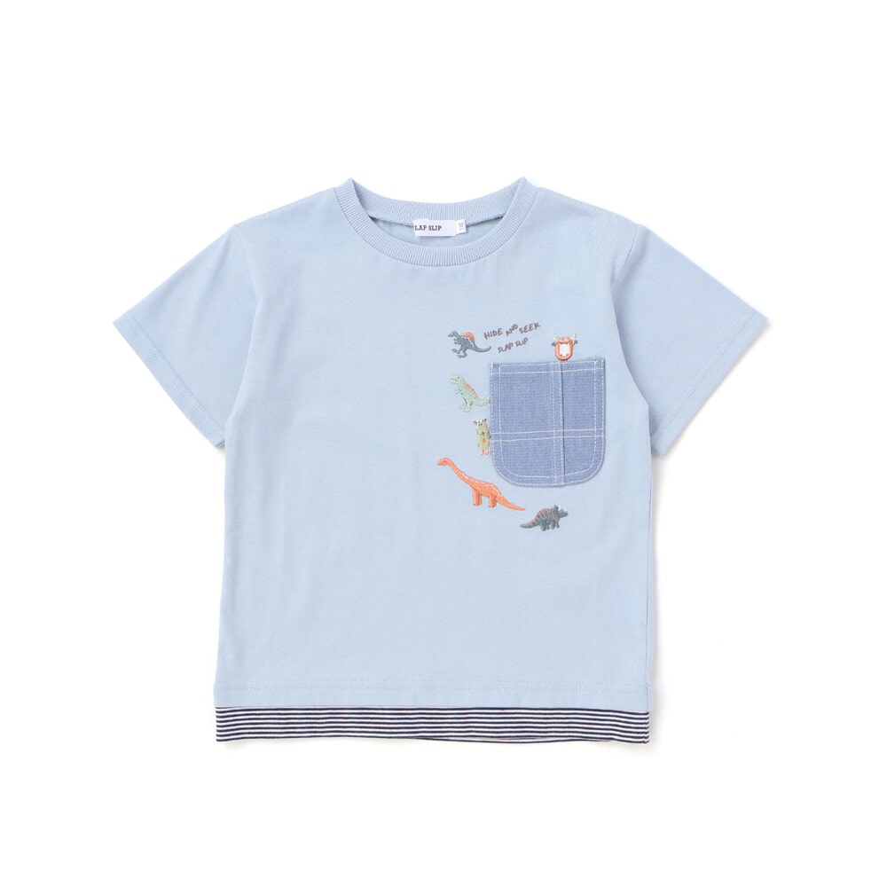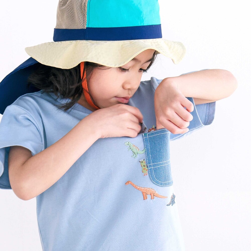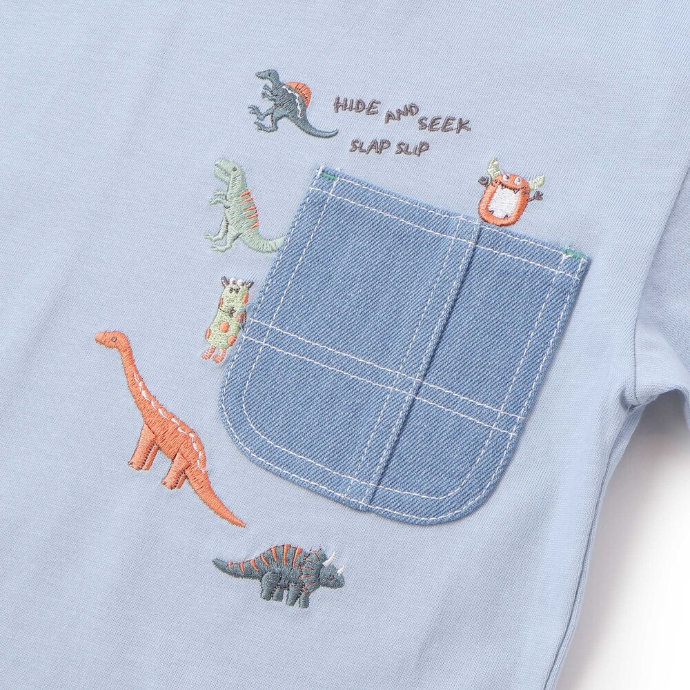 ブルーは無地の身生地にストライプを重ねたレイヤード風デザインで、デニム素材のポケットまわりには恐竜の刺しゅうをたっぷり施し、ワクワク感のある仕上がりに。