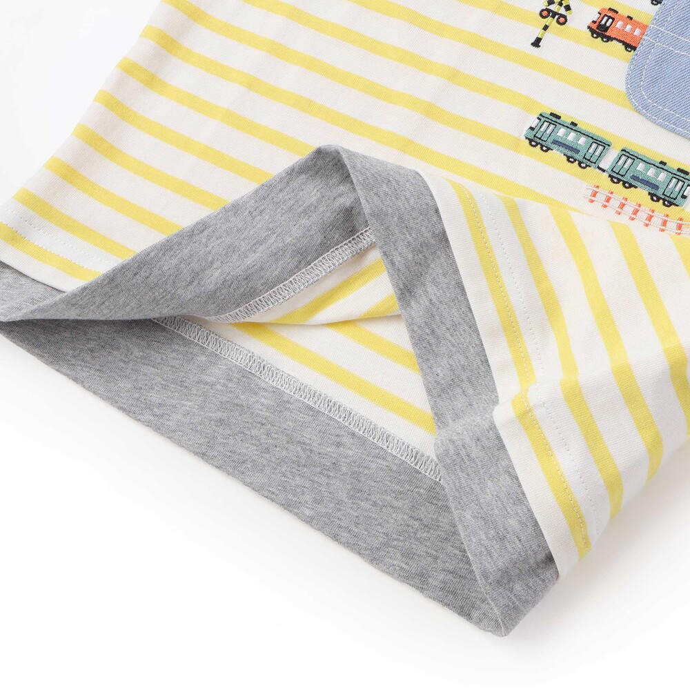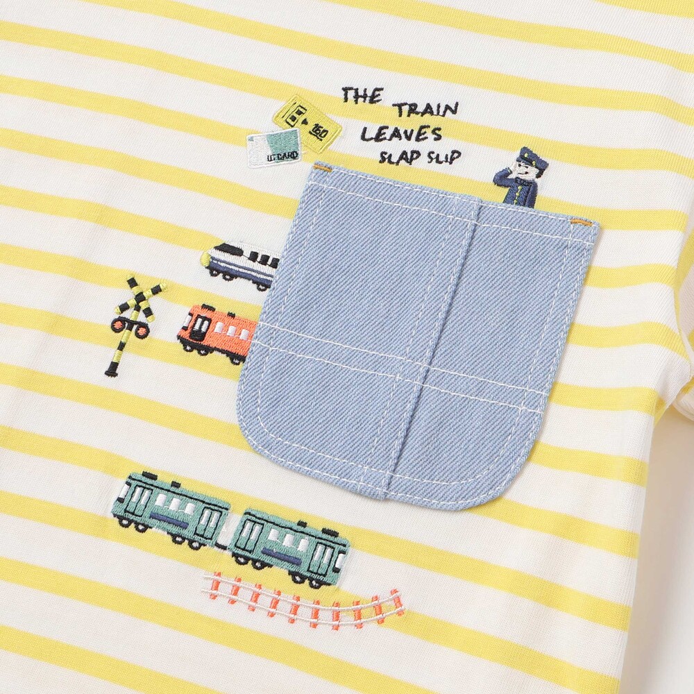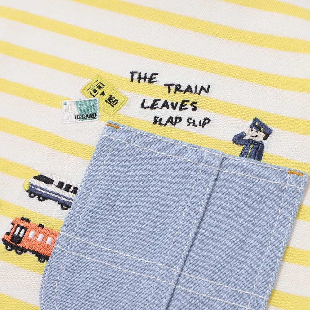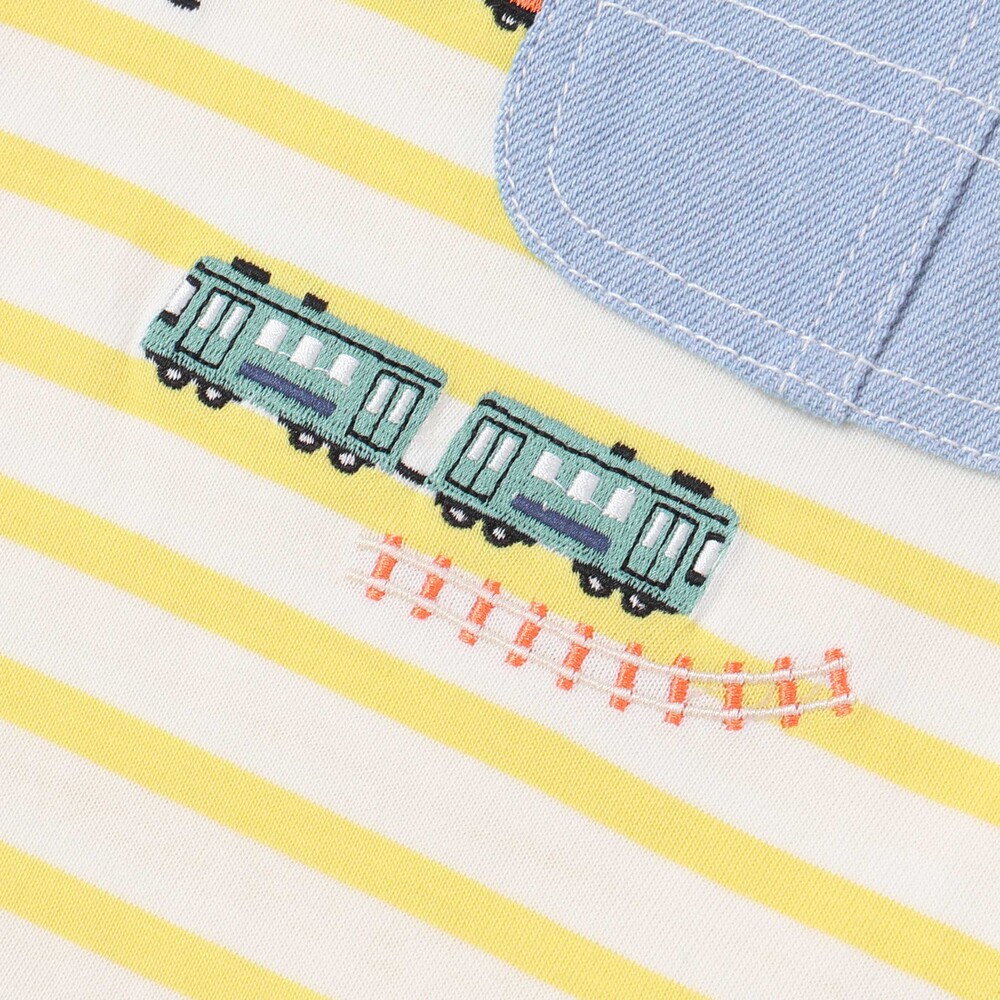 イエロー系はイエロー×ホワイトのストライプをベースに無地生地を重ね、デニムポケットのまわりには電車や線路の刺しゅうを添えて、のりもの好きさんの心をくすぐります。