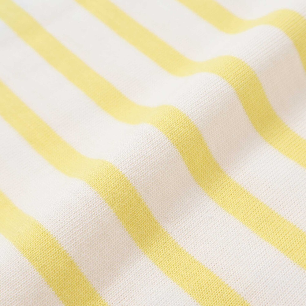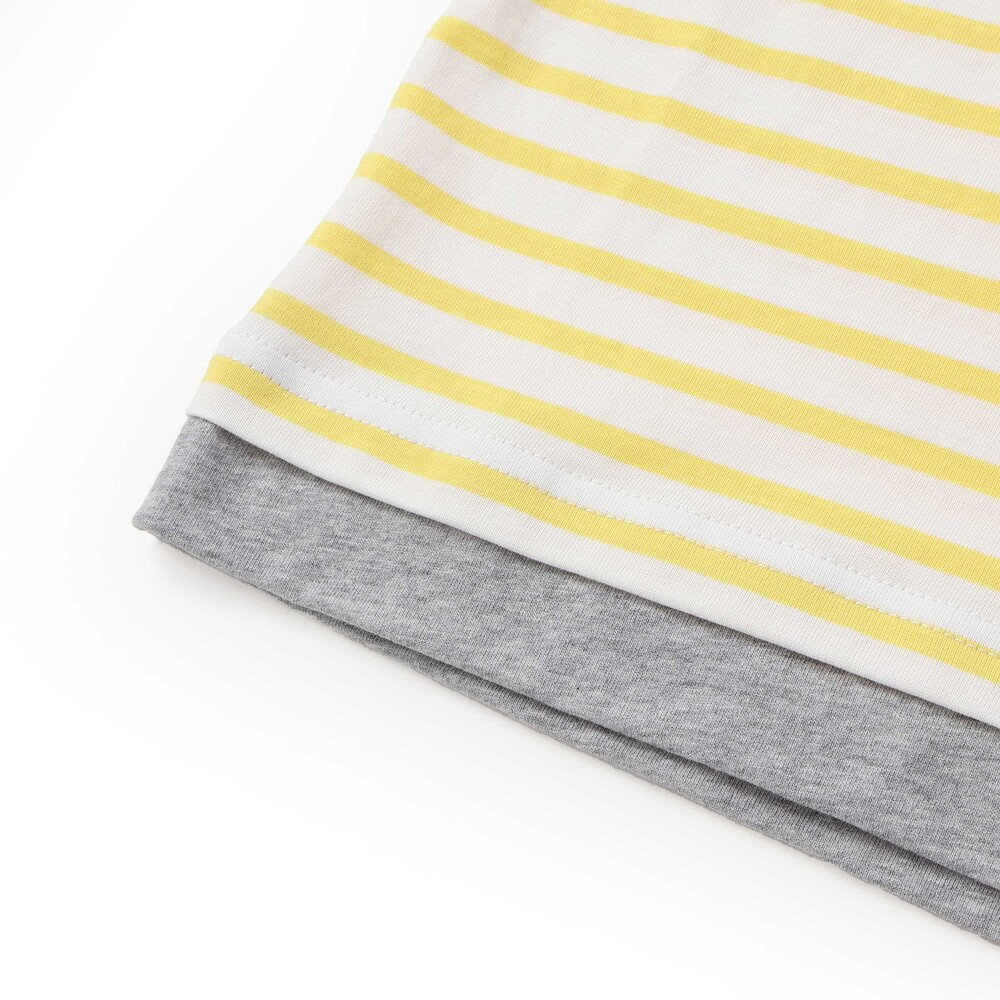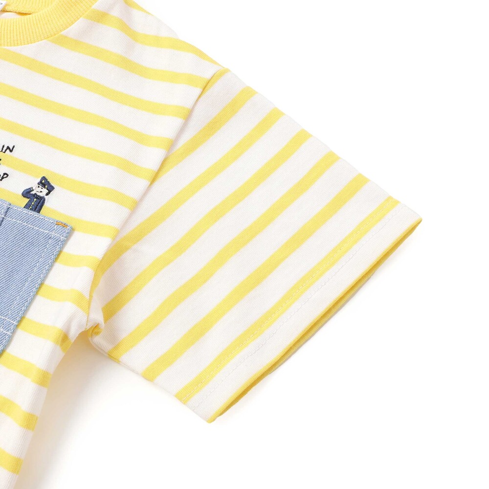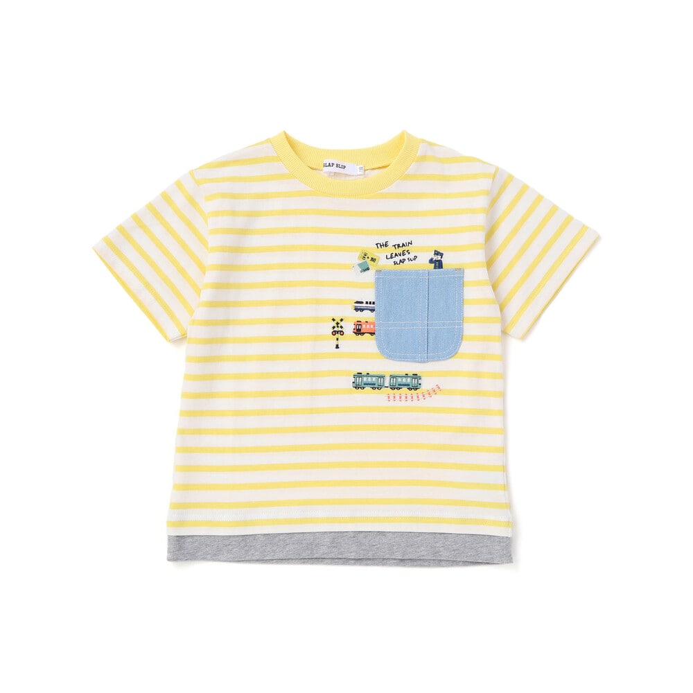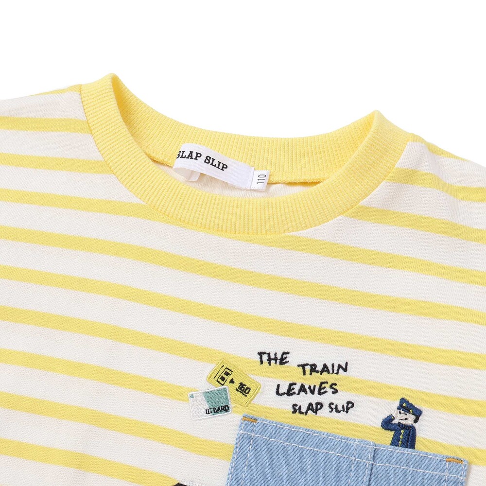 イエロー系はイエロー×ホワイトのストライプをベースに無地生地を重ね、デニムポケットのまわりには電車や線路の刺しゅうを添えて、のりもの好きさんの心をくすぐります。