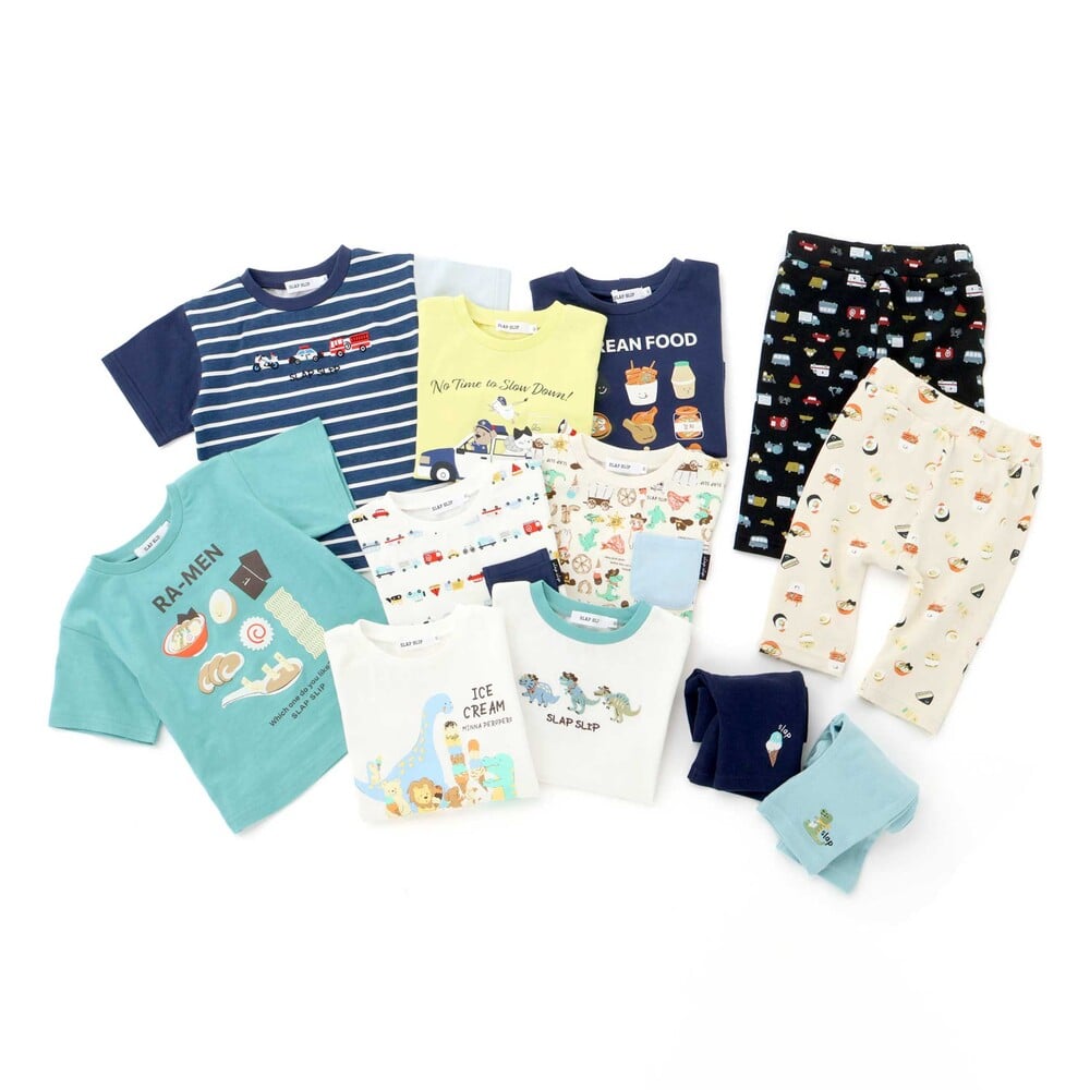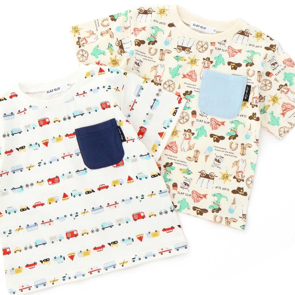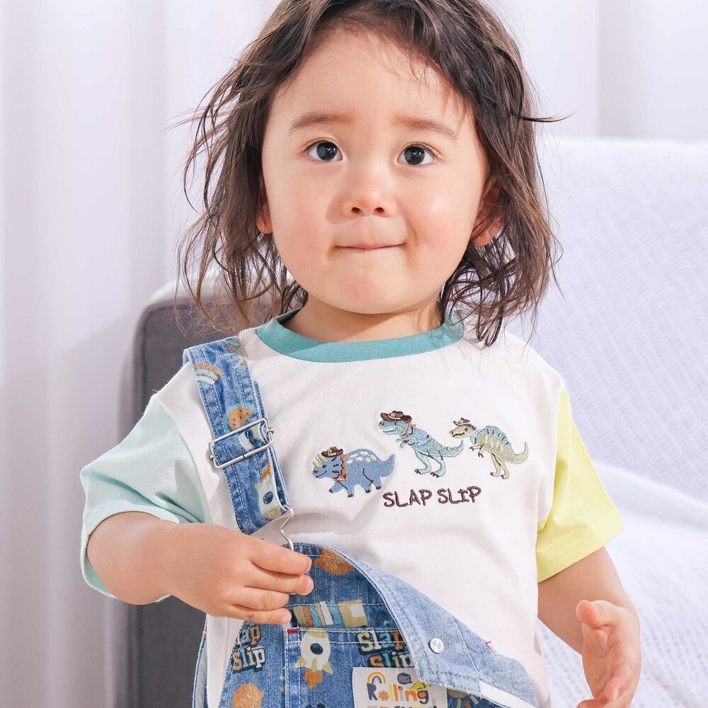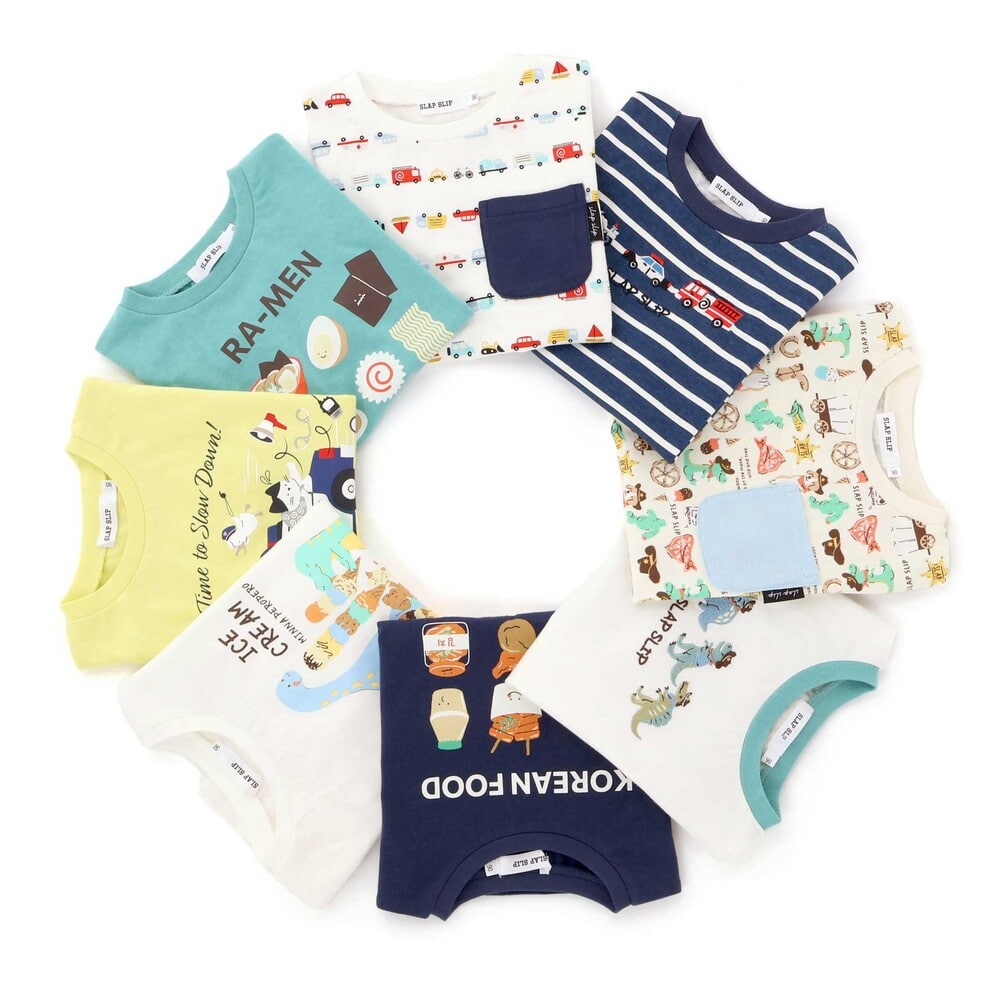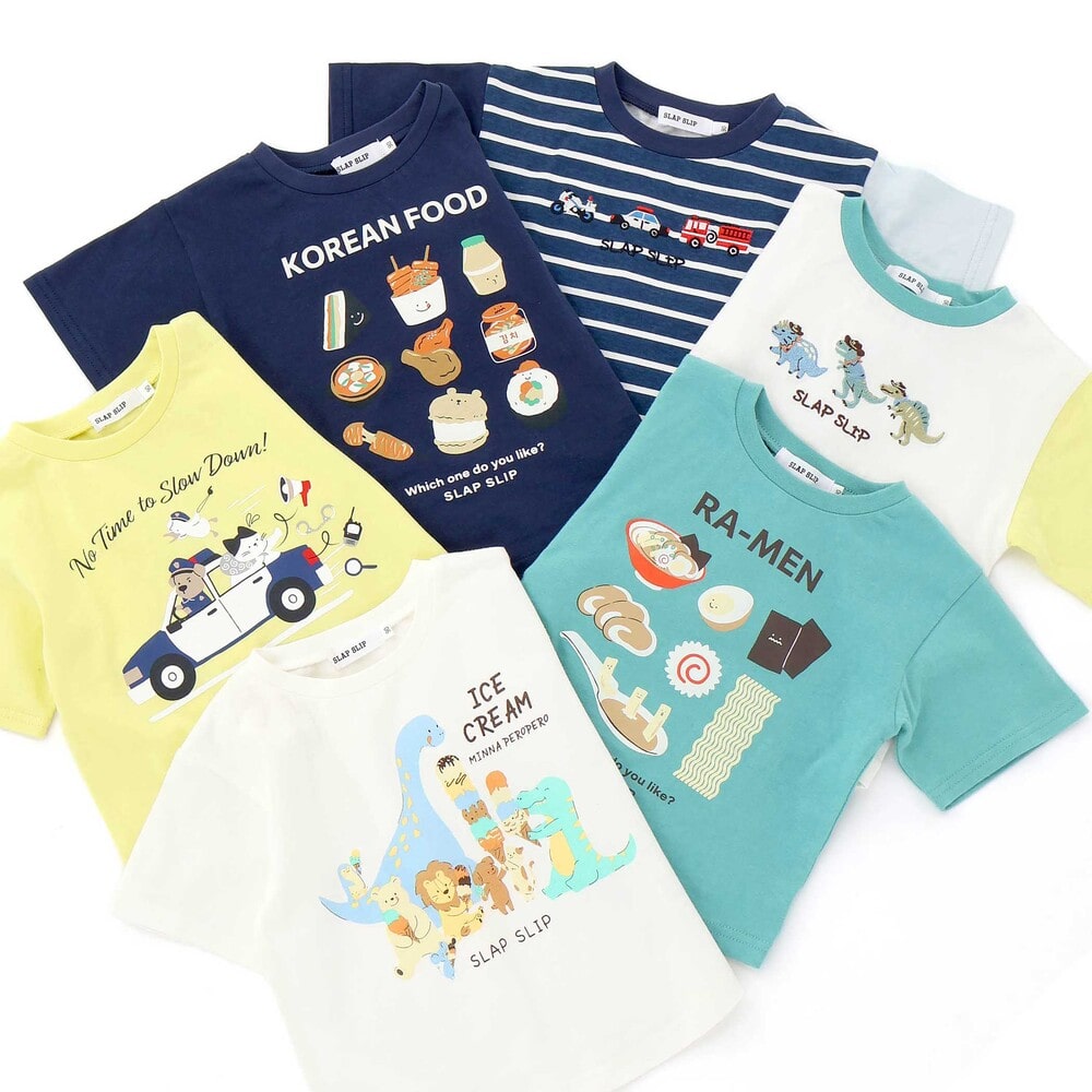 | カラー | ネイビー×韓国フード、ホワイト×恐竜とアニマルとアイス、黄色×いぬのお巡りさんと泥棒ねこ、グリーン×ラーメン、ホワイト×恐竜刺しゅう×配色袖、紺ボーダー×働くくるま刺しゅう、白×のりものボーダー×胸ポケット、きなり×犬と恐竜カウボーイ総柄 |