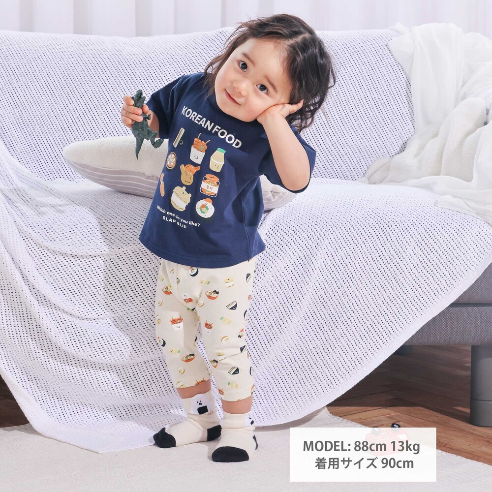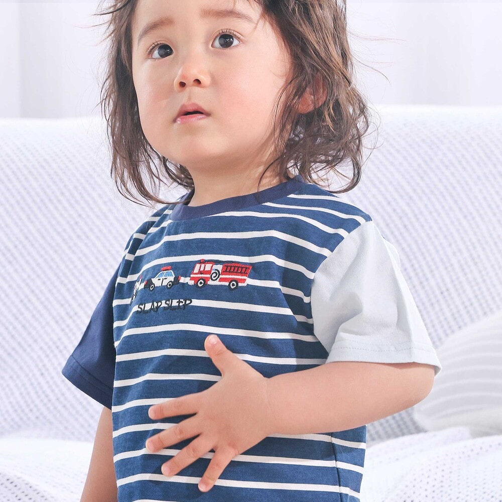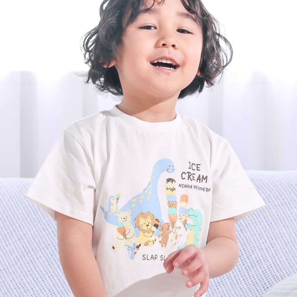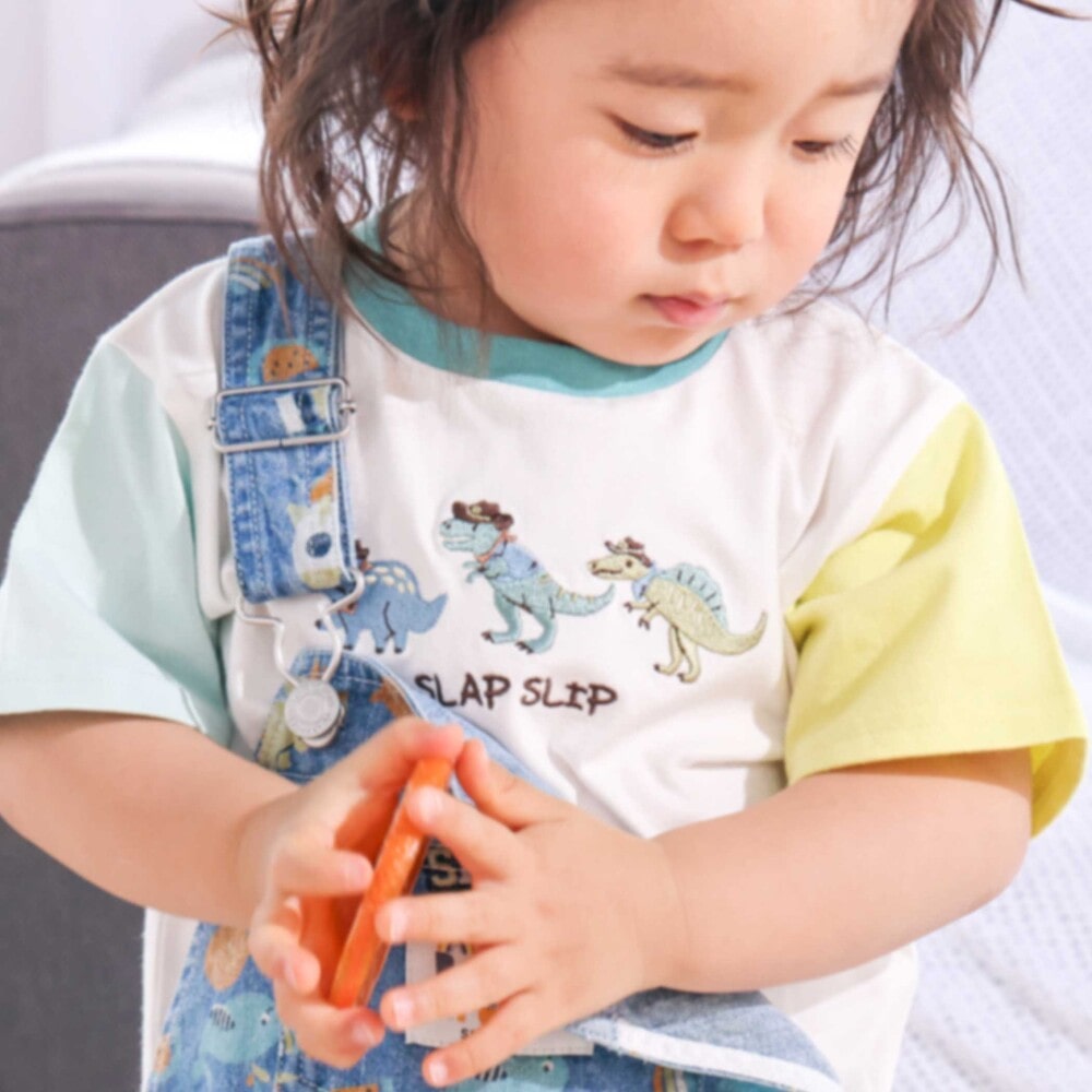 | カラー | ネイビー×韓国フード、ホワイト×恐竜とアニマルとアイス、黄色×いぬのお巡りさんと泥棒ねこ、グリーン×ラーメン、ホワイト×恐竜刺しゅう×配色袖、紺ボーダー×働くくるま刺しゅう、白×のりものボーダー×胸ポケット、きなり×犬と恐竜カウボーイ総柄 |