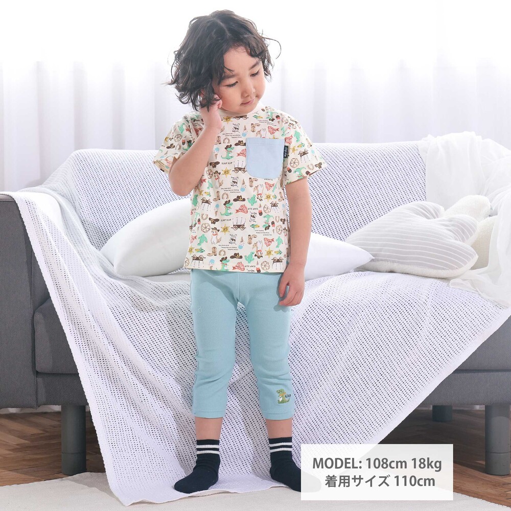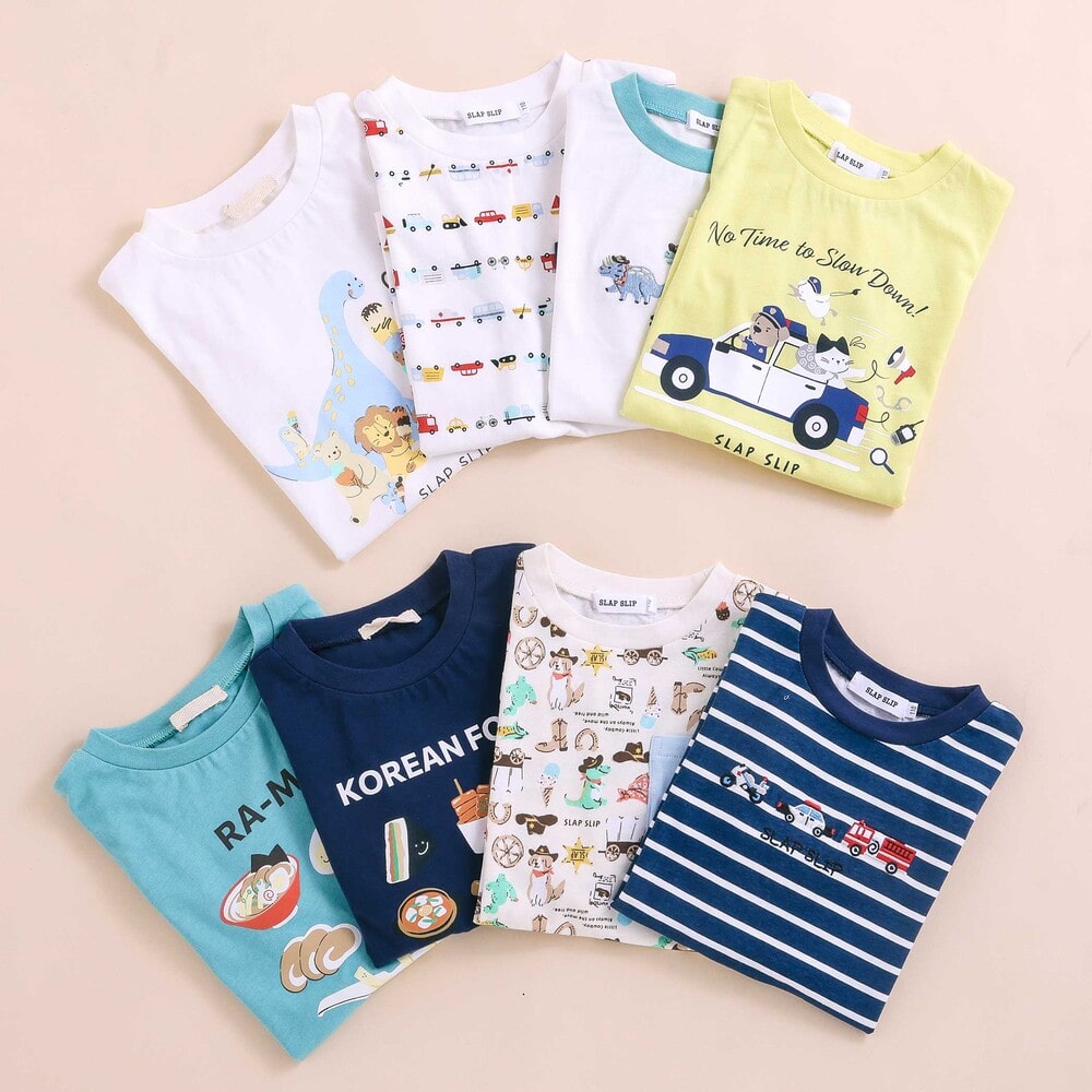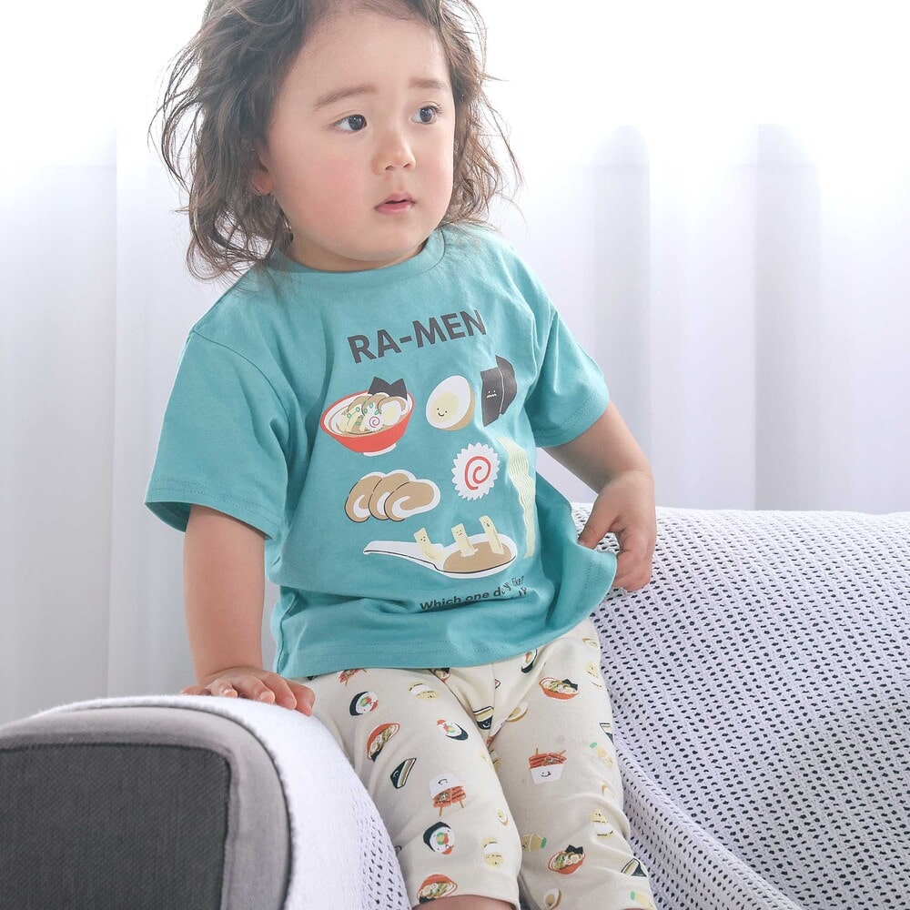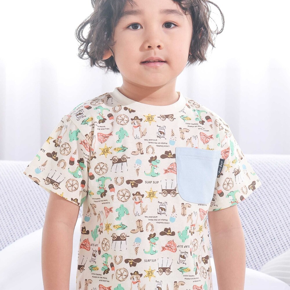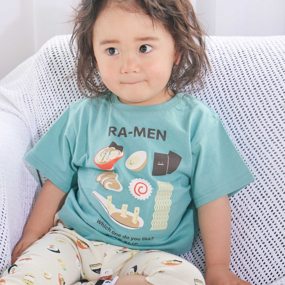 | カラー | ネイビー×韓国フード、ホワイト×恐竜とアニマルとアイス、黄色×いぬのお巡りさんと泥棒ねこ、グリーン×ラーメン、ホワイト×恐竜刺しゅう×配色袖、紺ボーダー×働くくるま刺しゅう、白×のりものボーダー×胸ポケット、きなり×犬と恐竜カウボーイ総柄 |