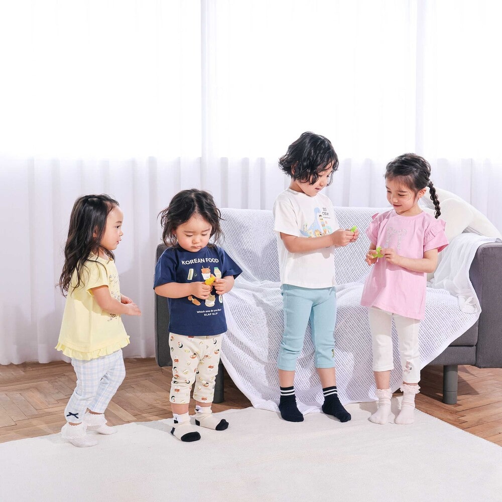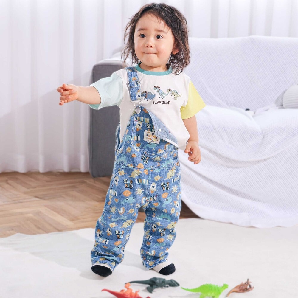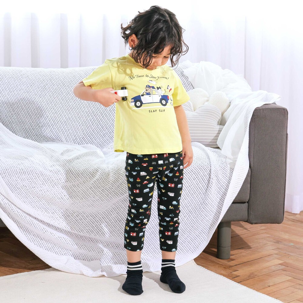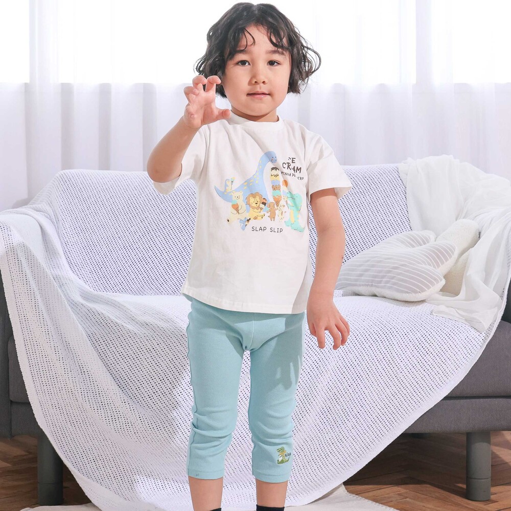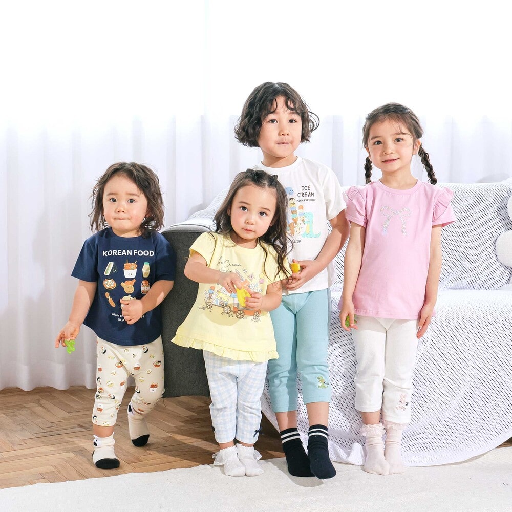 | カラー | ネイビー×韓国フード、ホワイト×恐竜とアニマルとアイス、黄色×いぬのお巡りさんと泥棒ねこ、グリーン×ラーメン、ホワイト×恐竜刺しゅう×配色袖、紺ボーダー×働くくるま刺しゅう、白×のりものボーダー×胸ポケット、きなり×犬と恐竜カウボーイ総柄 |