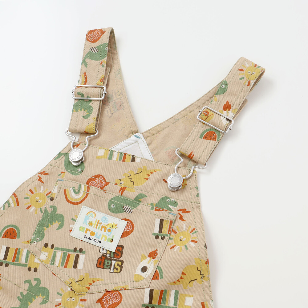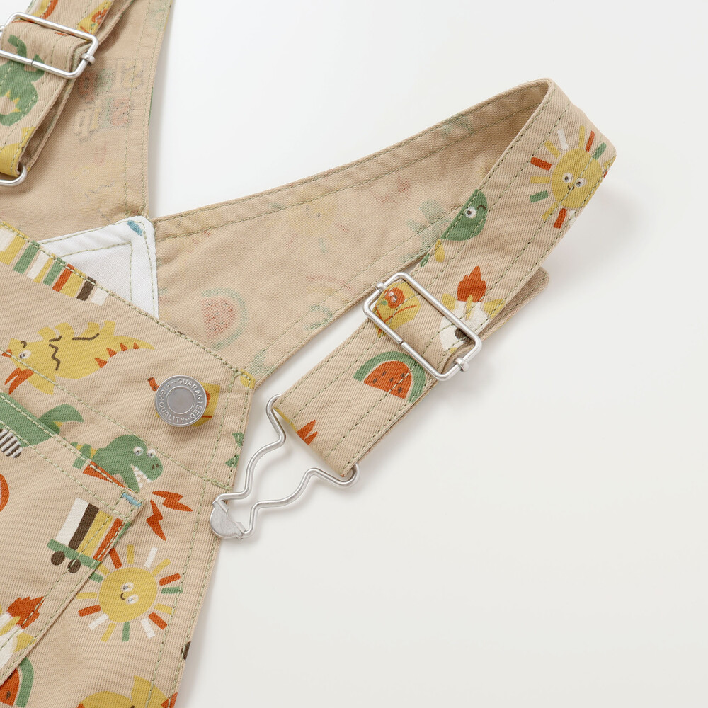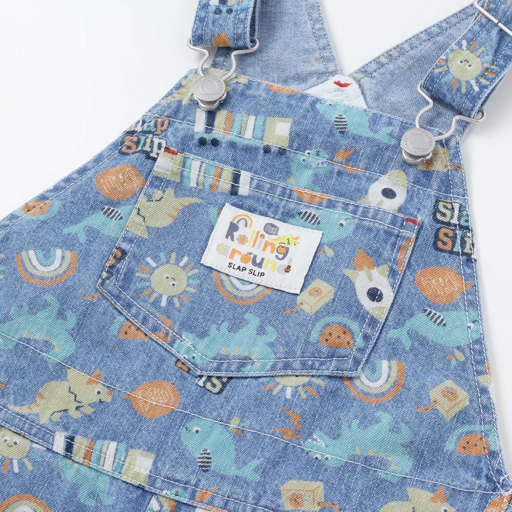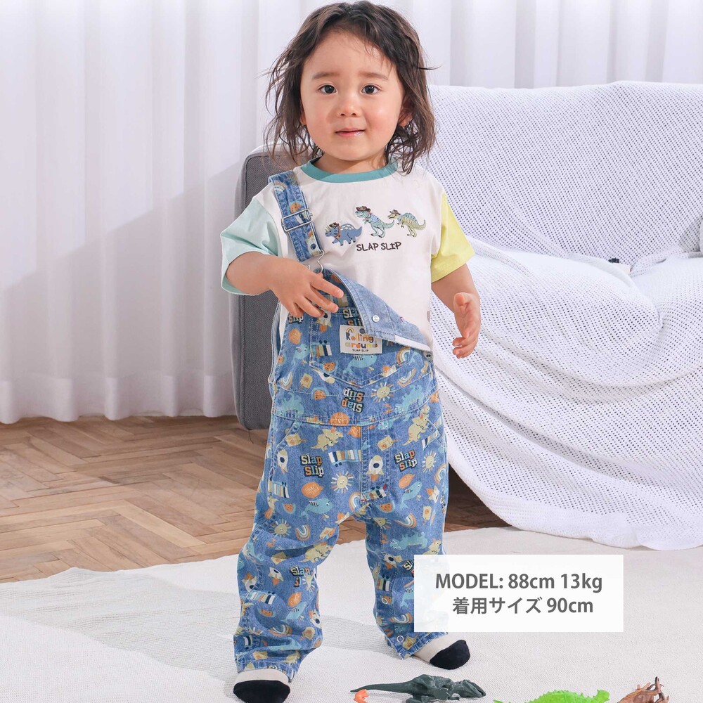 恐竜やくるま、クジラ、宇宙船など、男の子が大好きなモチーフをぎゅっと詰め込んだ総柄がとっても華やかな、7分丈のサロペット。
