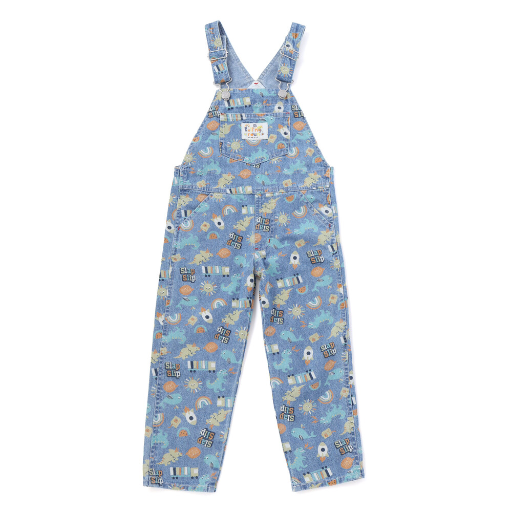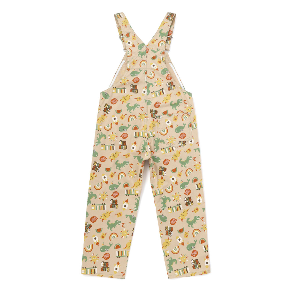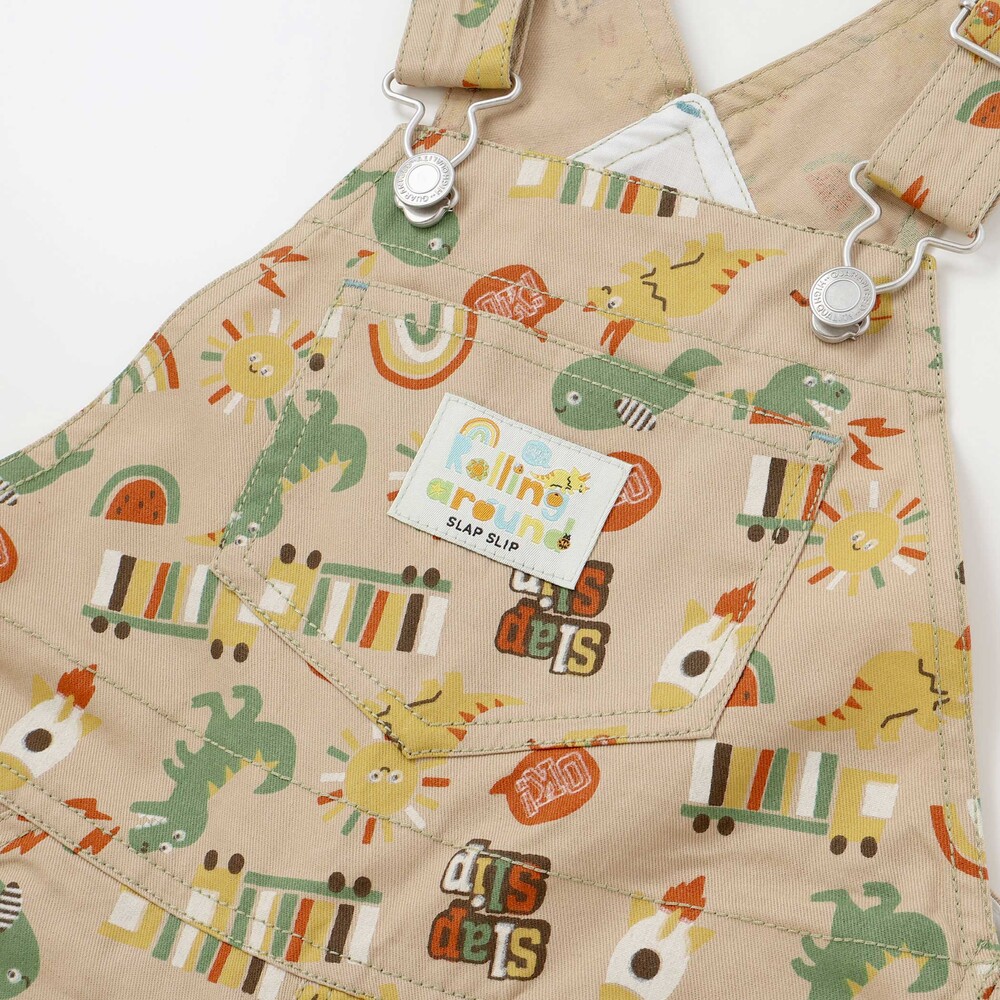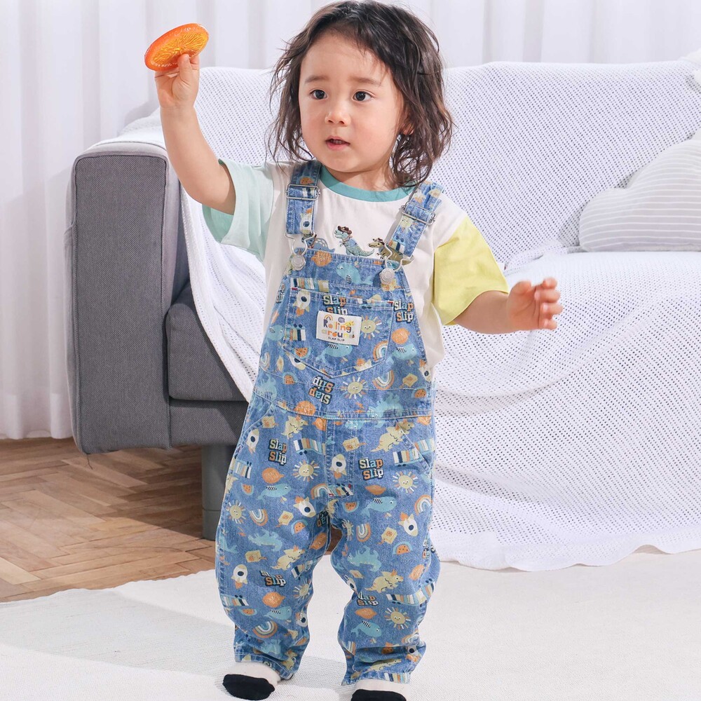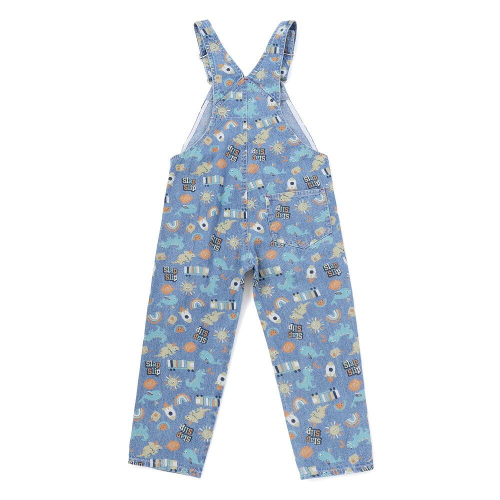 恐竜やくるま、クジラ、宇宙船など、男の子が大好きなモチーフをぎゅっと詰め込んだ総柄がとっても華やかな、7分丈のサロペット。