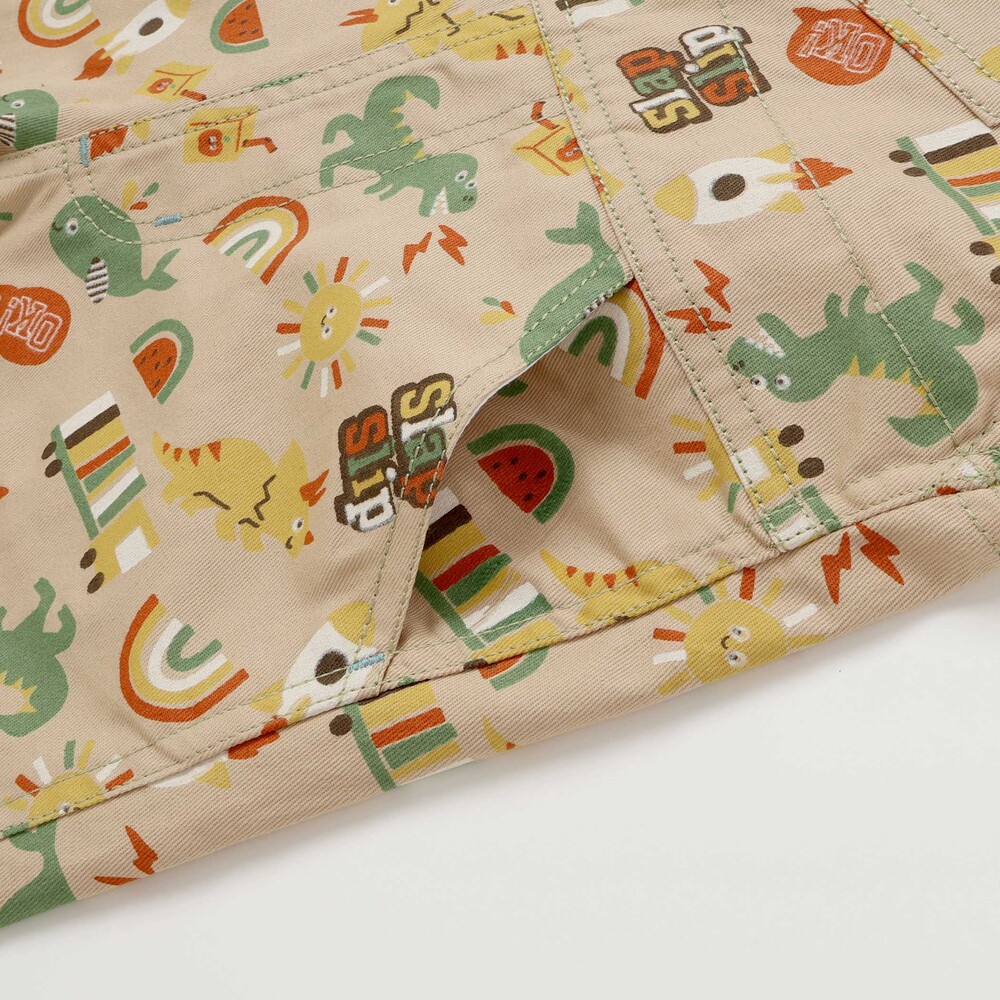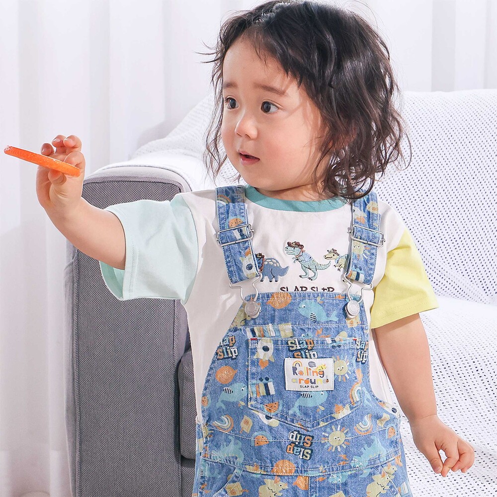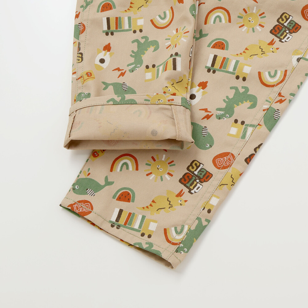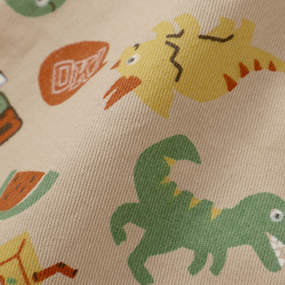 恐竜やくるま、クジラ、宇宙船など、男の子が大好きなモチーフをぎゅっと詰め込んだ総柄がとっても華やかな、7分丈のサロペット。
