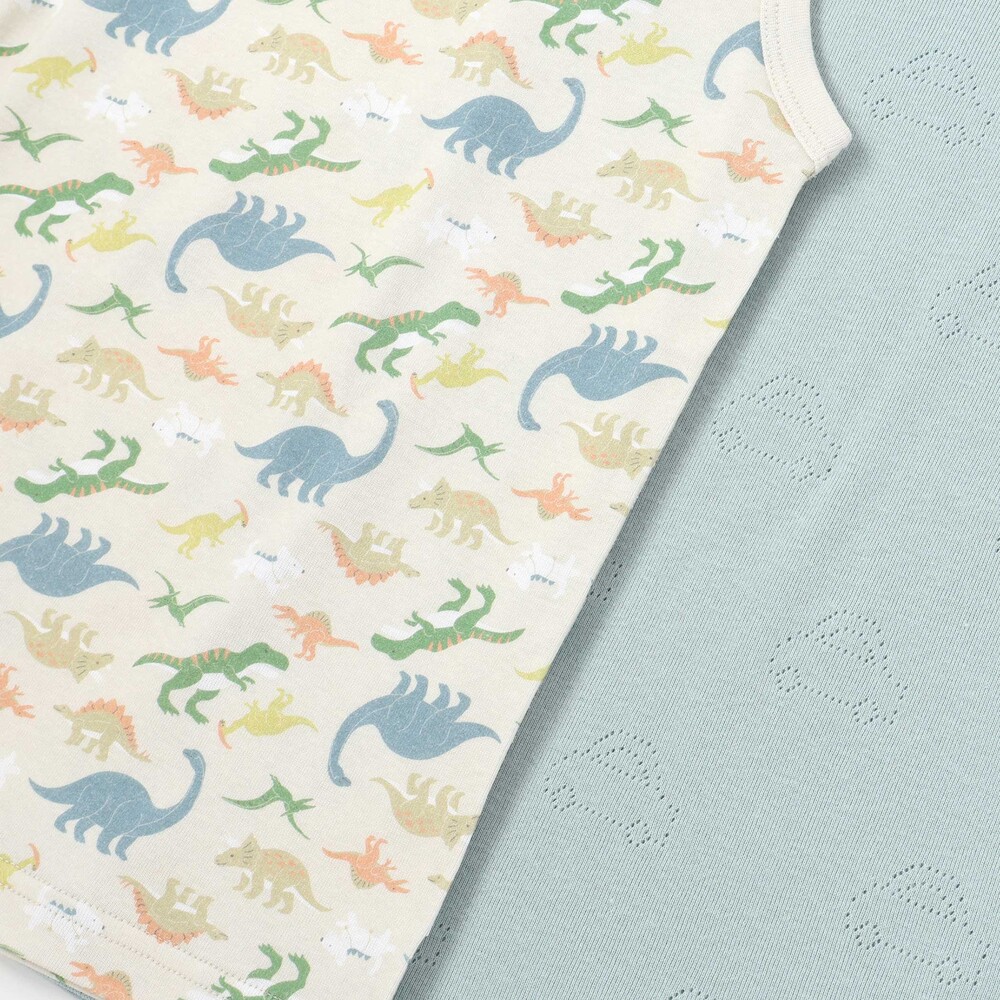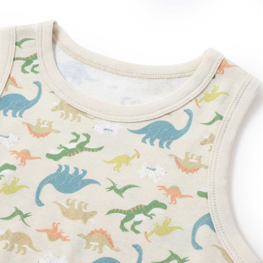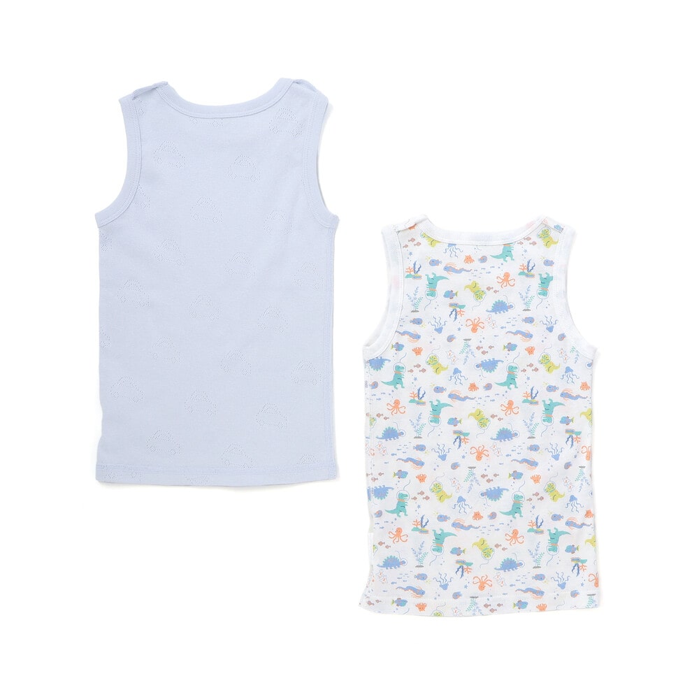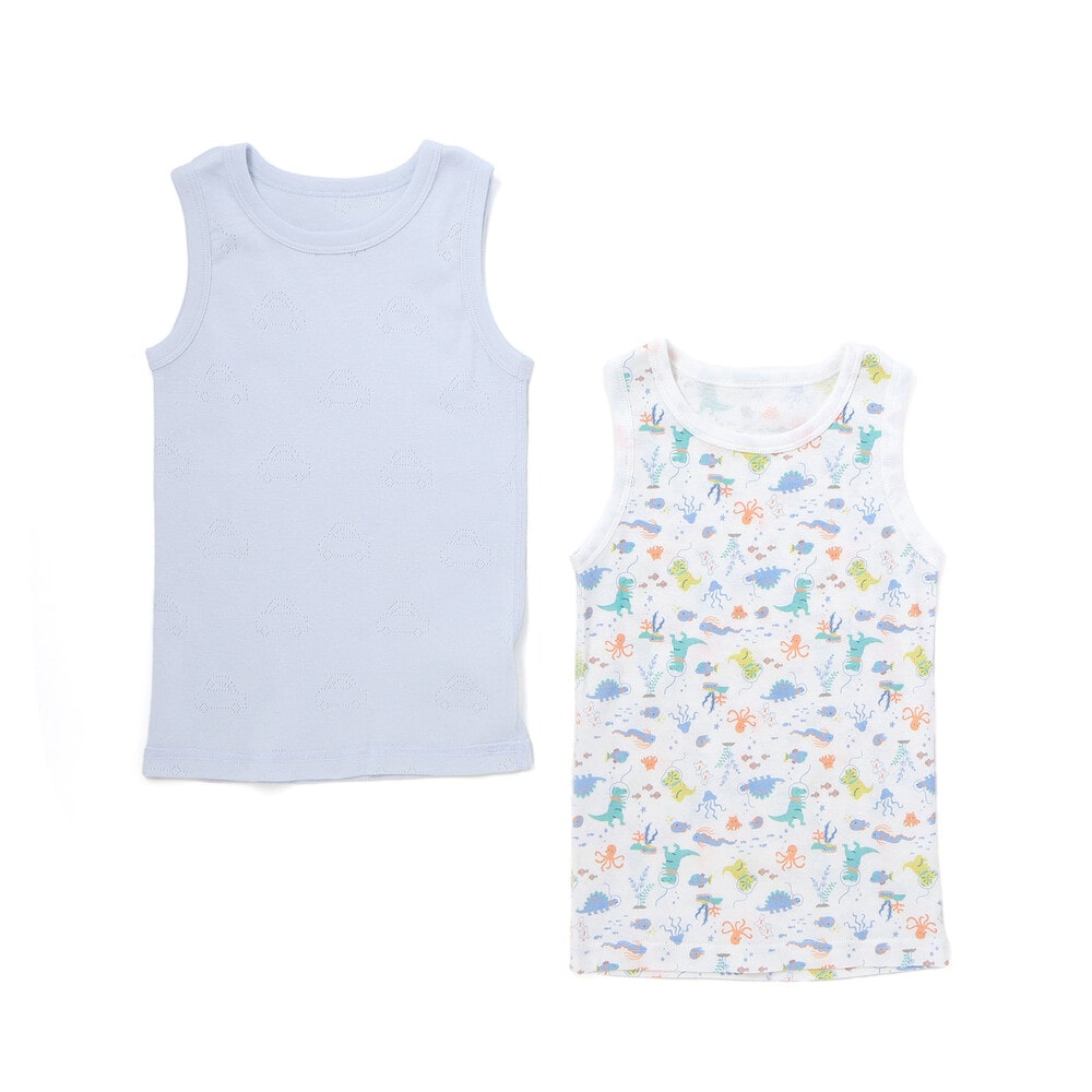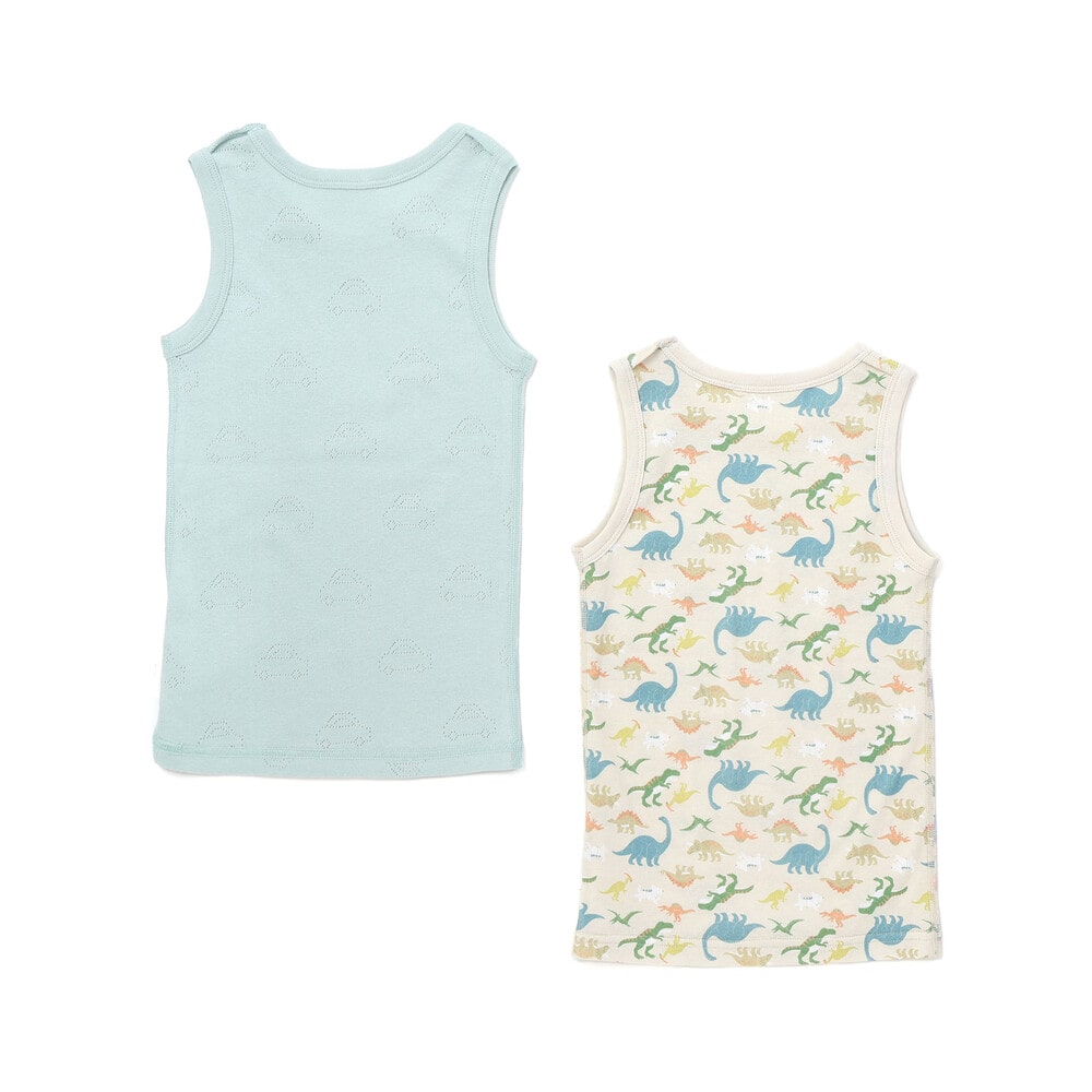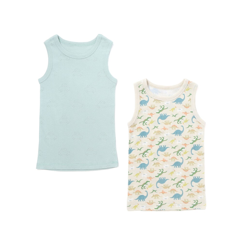 針抜きで描いたくるま柄タンクトップと、楽しい世界観が広がる総柄タンクトップがセットになった、男の子にぴったりのインナー。