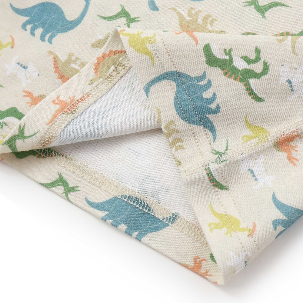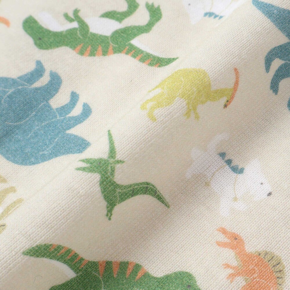 恐竜と犬のお散歩とくるま(グリーン)は、恐竜たちに混ざって、よく見ると恐竜の真似をしたイヌも隠れている、遊び心たっぷりの総柄です。