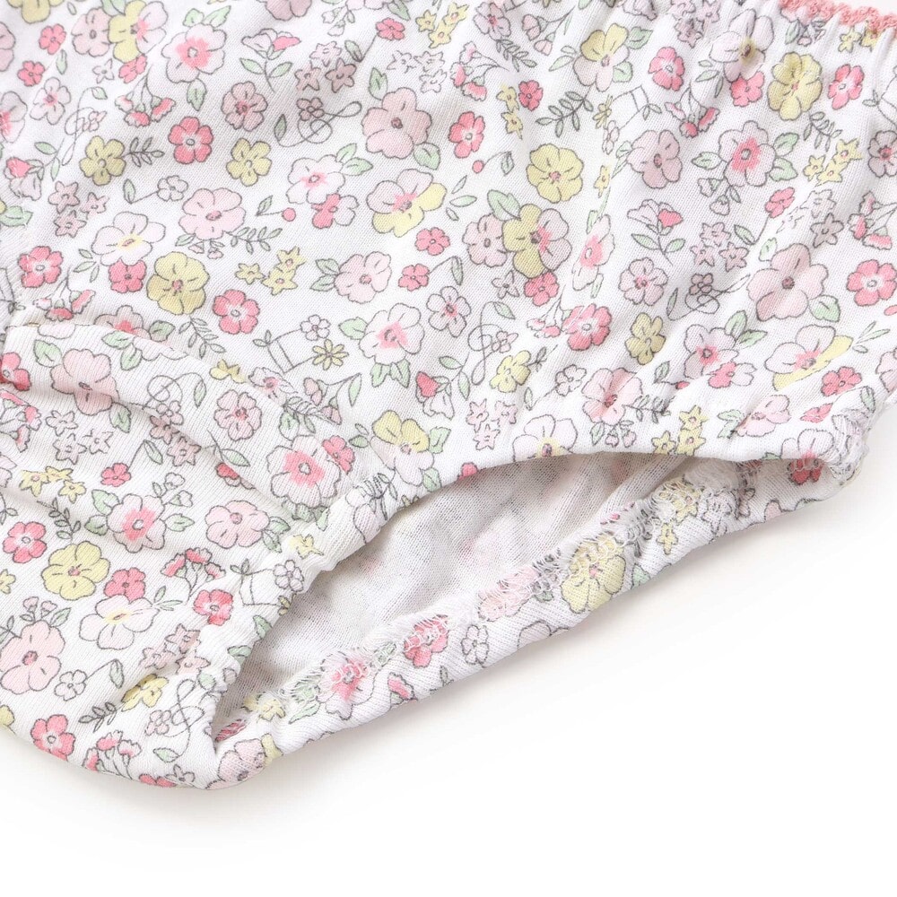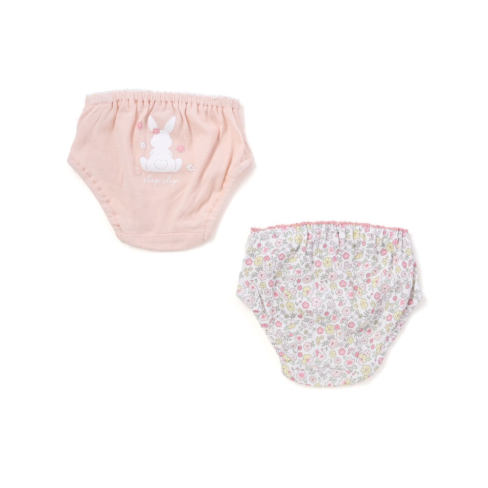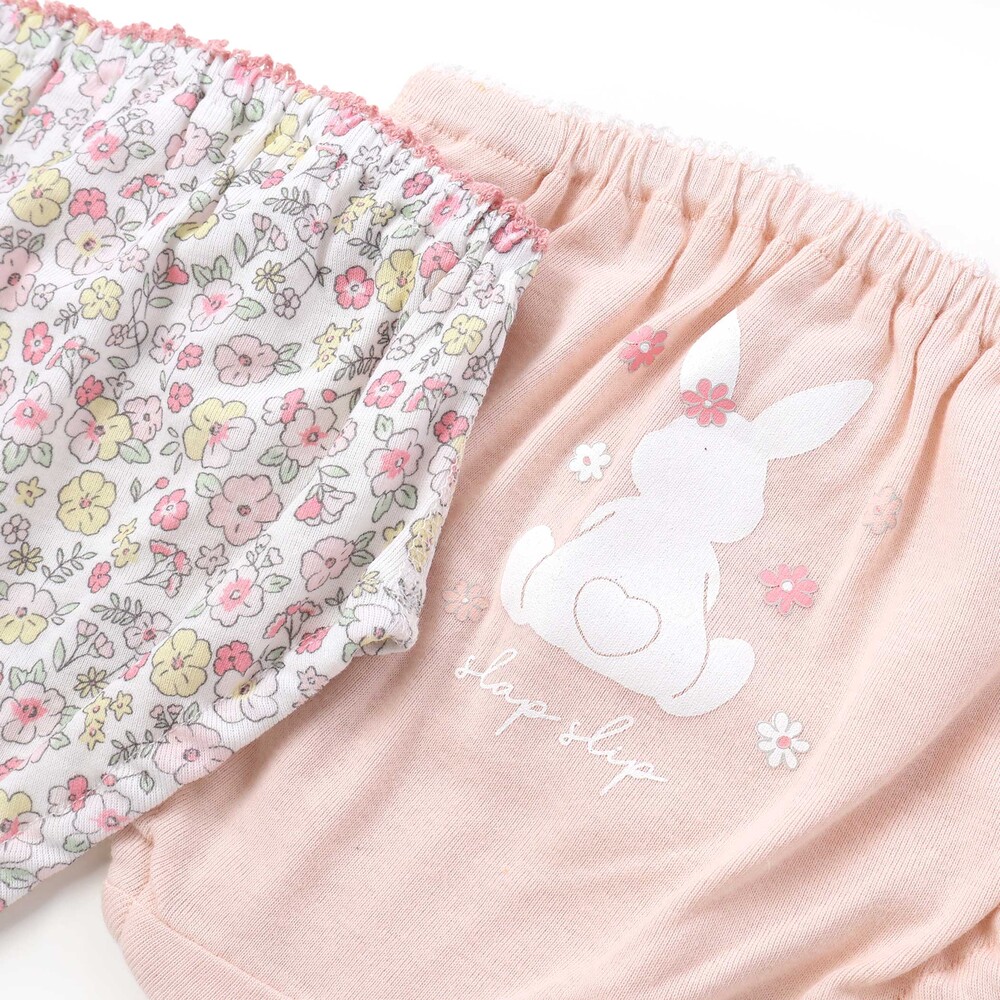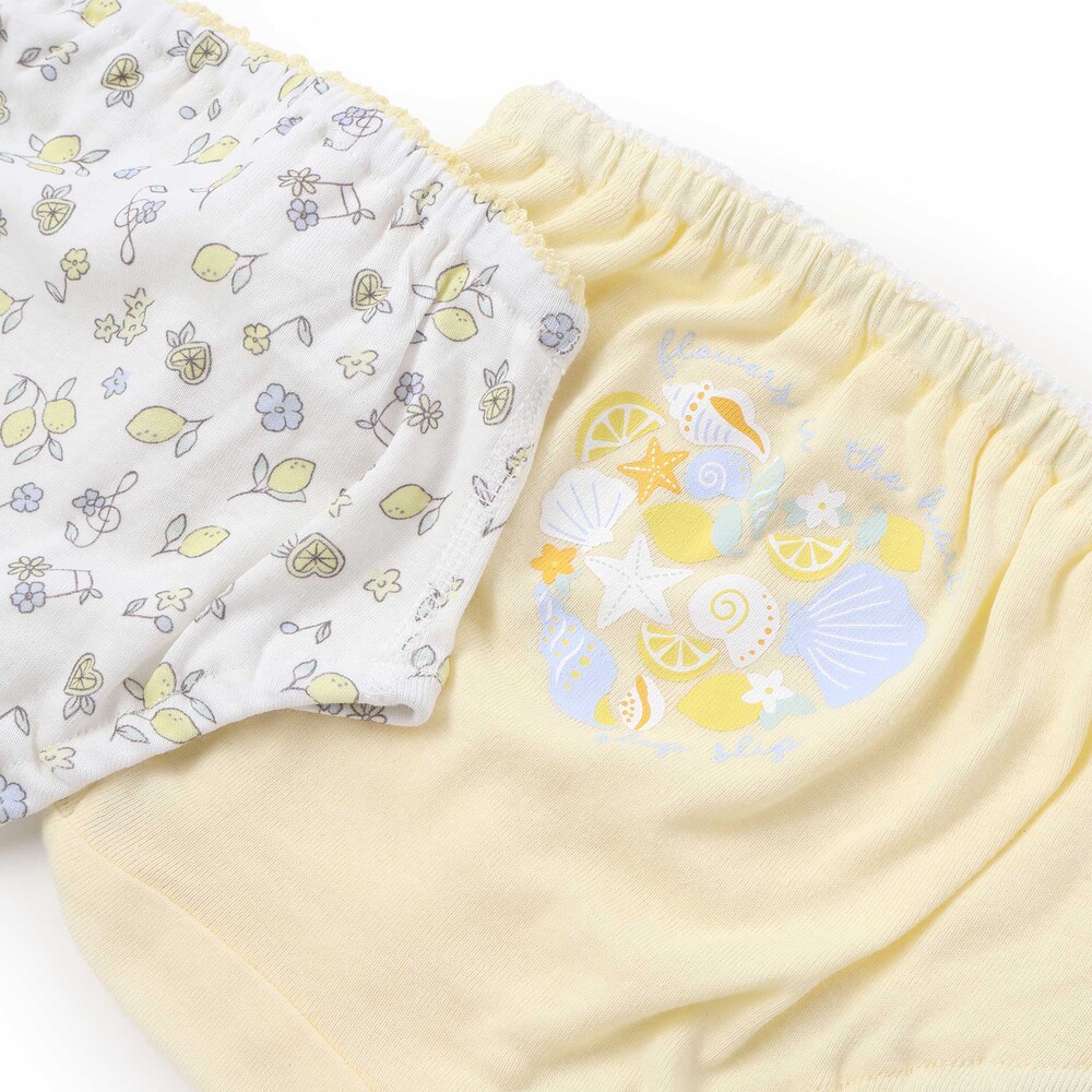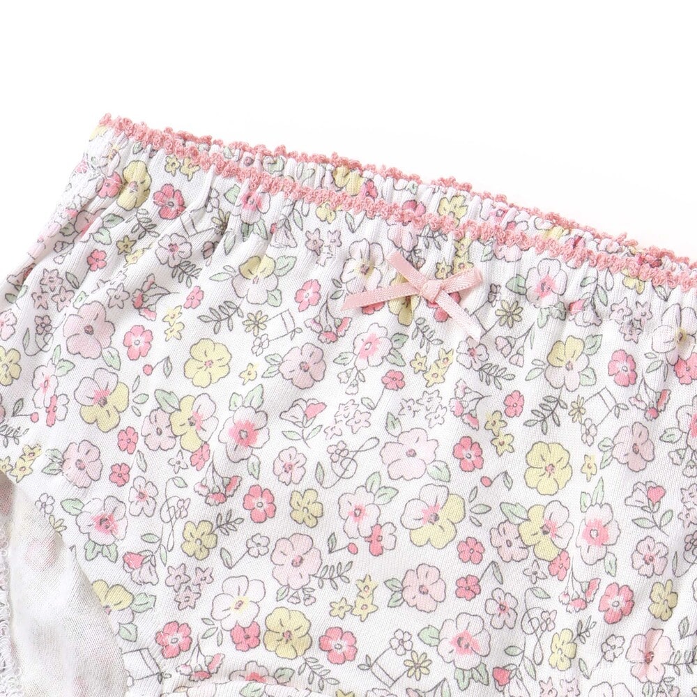 裏側にさりげなくプリントを施した無地タイプと、可憐な総柄ショーツがセットになった女の子用アイテム。