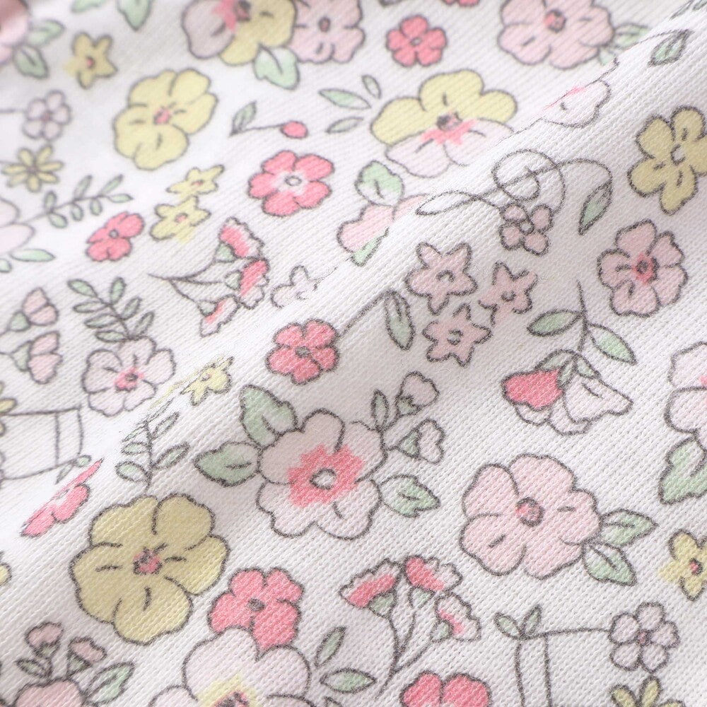 しっぽハートうさぎと花柄(ピンク)は、後ろ姿のウサギがちょこんと描かれた愛らしい一枚と、ピンク系フラワーが広がる華やかな総柄の組み合わせ。