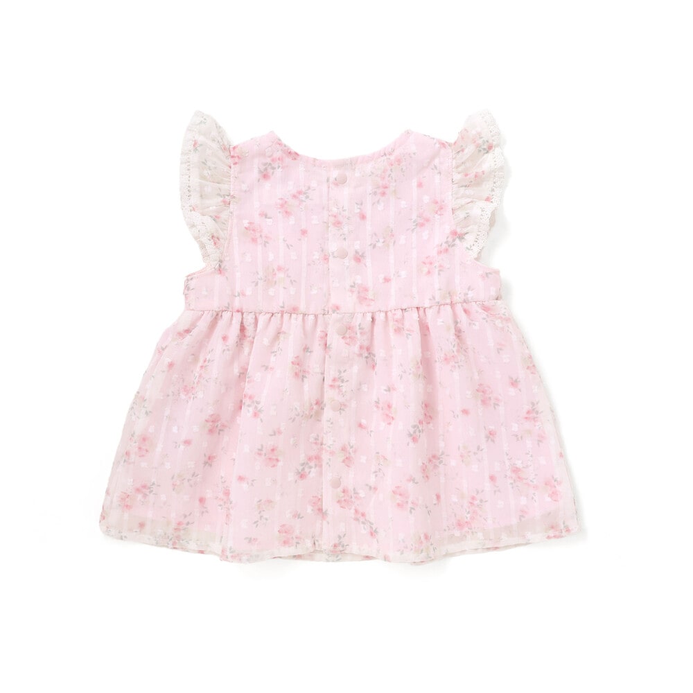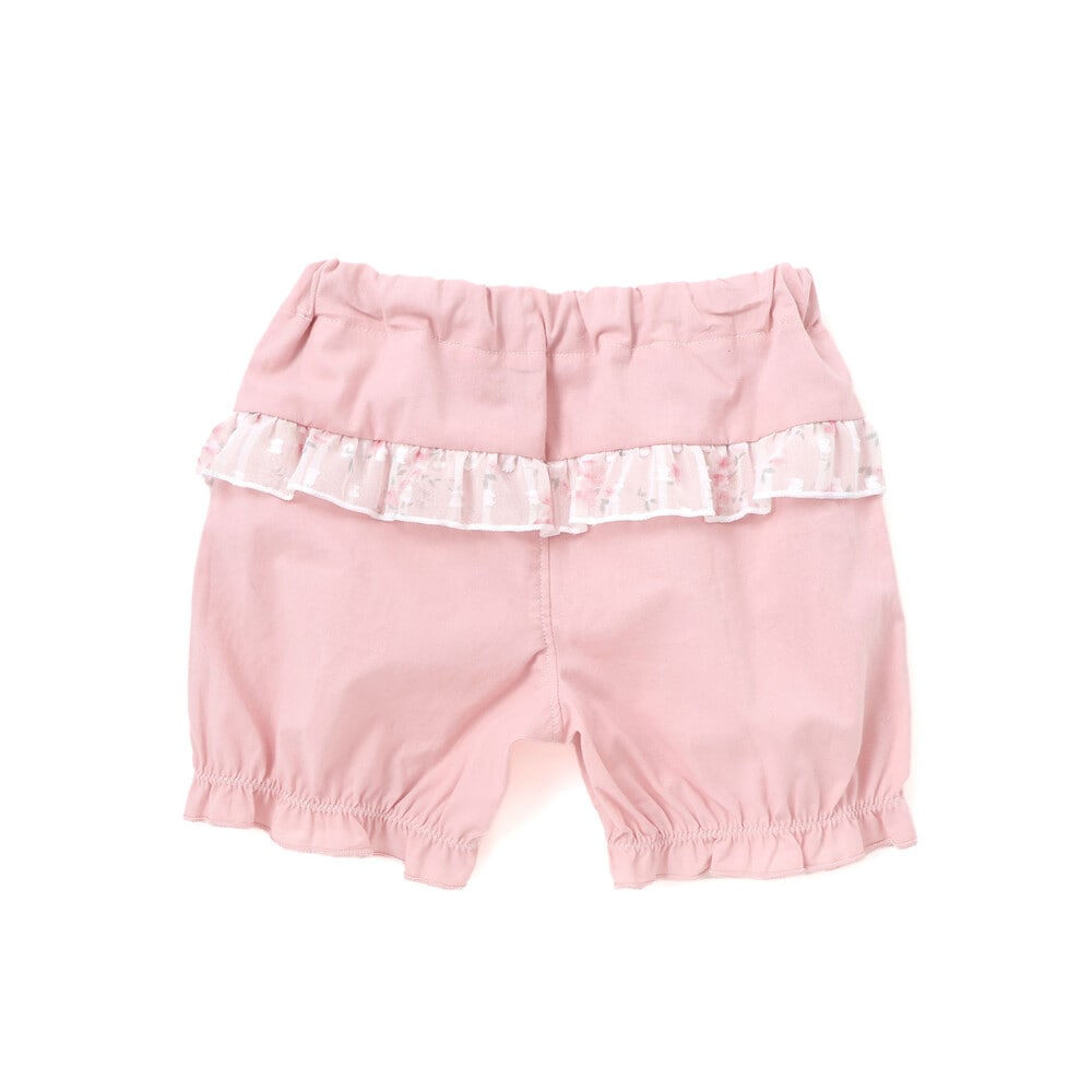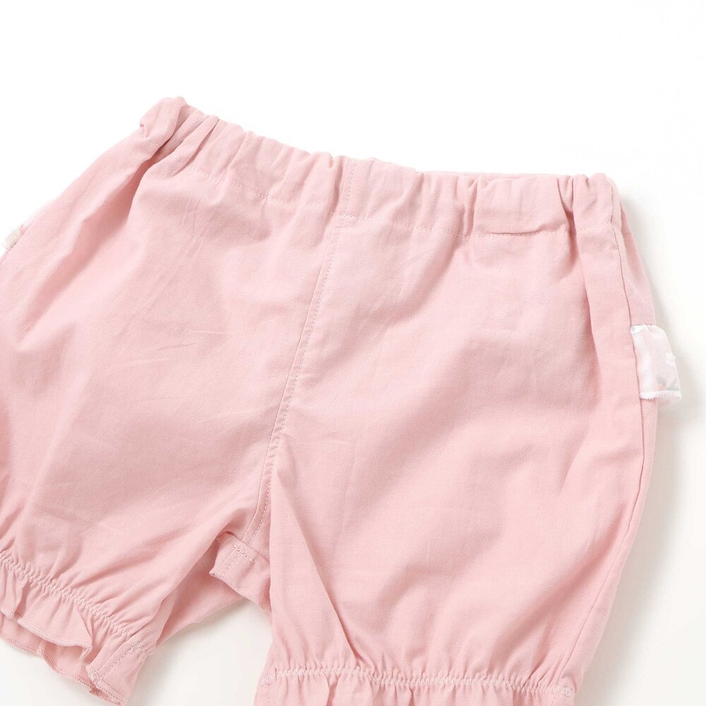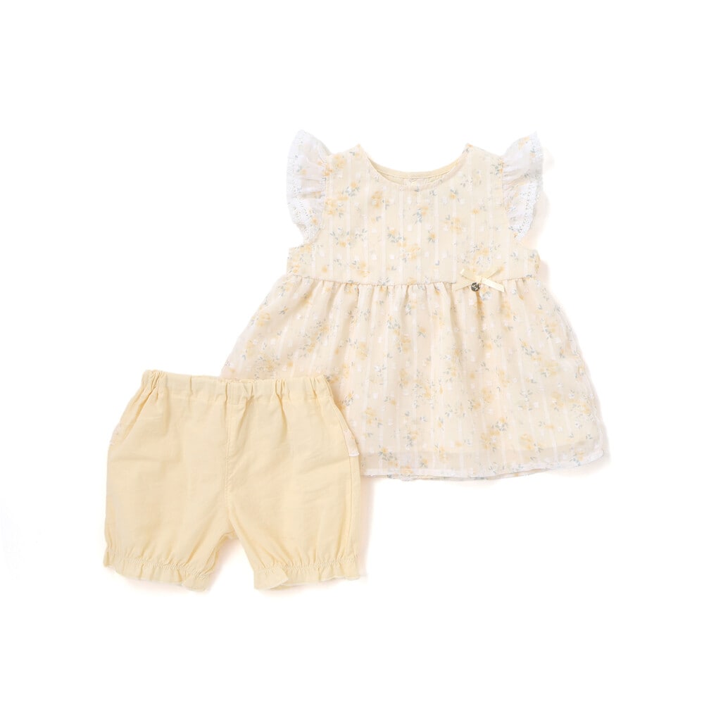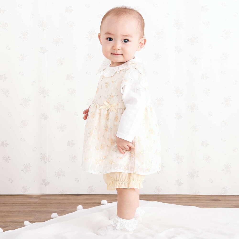 やさしい色合いとふんわりシルエットが愛らしい、女の子ベビー用のワンピースとブルマの2点セット。