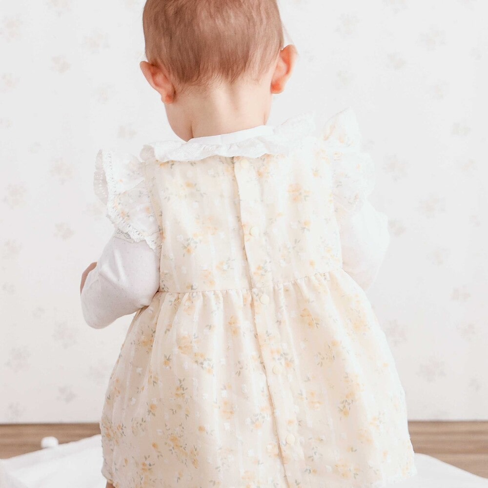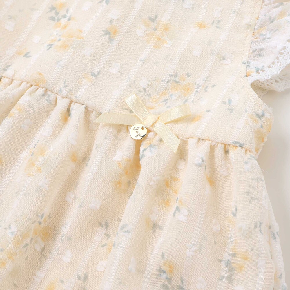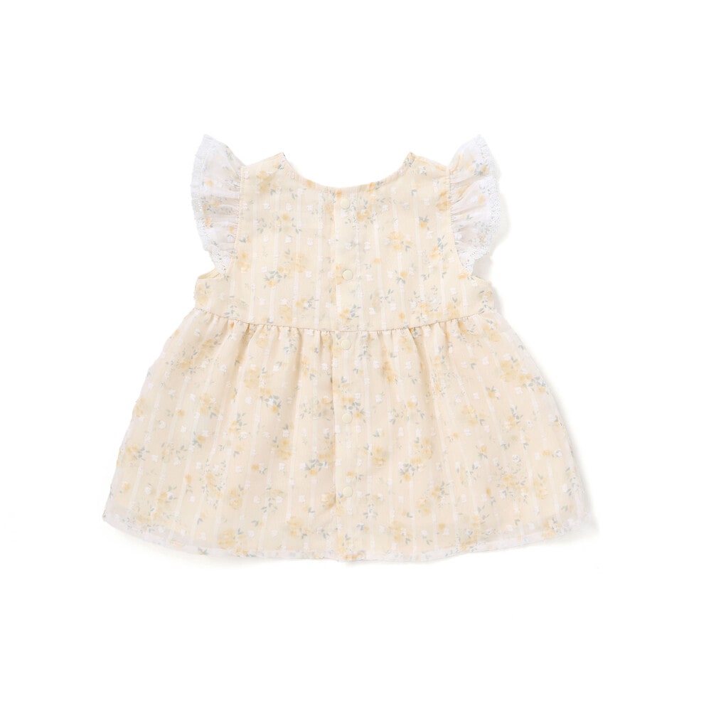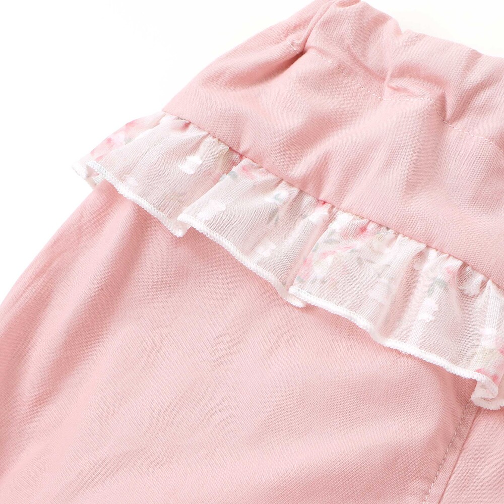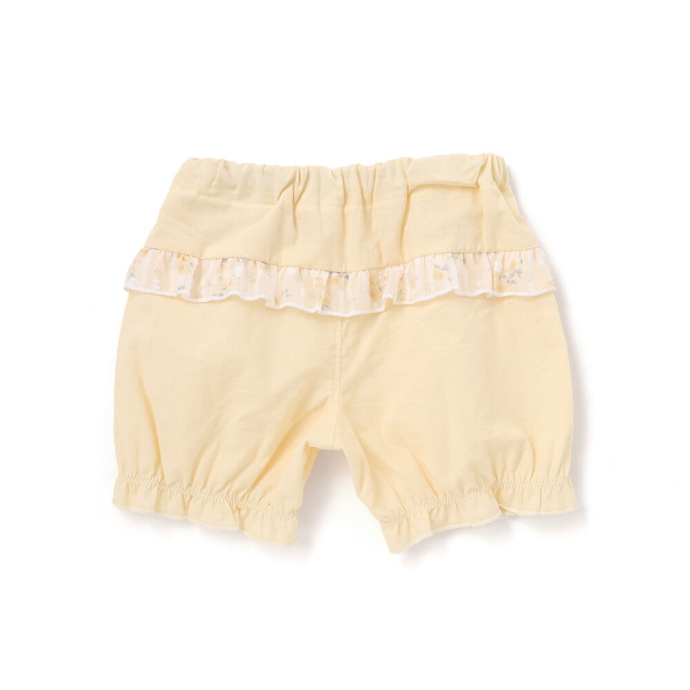 やさしい色合いとふんわりシルエットが愛らしい、女の子ベビー用のワンピースとブルマの2点セット。