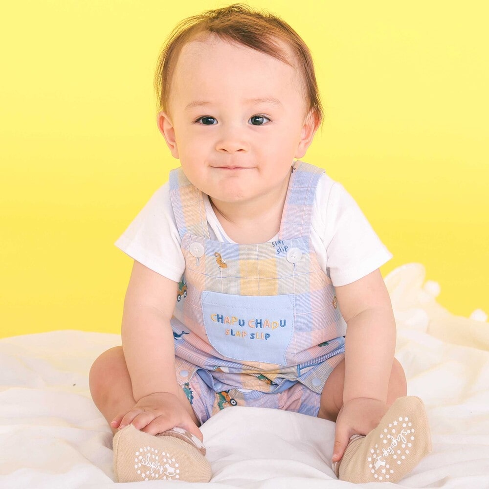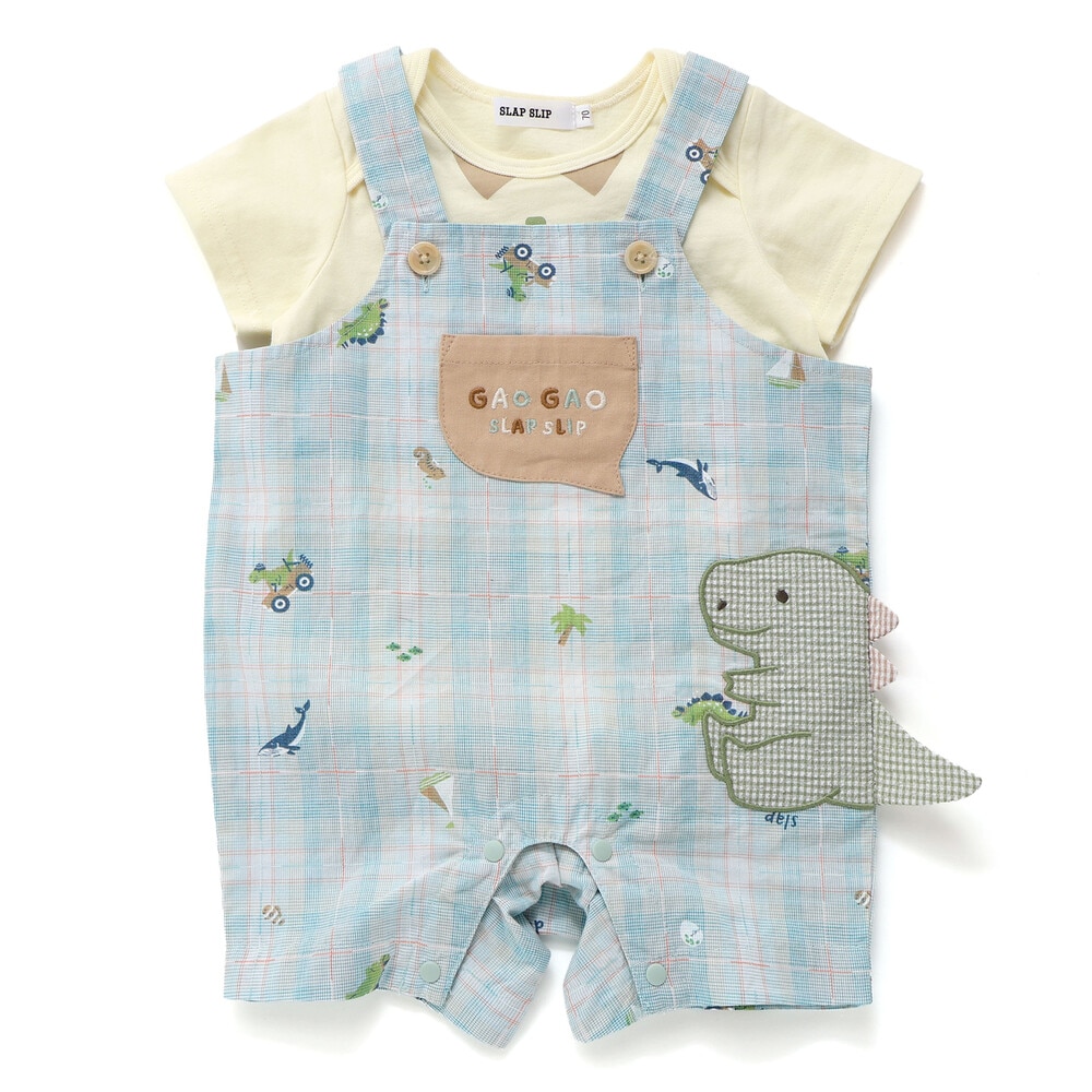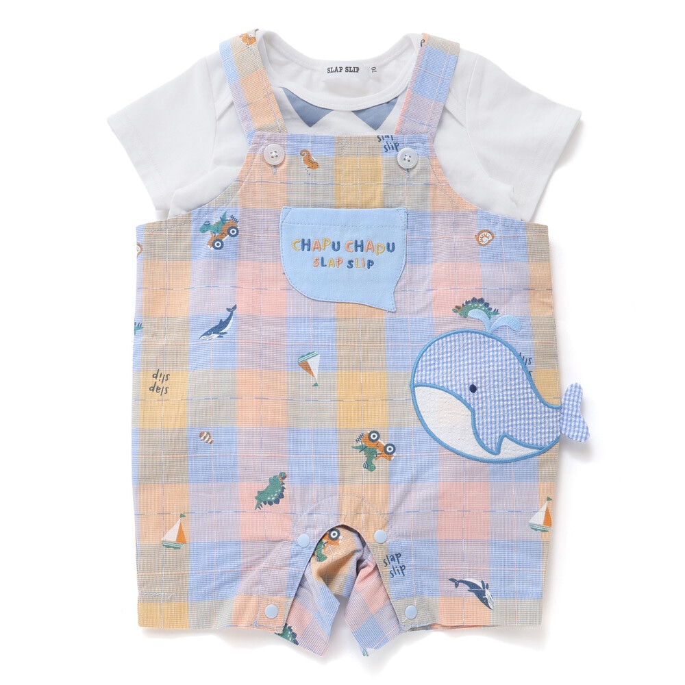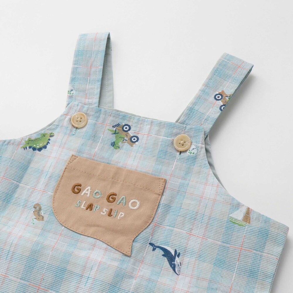 カラーごとに異なるモチーフが可愛らしい、男の子ベビー用チェック柄サロペットとボディミニのセット。