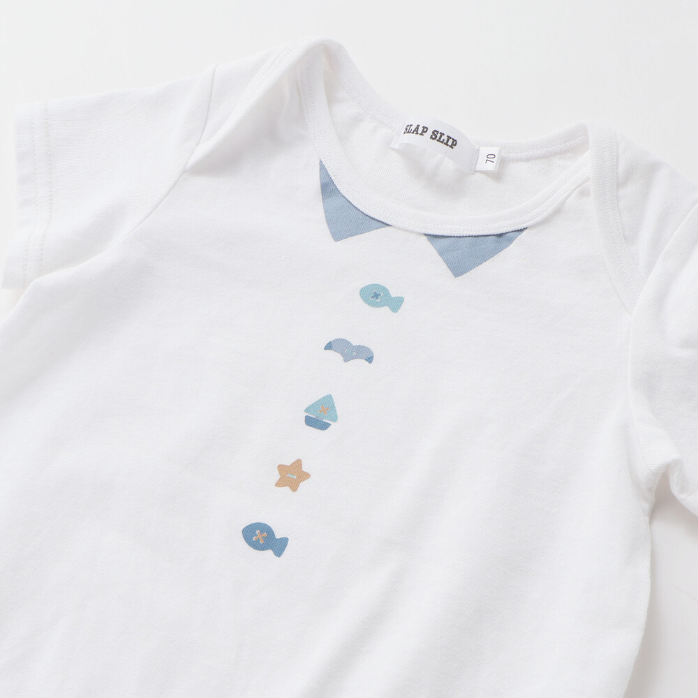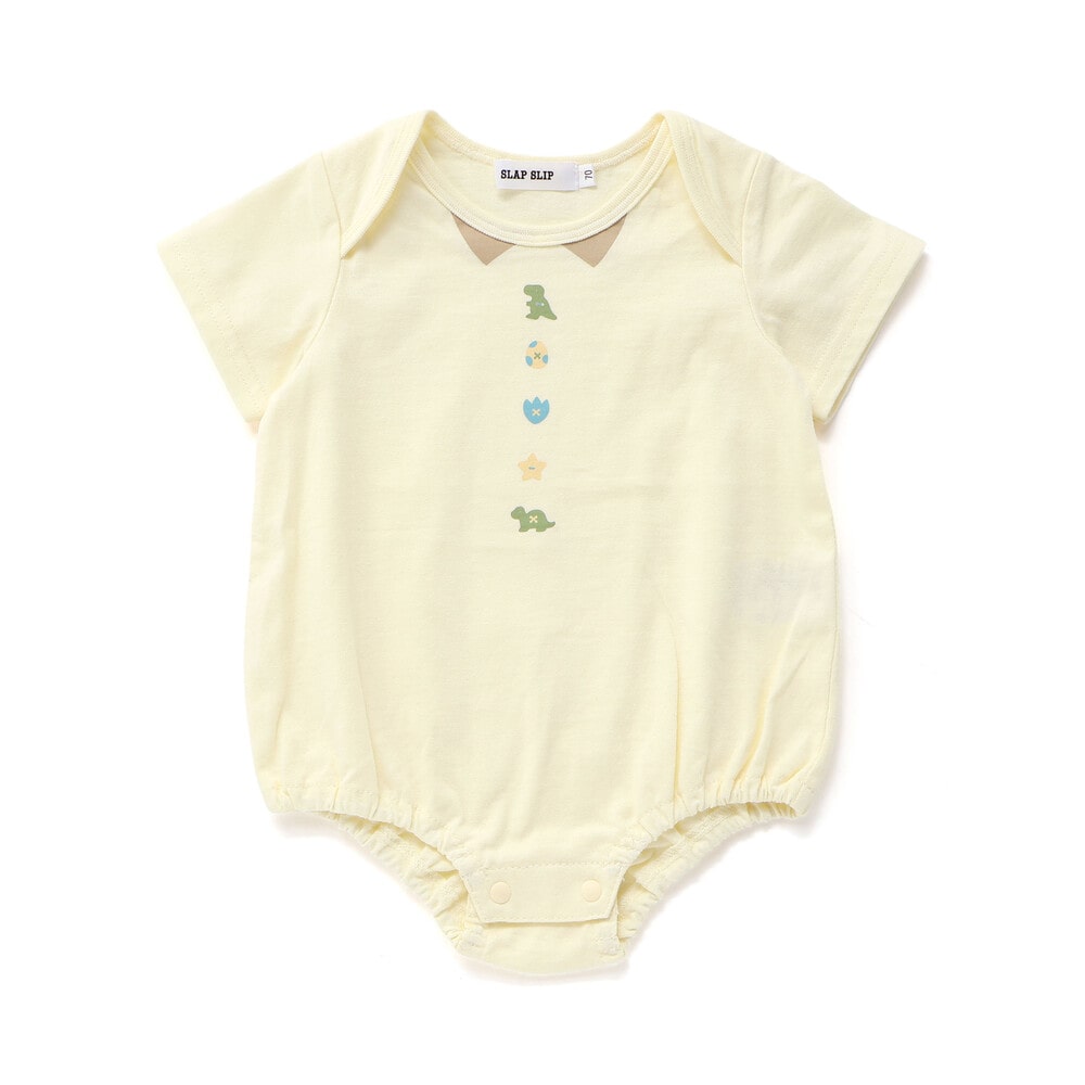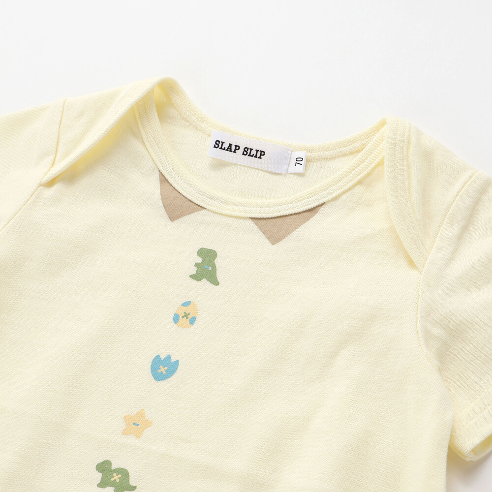 セットのボディミニは、襟元のプリントの下にカラーごとに異なるモチーフが並び、サロペットとのコーディネートがより楽しくなるデザイン。