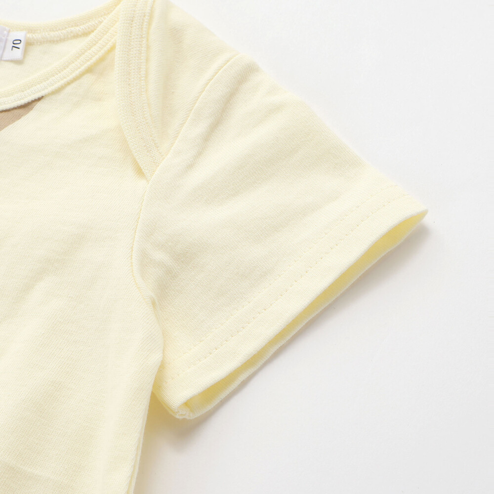サロペットはしっかりとした布帛素材でシルエットがきれいに見え、ボディミニは柔らかく肌馴染みの良い天竺素材を使用し、赤ちゃんが快適に過ごせる着心地に。