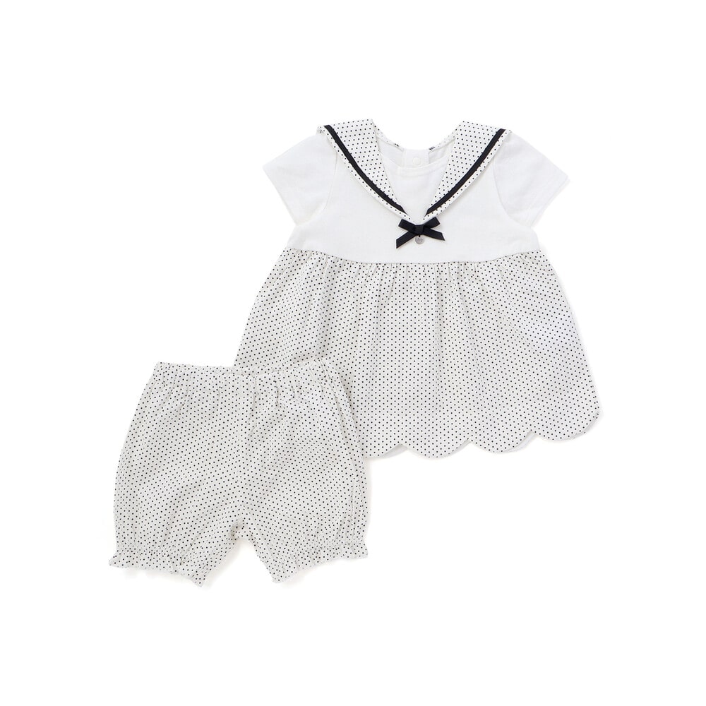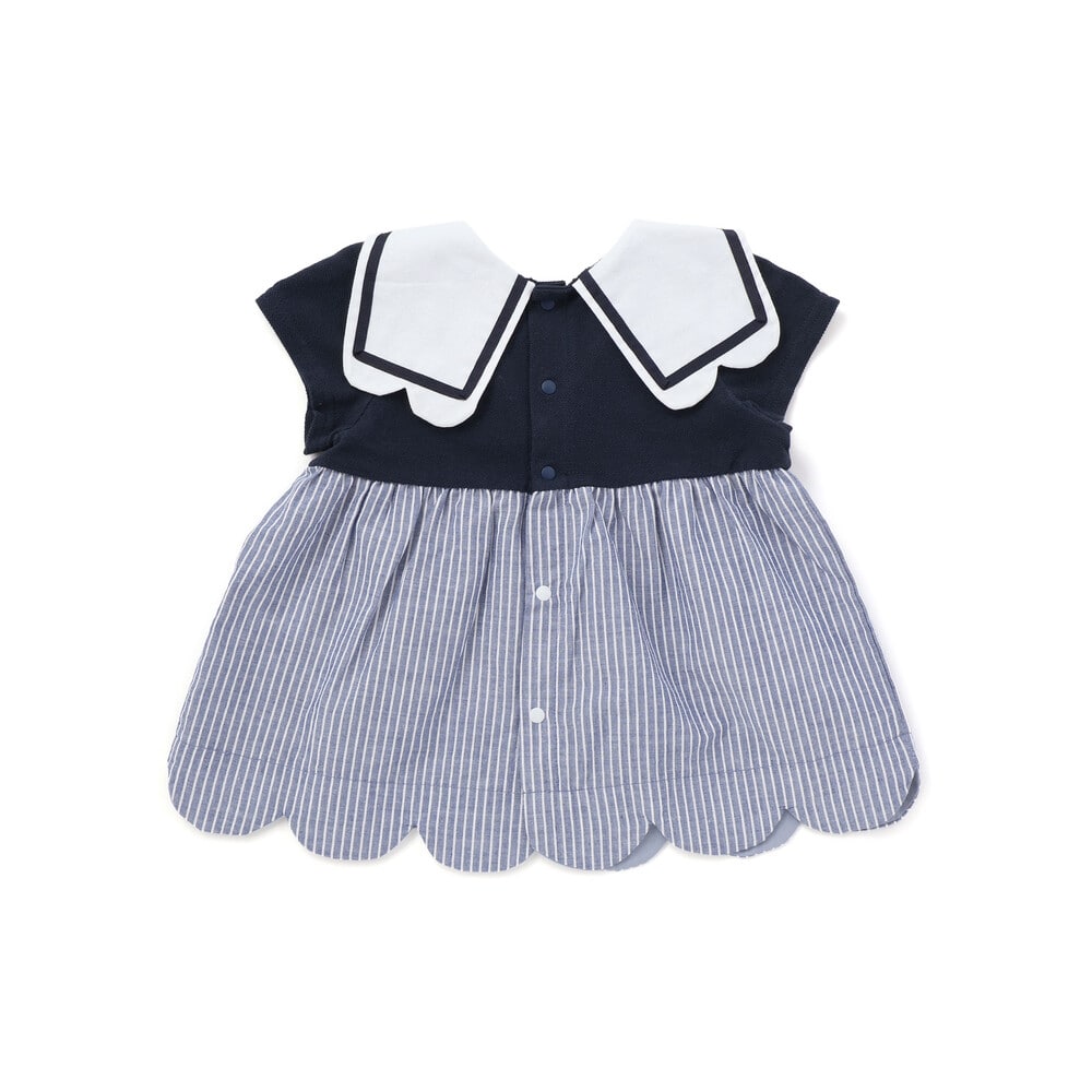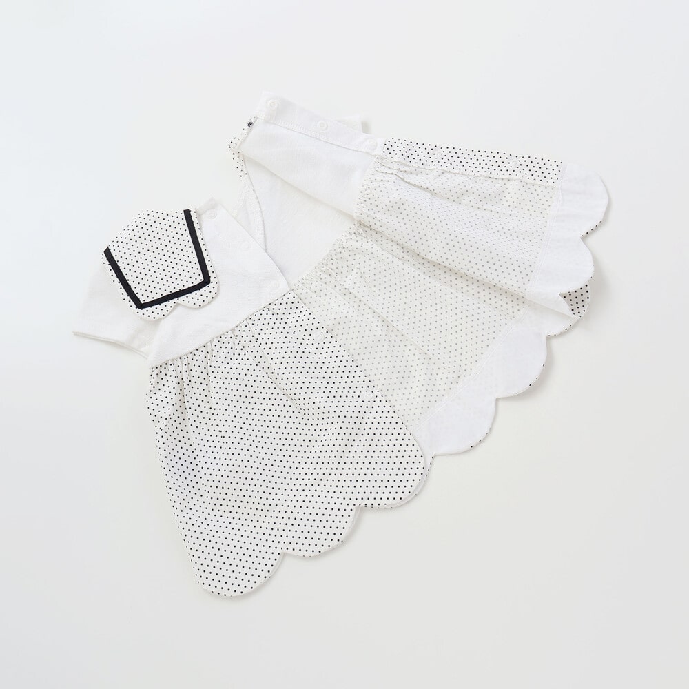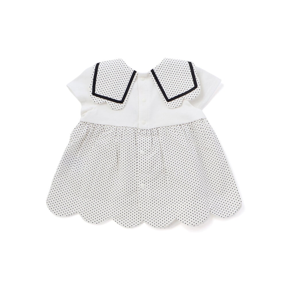 ワンピースは、縁にほどこした可憐なスカラップが目を引く大きめの襟にちょこんとリボンをのせた、思わず写真に残したくなる愛らしいデザイン。