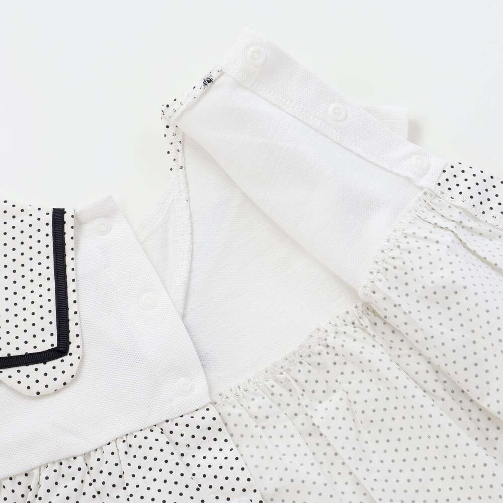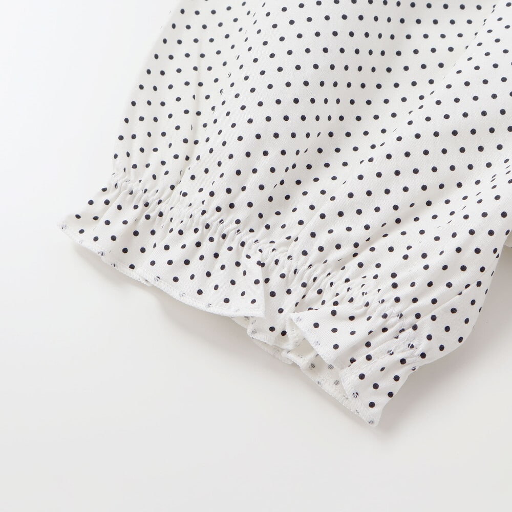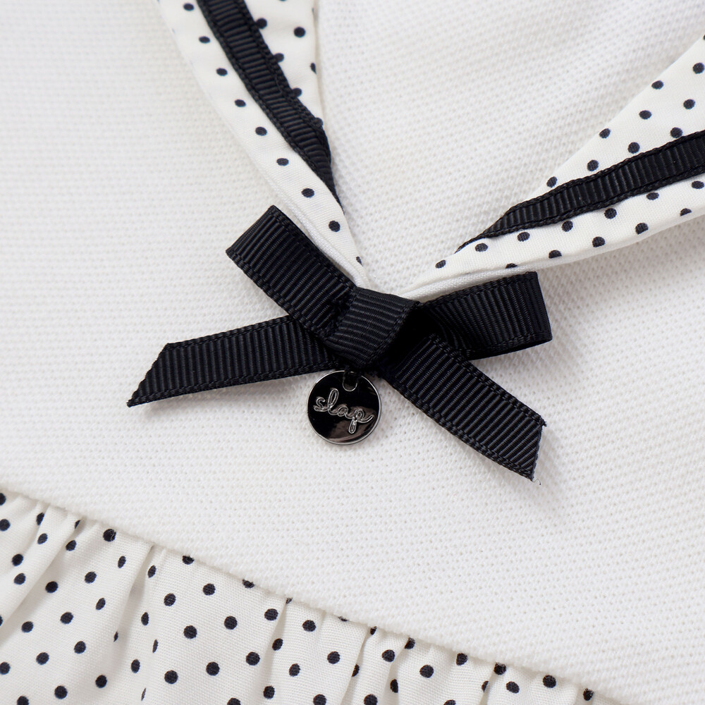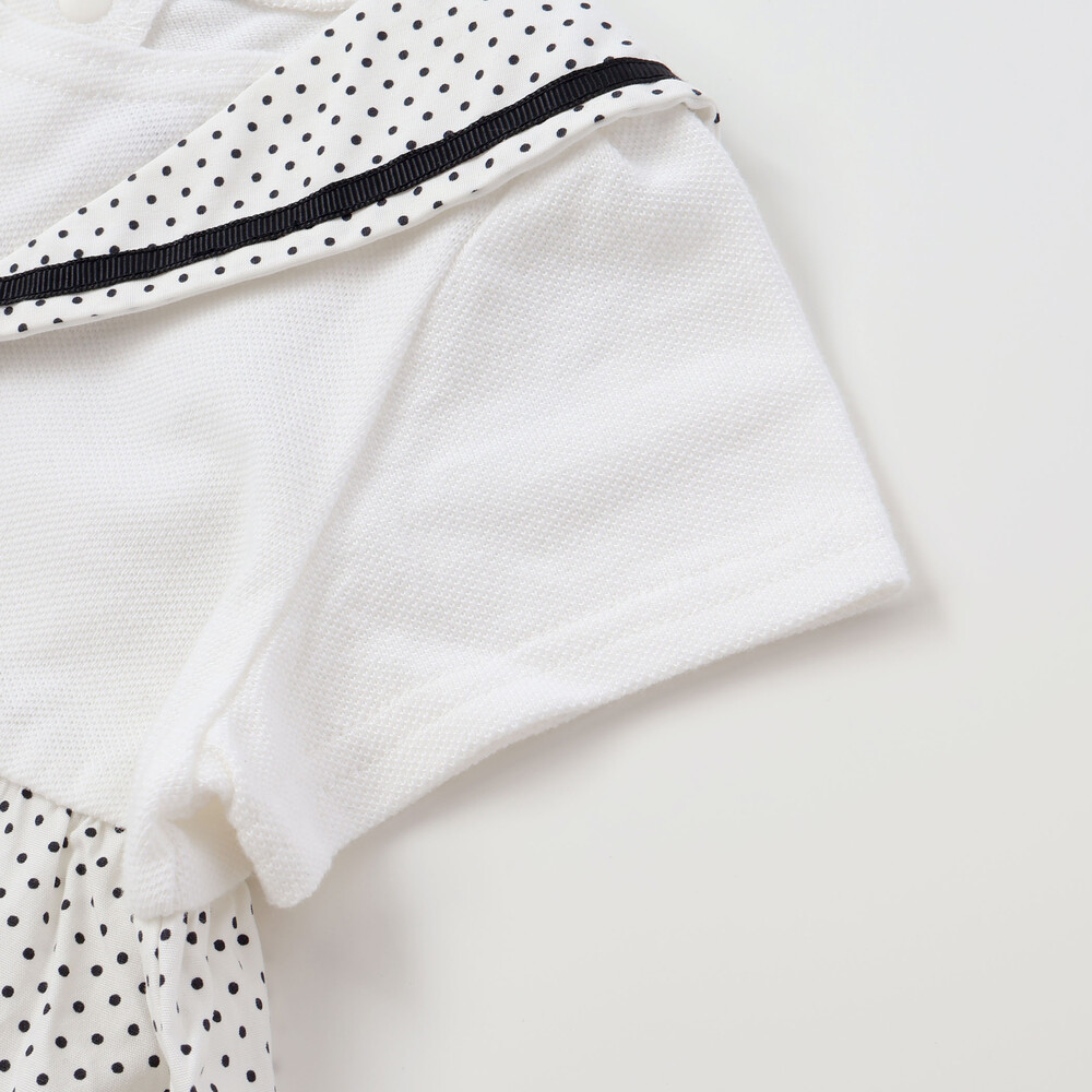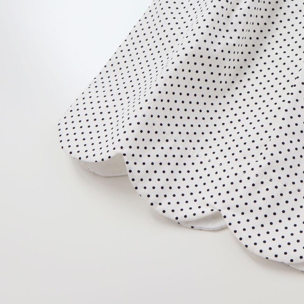 ワンピースは、縁にほどこした可憐なスカラップが目を引く大きめの襟にちょこんとリボンをのせた、思わず写真に残したくなる愛らしいデザイン。