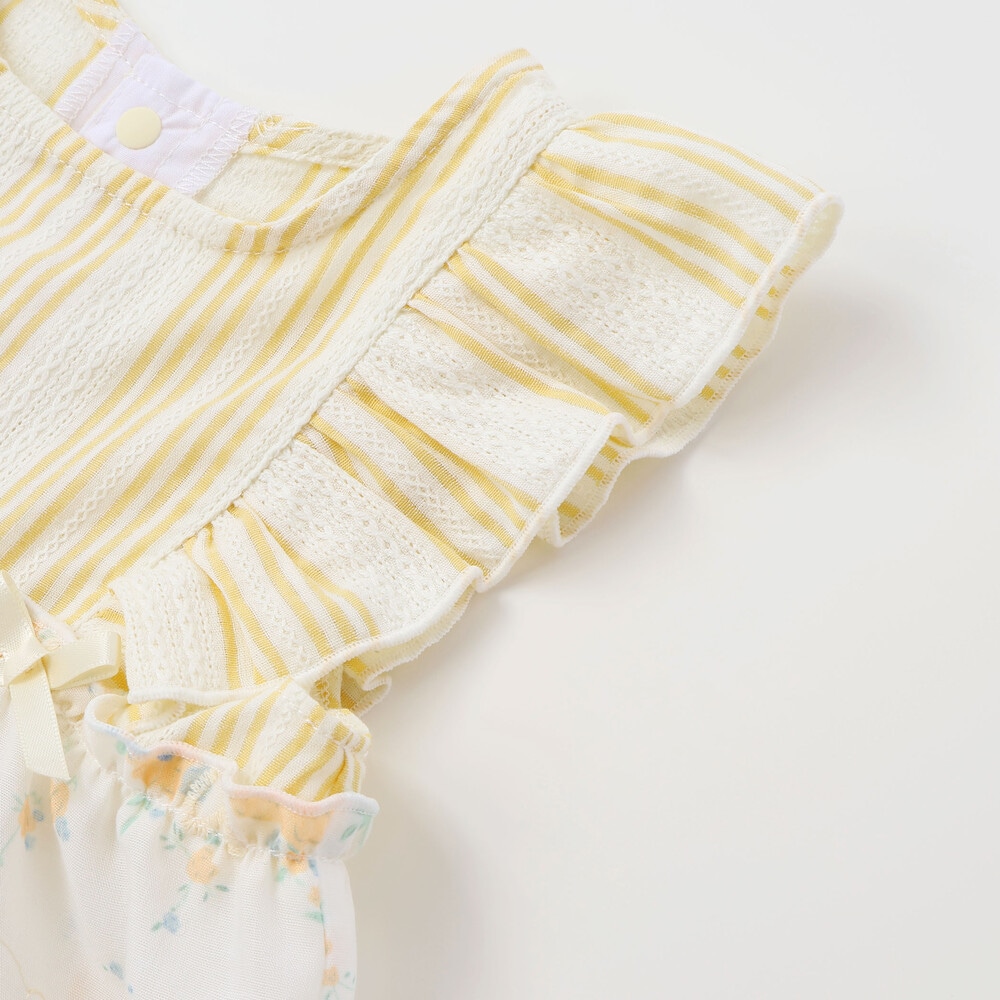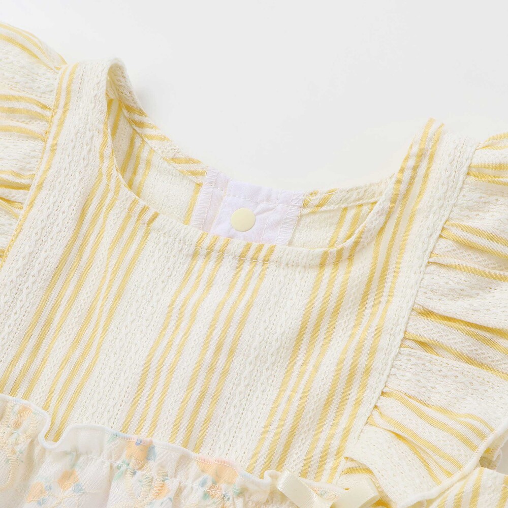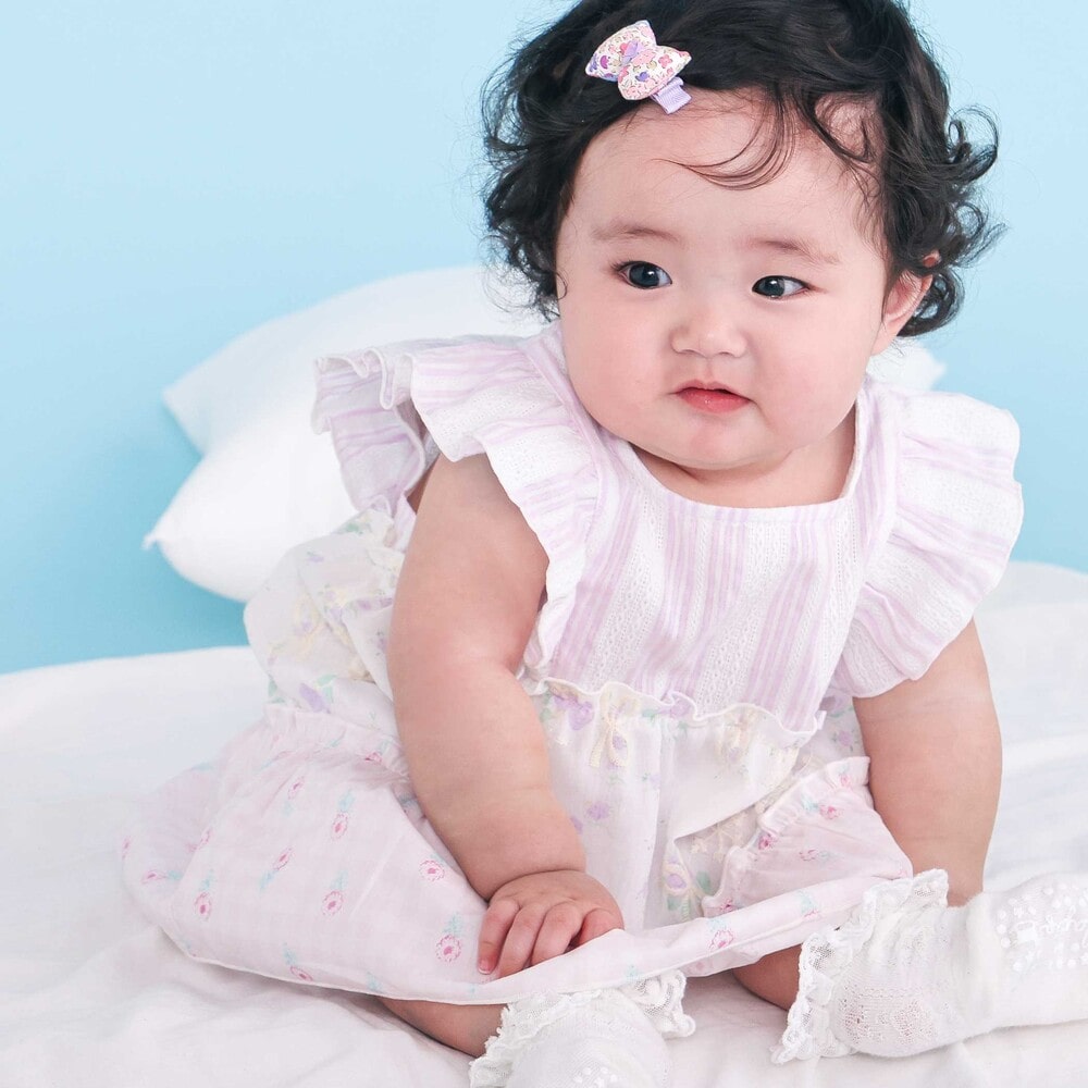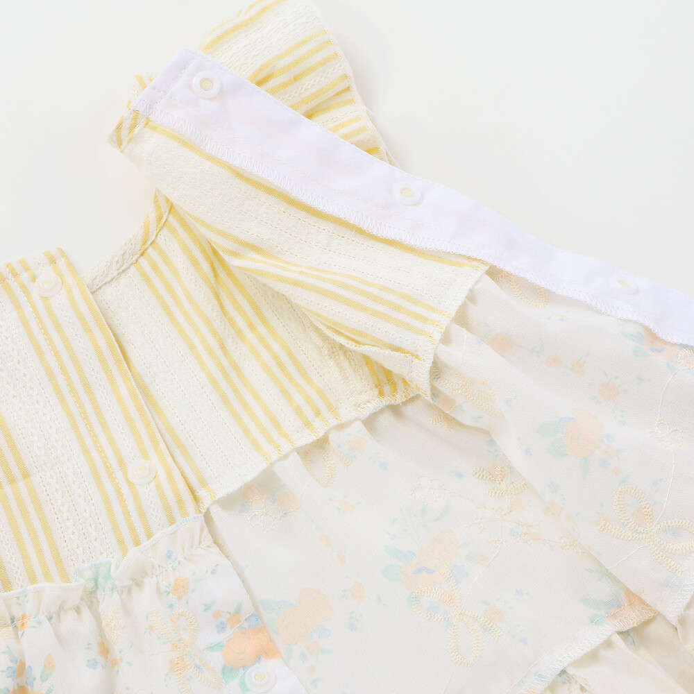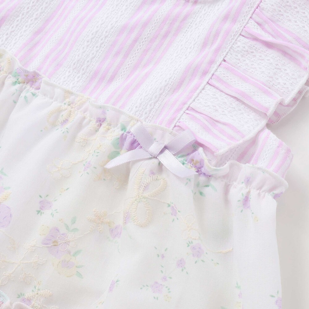 爽やかなストライプに、やわらかなホワイトベースの花柄レース、そしてカラーごとに異なる花柄生地がふわっと重なるティアードは、動くたびに揺れて、ベビーならではの華やかさとやさしい雰囲気をまといます。