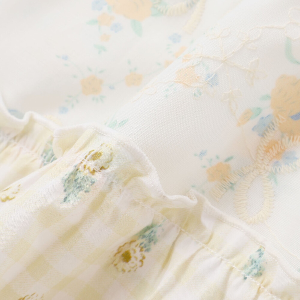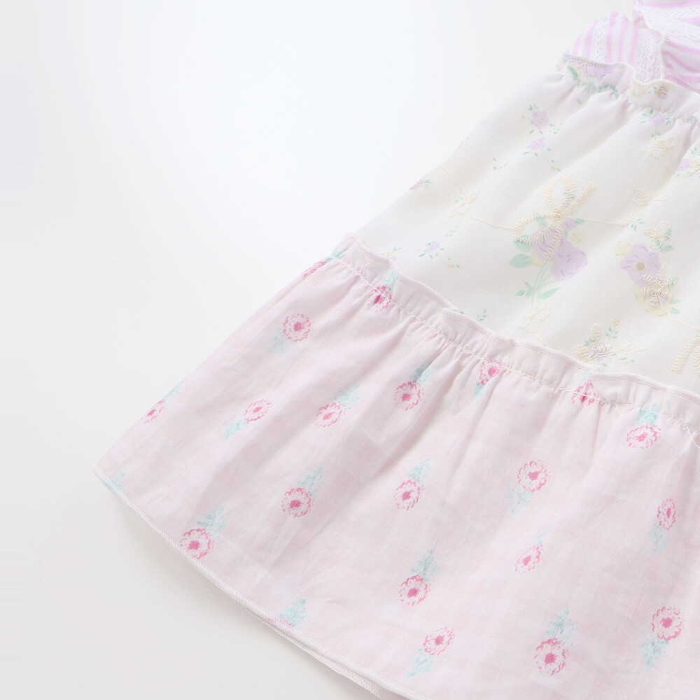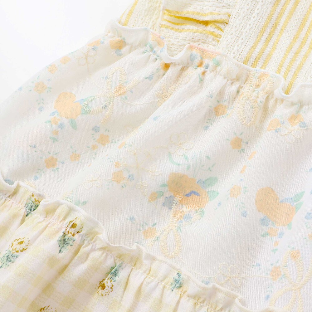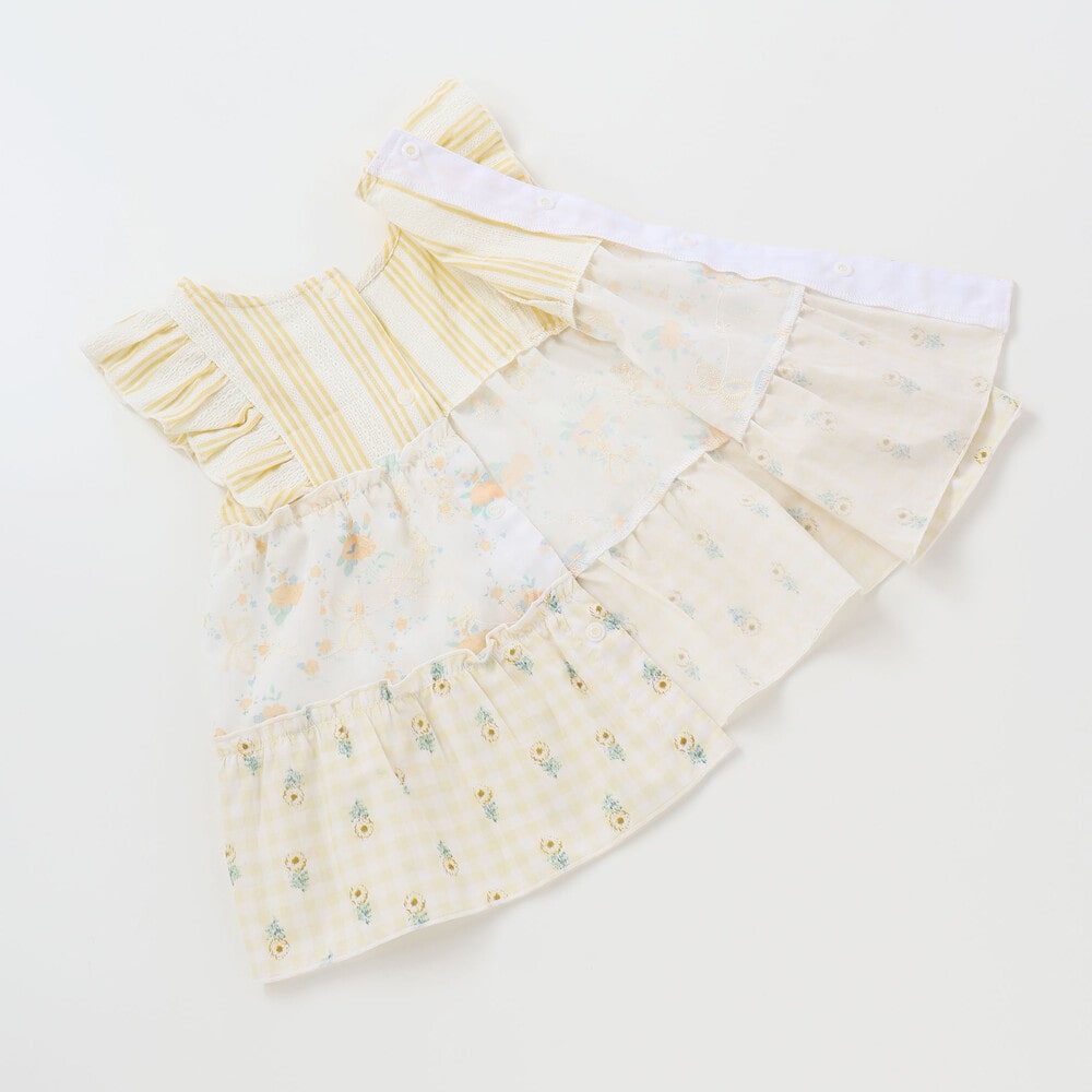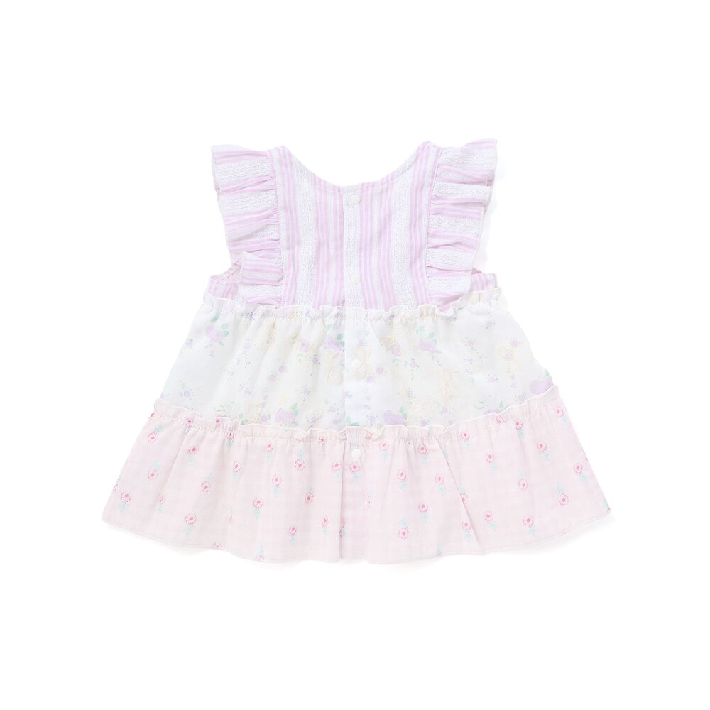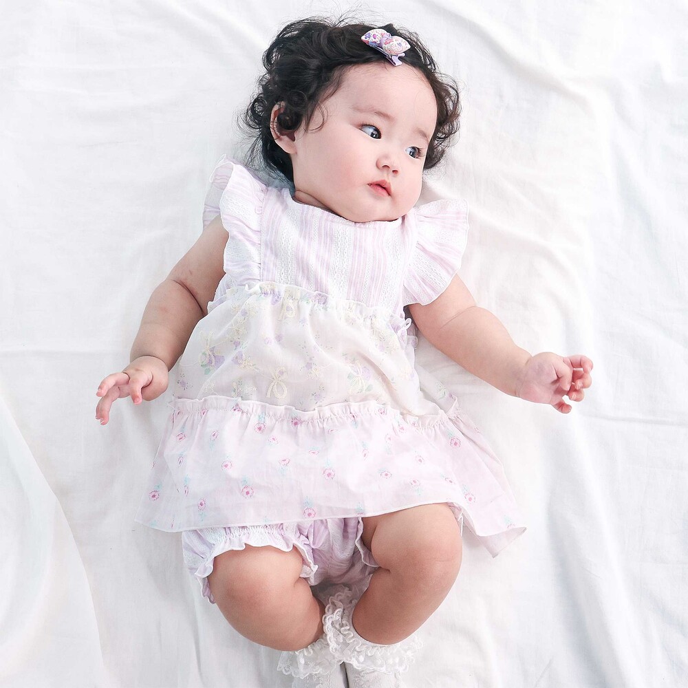 爽やかなストライプに、やわらかなホワイトベースの花柄レース、そしてカラーごとに異なる花柄生地がふわっと重なるティアードは、動くたびに揺れて、ベビーならではの華やかさとやさしい雰囲気をまといます。