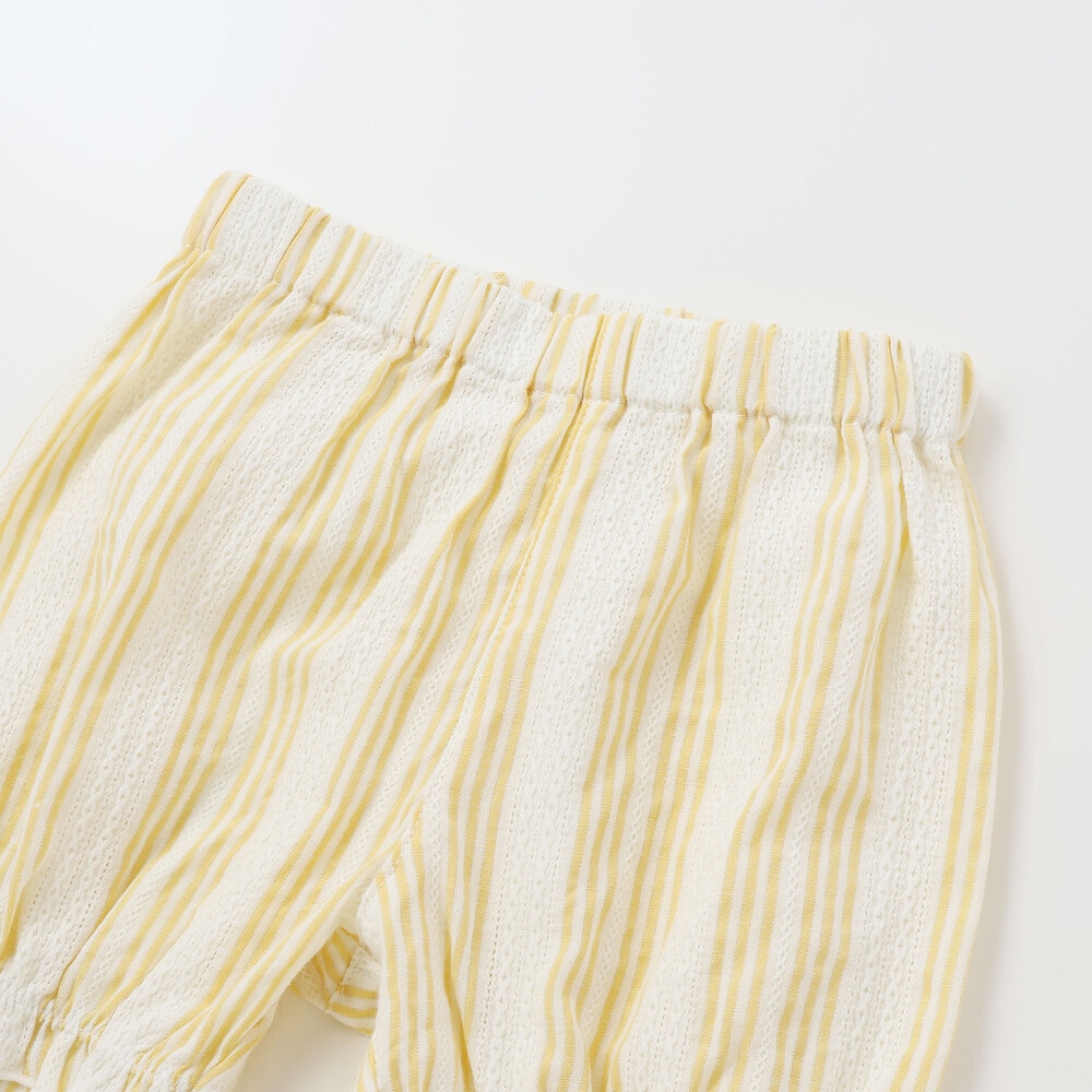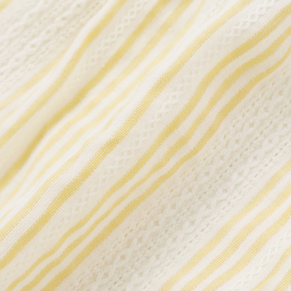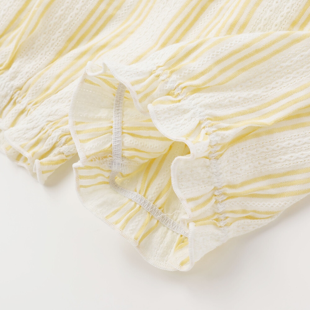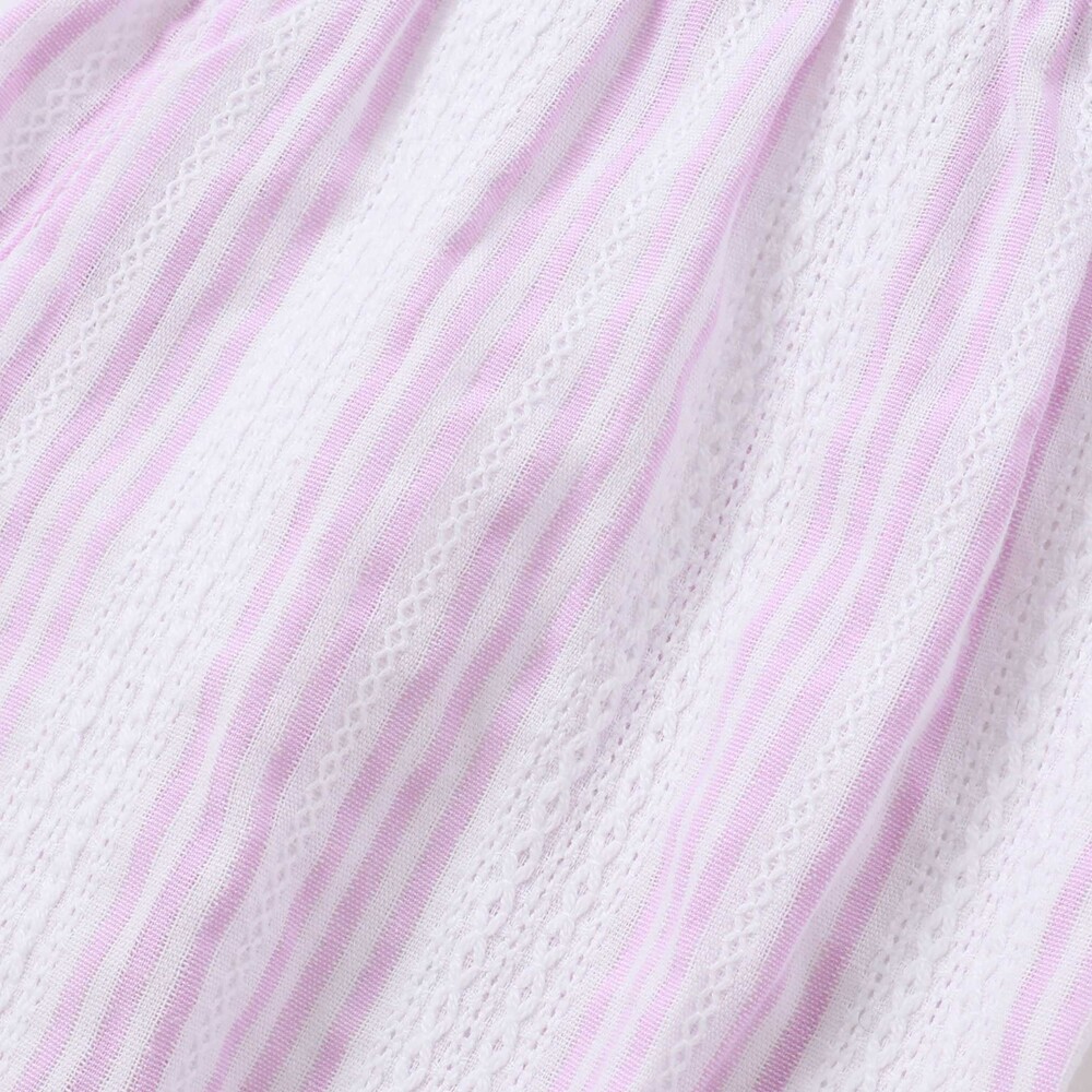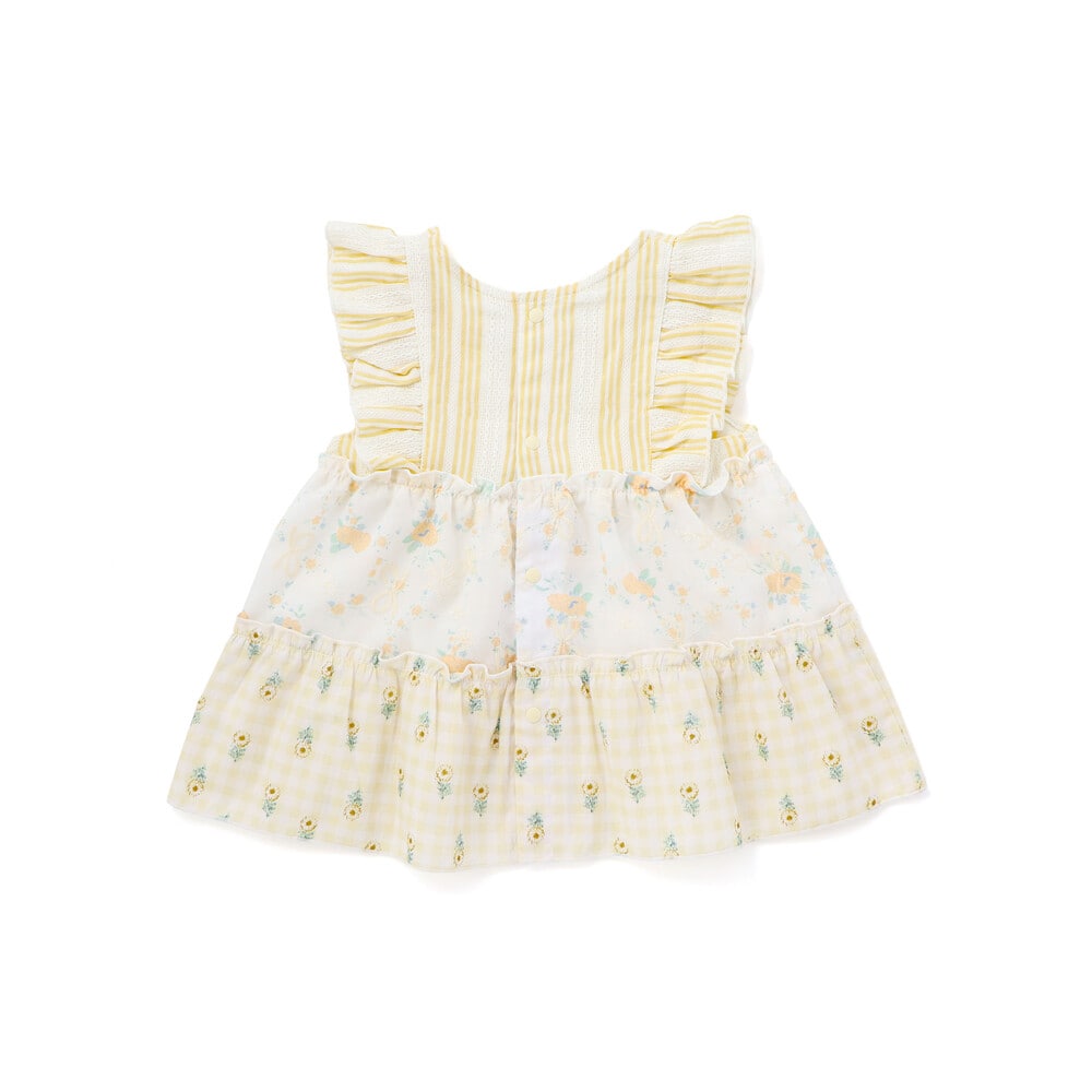 爽やかなストライプに、やわらかなホワイトベースの花柄レース、そしてカラーごとに異なる花柄生地がふわっと重なるティアードは、動くたびに揺れて、ベビーならではの華やかさとやさしい雰囲気をまといます。