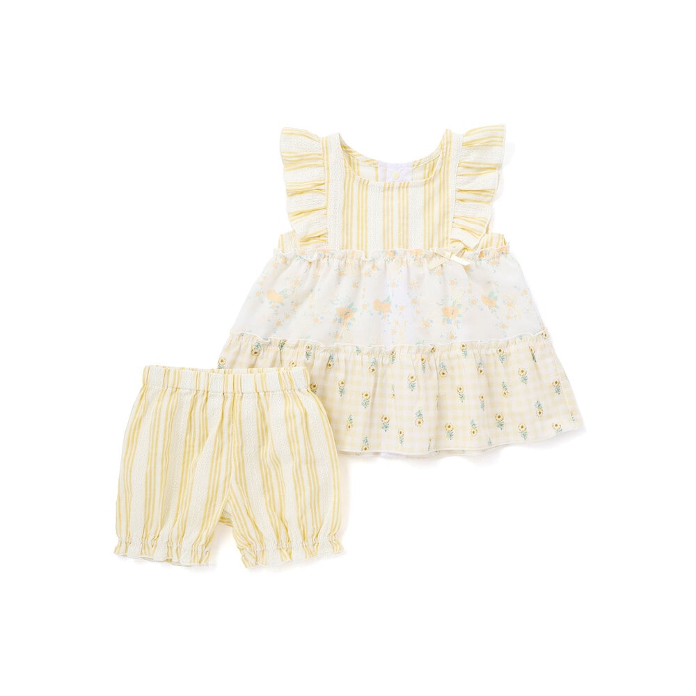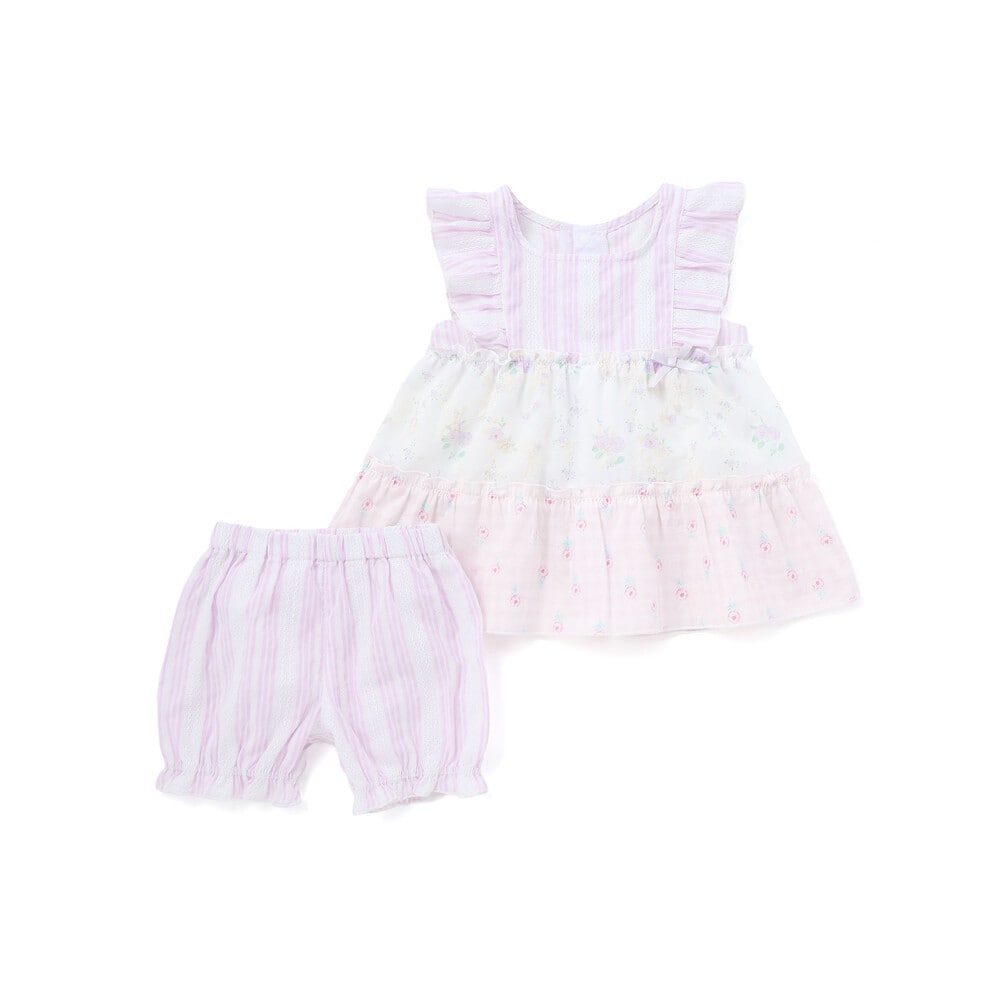 ストライプや花柄をふんわり重ねたティアードデザインがとびきり可愛い、女の子ベビー用のワンピースとブルマのセットアップ。