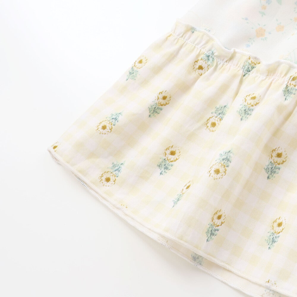 | 素材 | 【ワンピース】 (上身頃)綿100% 【スカート部分】 (上段)ポリエステル100% (下段)綿100% (リボン)ポリエステル100% (部分使)ポリエステル80% 綿20% 【ブルマ】 綿100% |