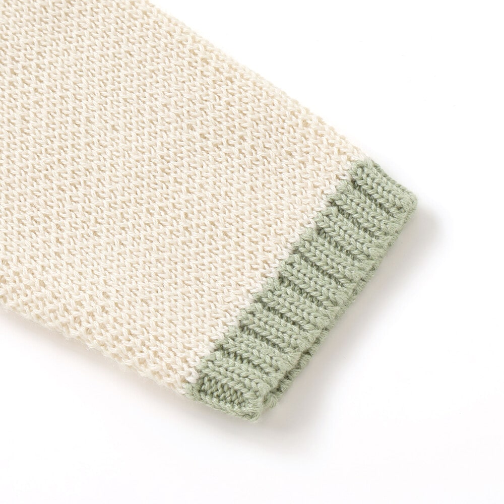 襟ぐり・袖口・裾口にはやさしいグリーンの配色を効かせ、シンプルながらもアクセントのあるデザインに仕上げました。