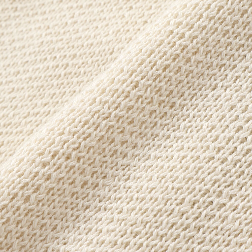 オフホワイトのやさしい1色展開で、カラフルなお洋服にも合わせやすい一枚です。