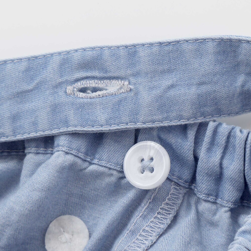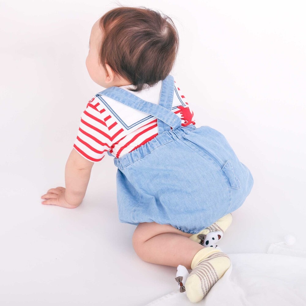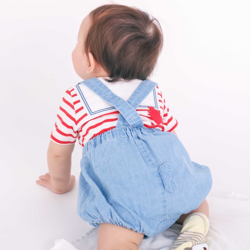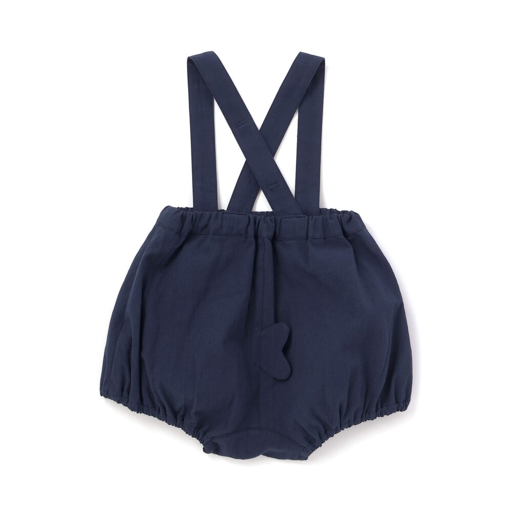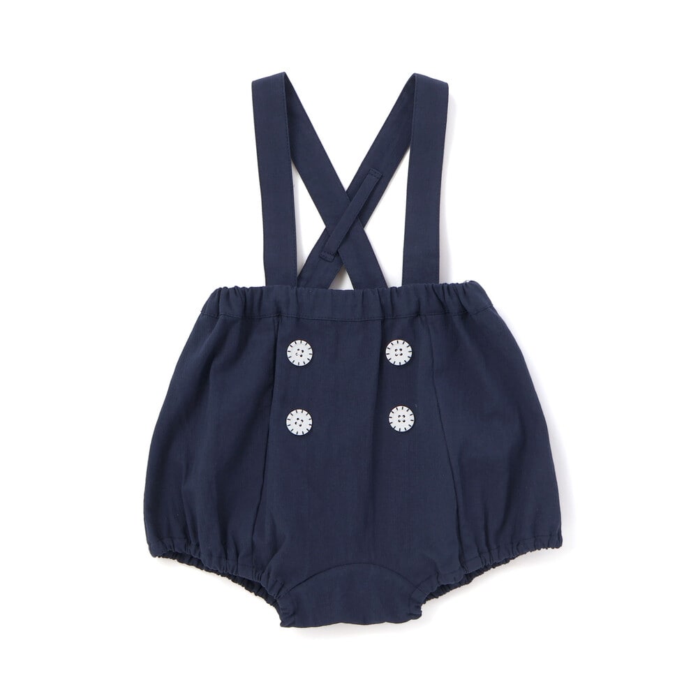マリンムードただようカラーがおしゃれな、男の子用のサスペンダー付きブルマ。